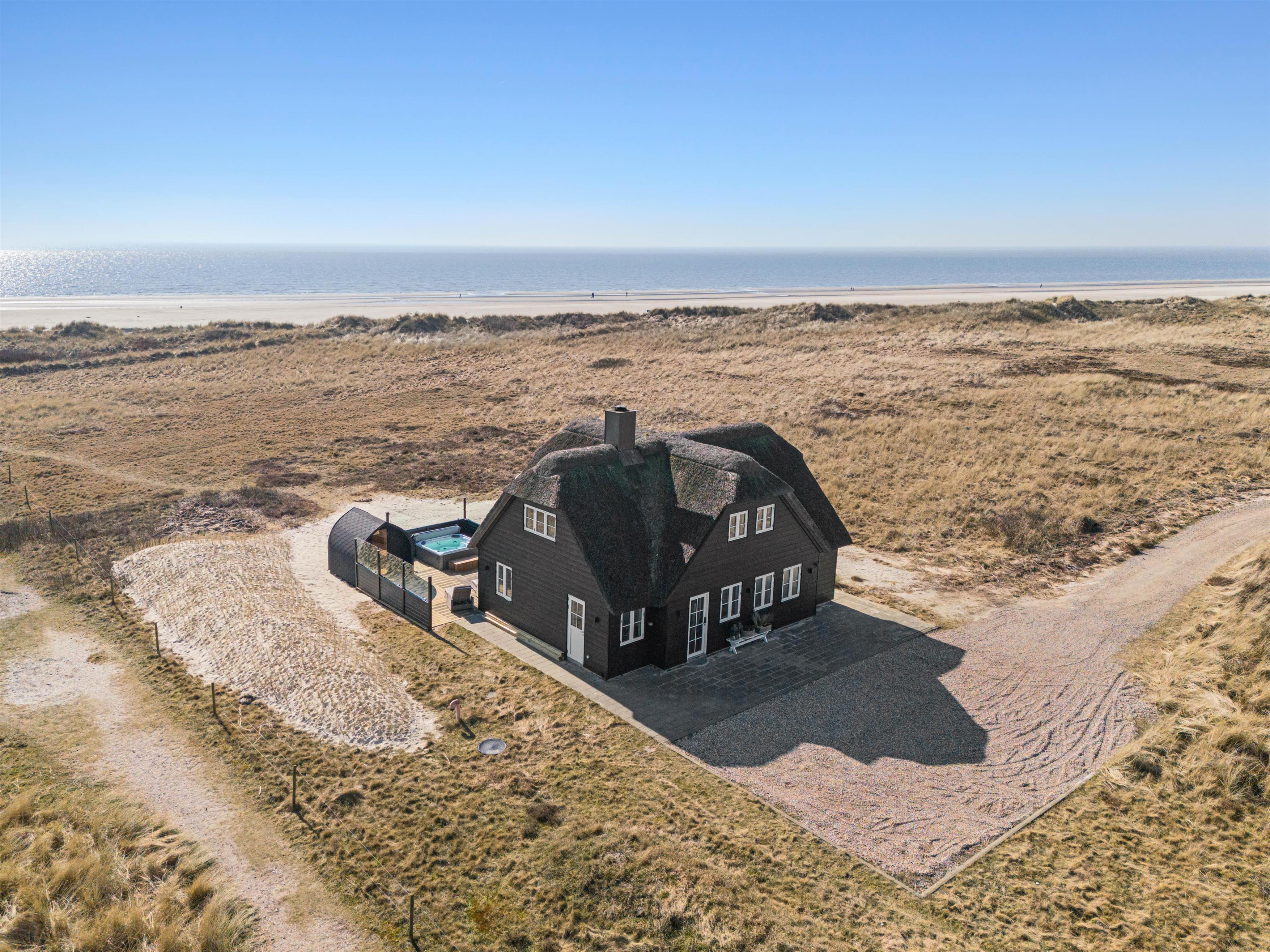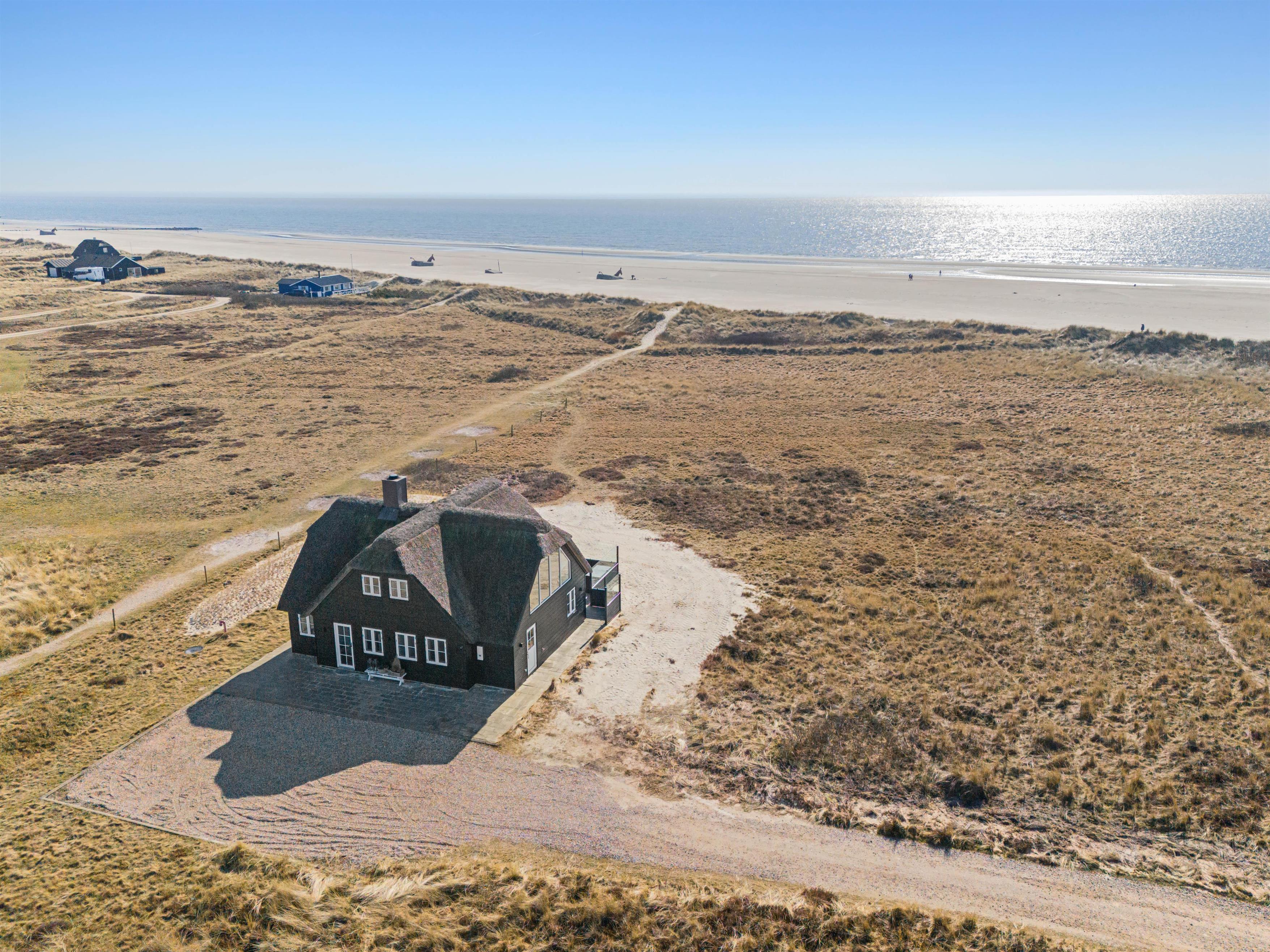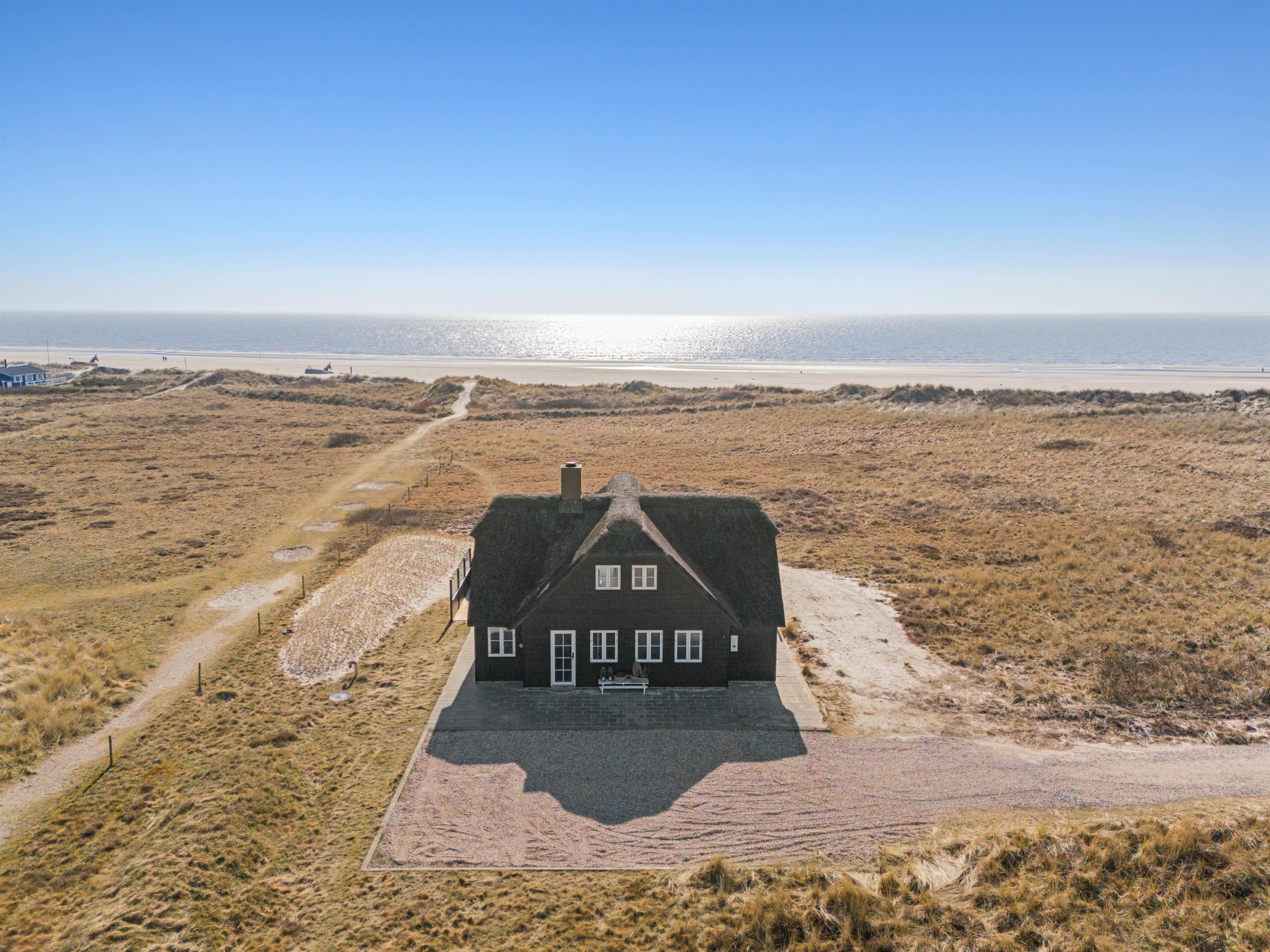 Huset på 145 m2 ligger på en klitgrund kun 25 meter fra vandkanten og giver dig især fra stuen på 1. sal de flotteste udsigter i al slags vejr ud over Vesterhavet og det ganske enestående landskab med marehalm, klitter og strand.