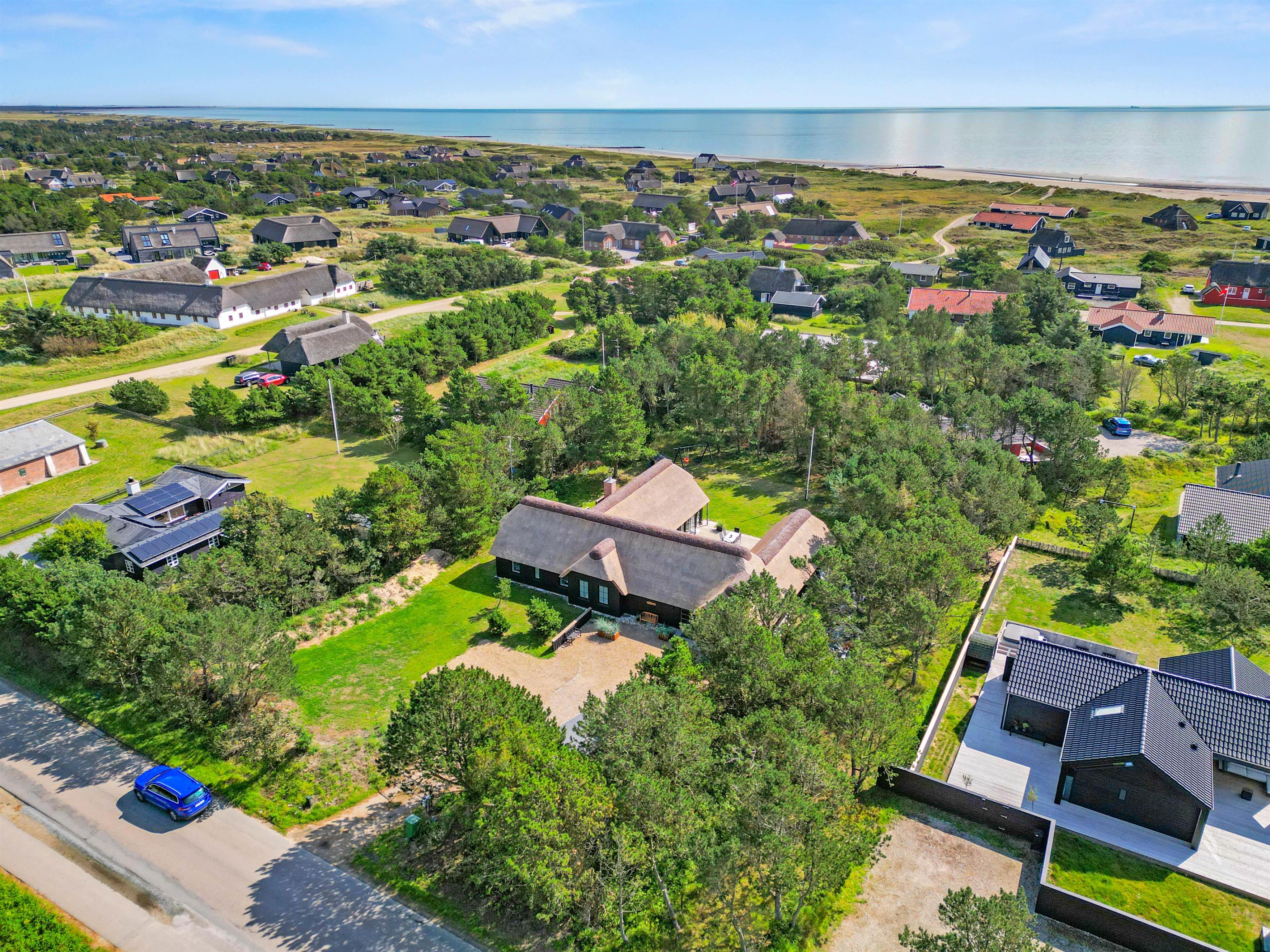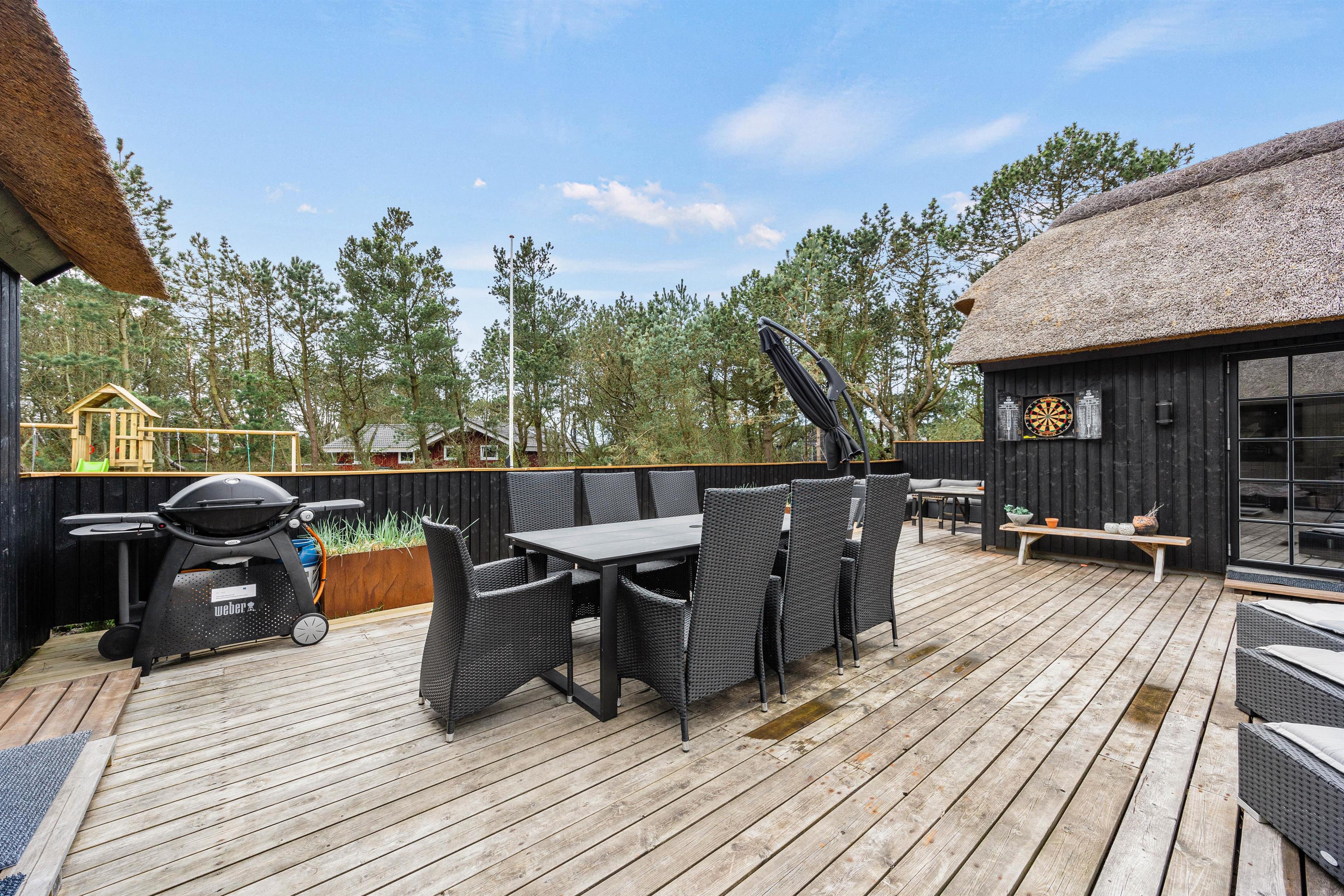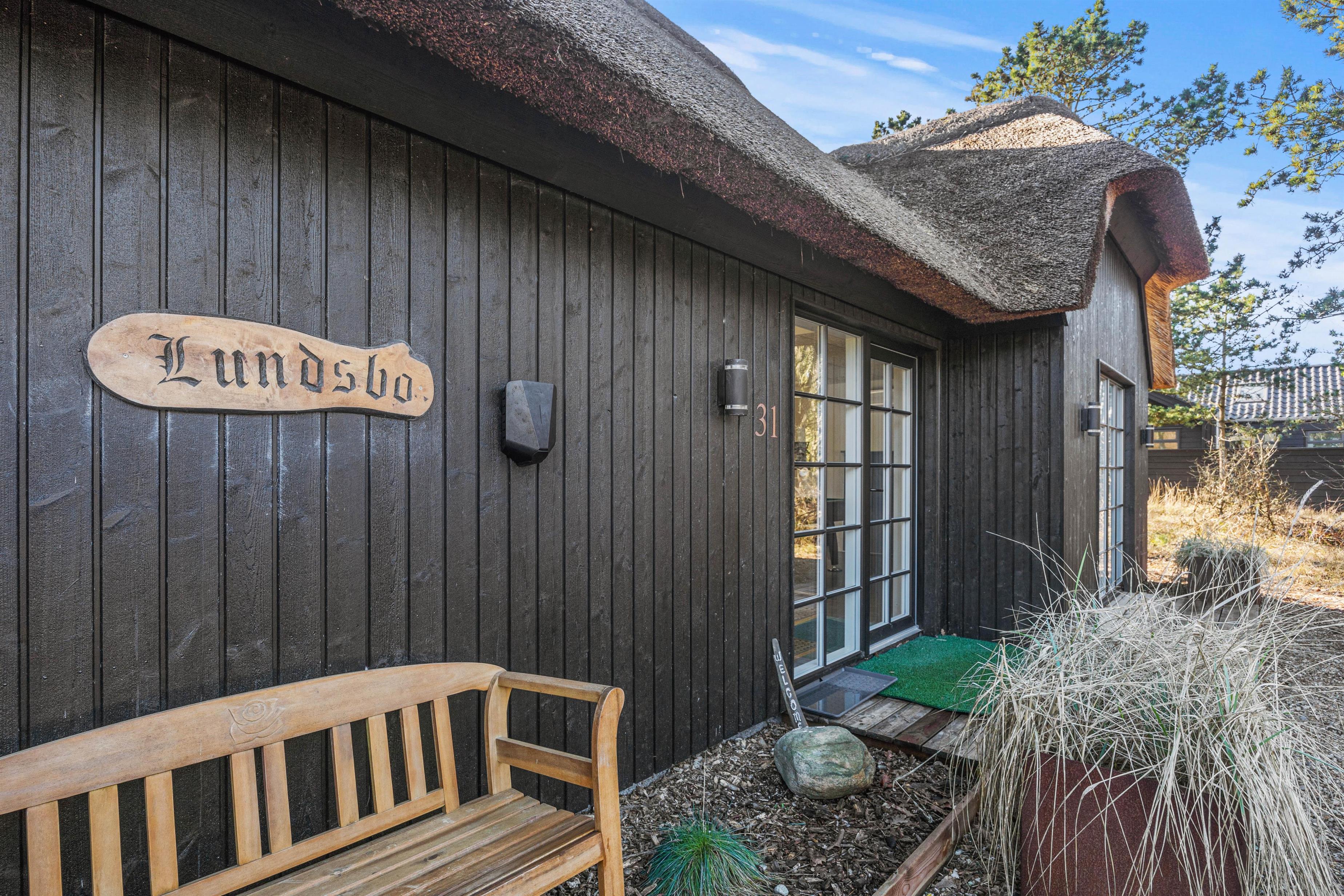 Feriehuset på Fyrvej 31 ligger godt afskærmet af høje træer og ligeledes med stakitafskærmning om terrasserne. Her kan I med fordel tilbringe en masse privat hyggetid på de to lukkede terrasser, mens børnene boltrer sig på gyngestativet eller i sandkassen. Mens børnene leger, kan I slappe af i solvogne og nyde den salte havluft og lyden af brændingen – stranden og Vesterhavet ligger nemlig blot 200 meter fra feriehuset.