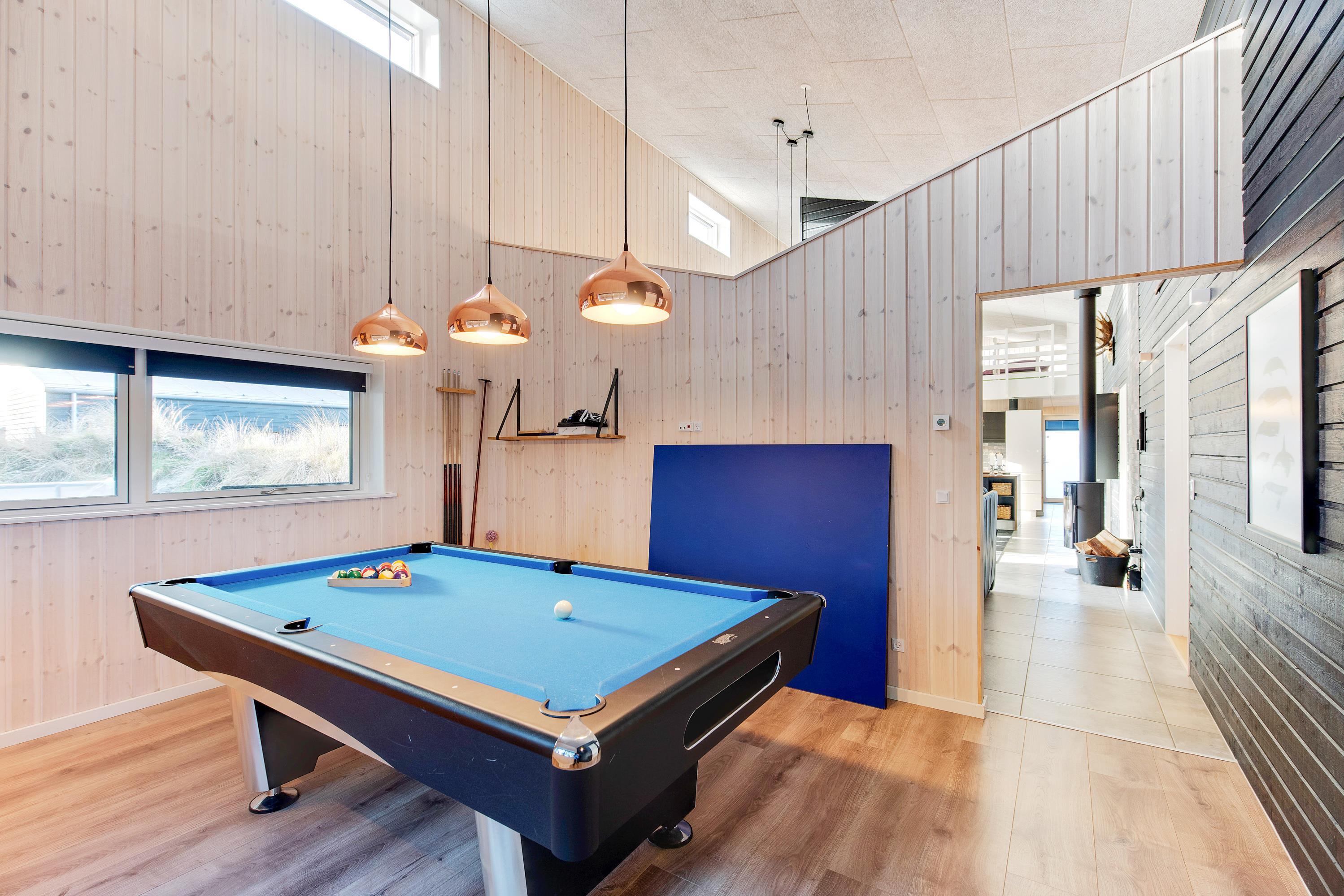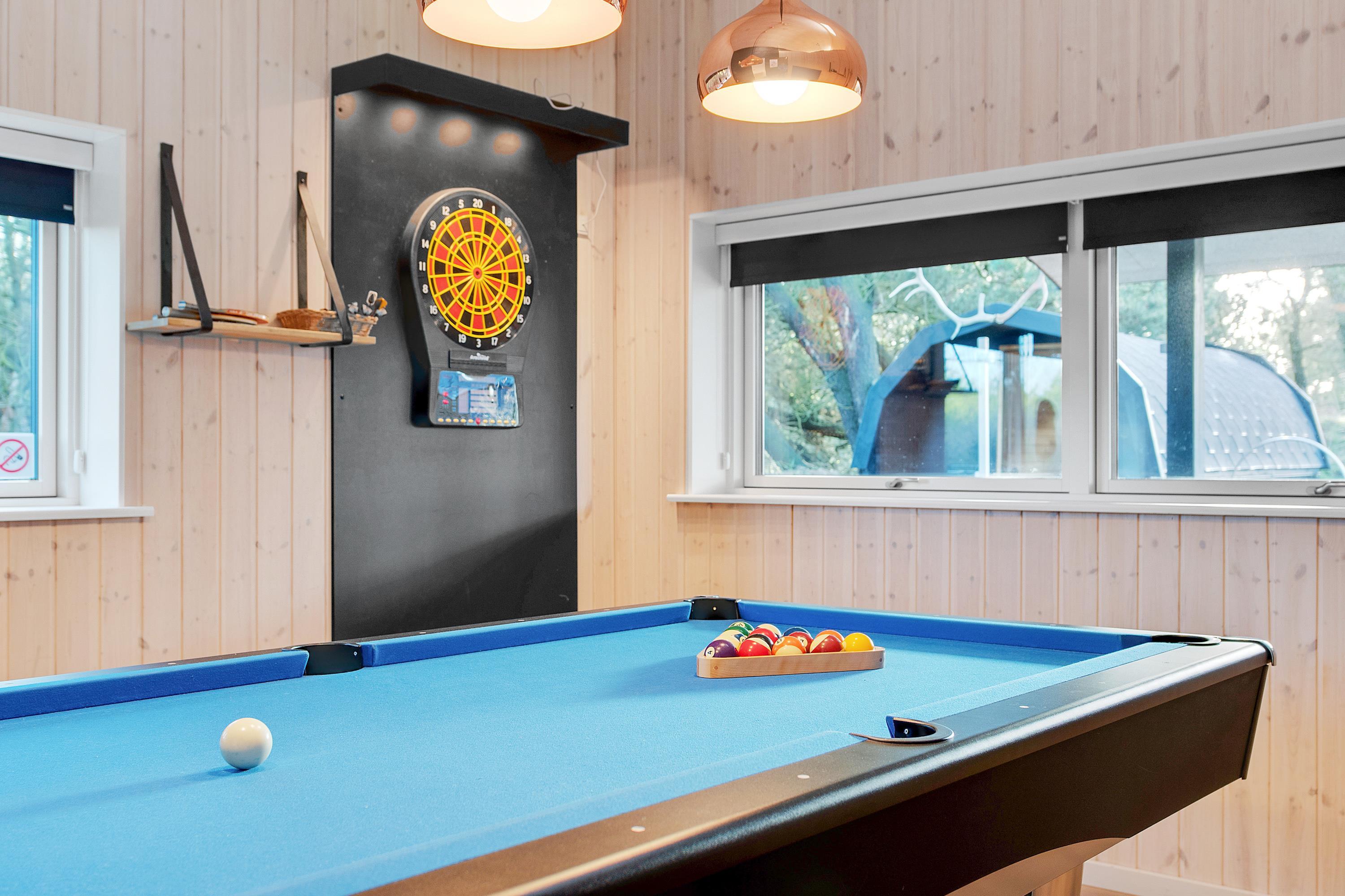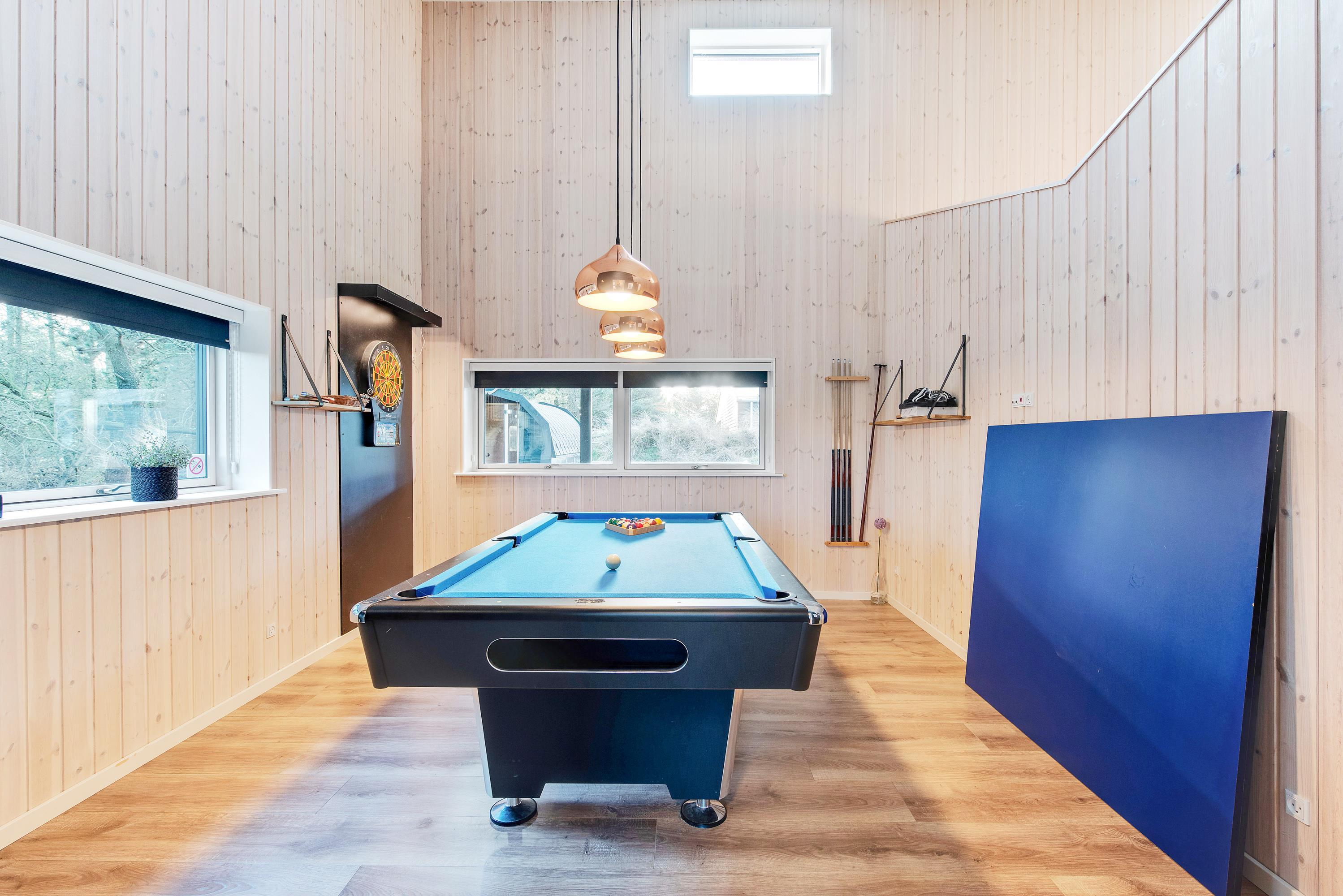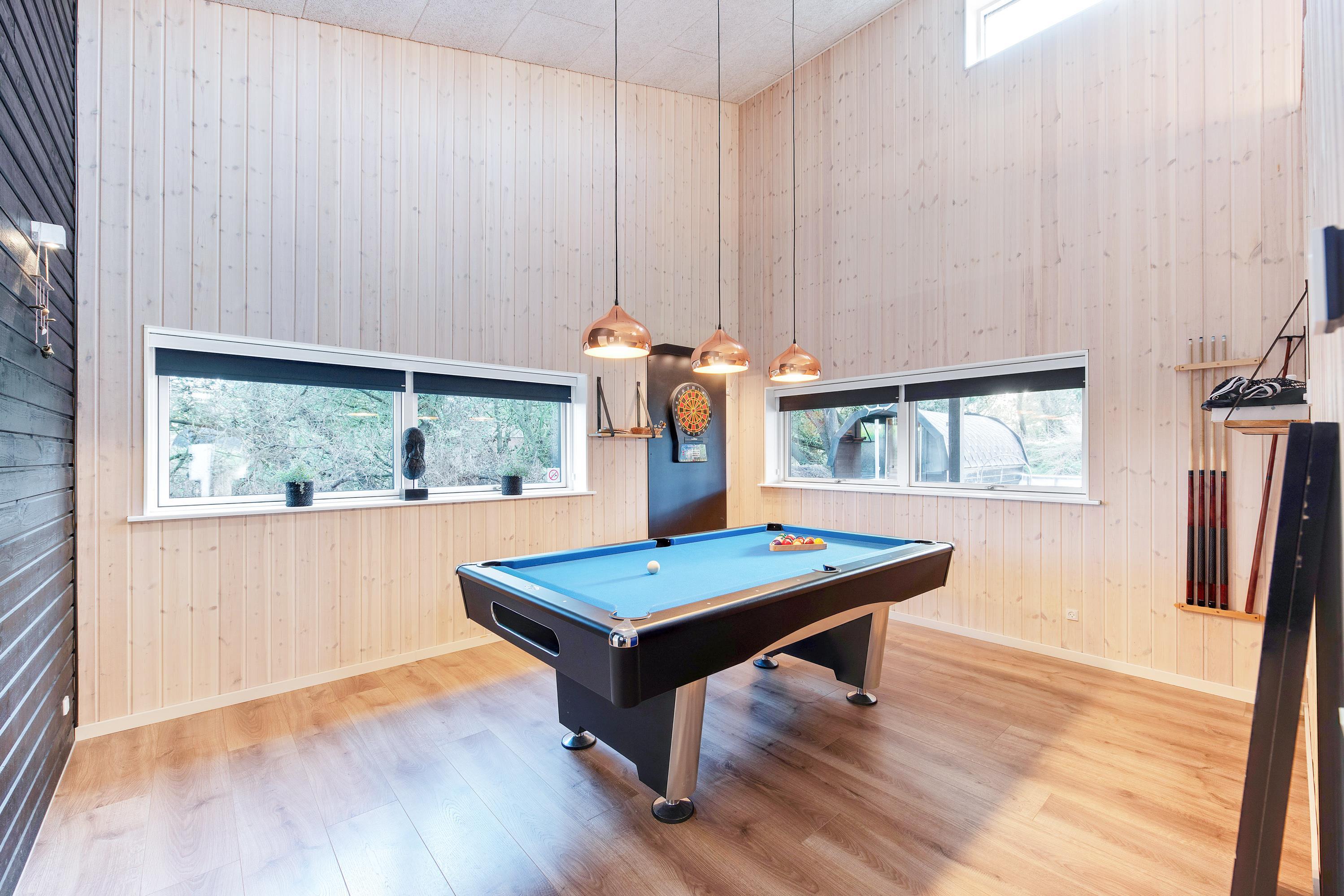 Sommerhusets hjerte er det store opholdsrum med integreret køkken og spiseafdeling. Her kan I mødes og lave god mad eller planlægge morgendagens udflugter i det hyggelige stueområde. Fra den store stue kommer I ind i aktivitetsrummet, hvor der både er mulighed for at slå sig løs med billard, bordtennis og dart.