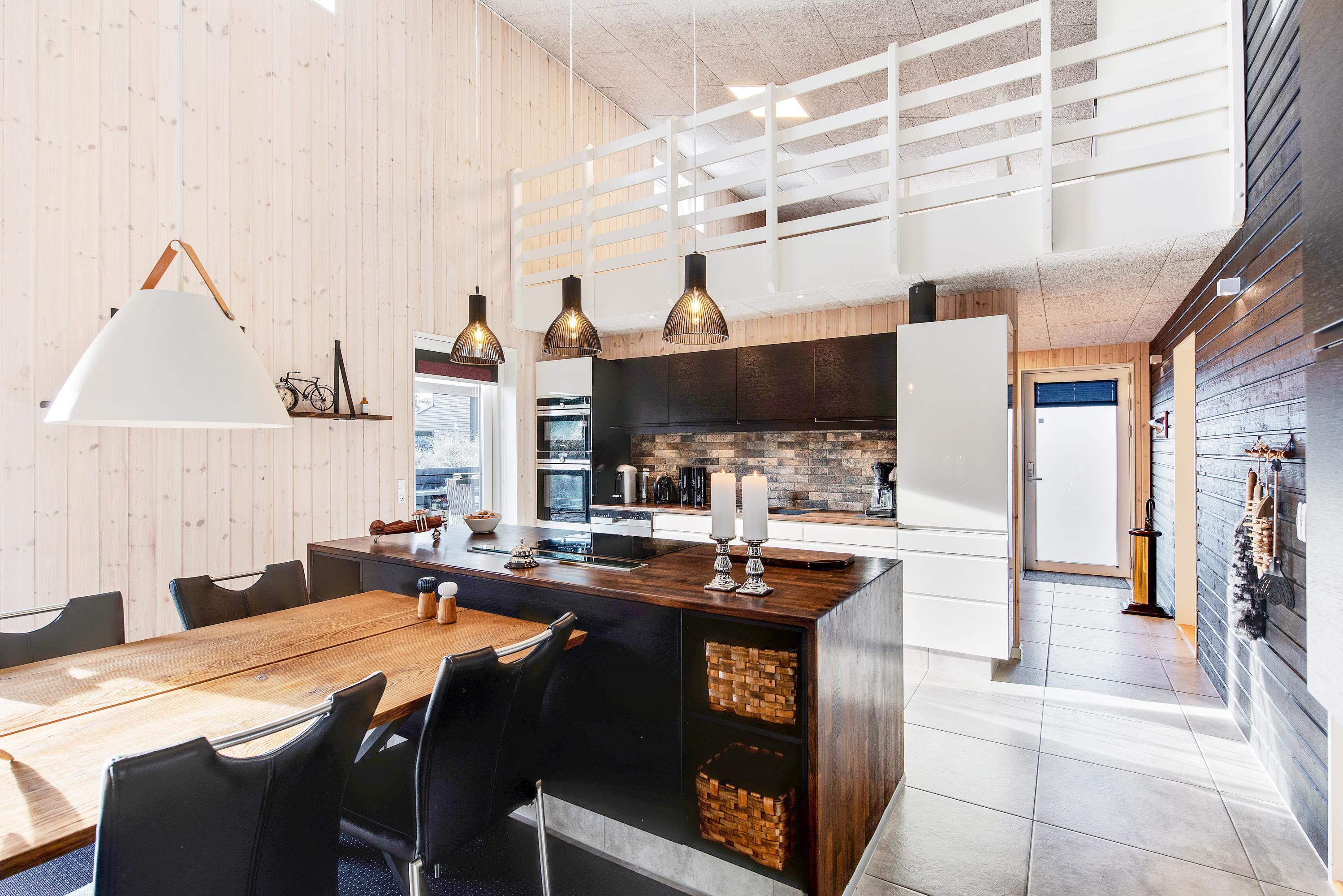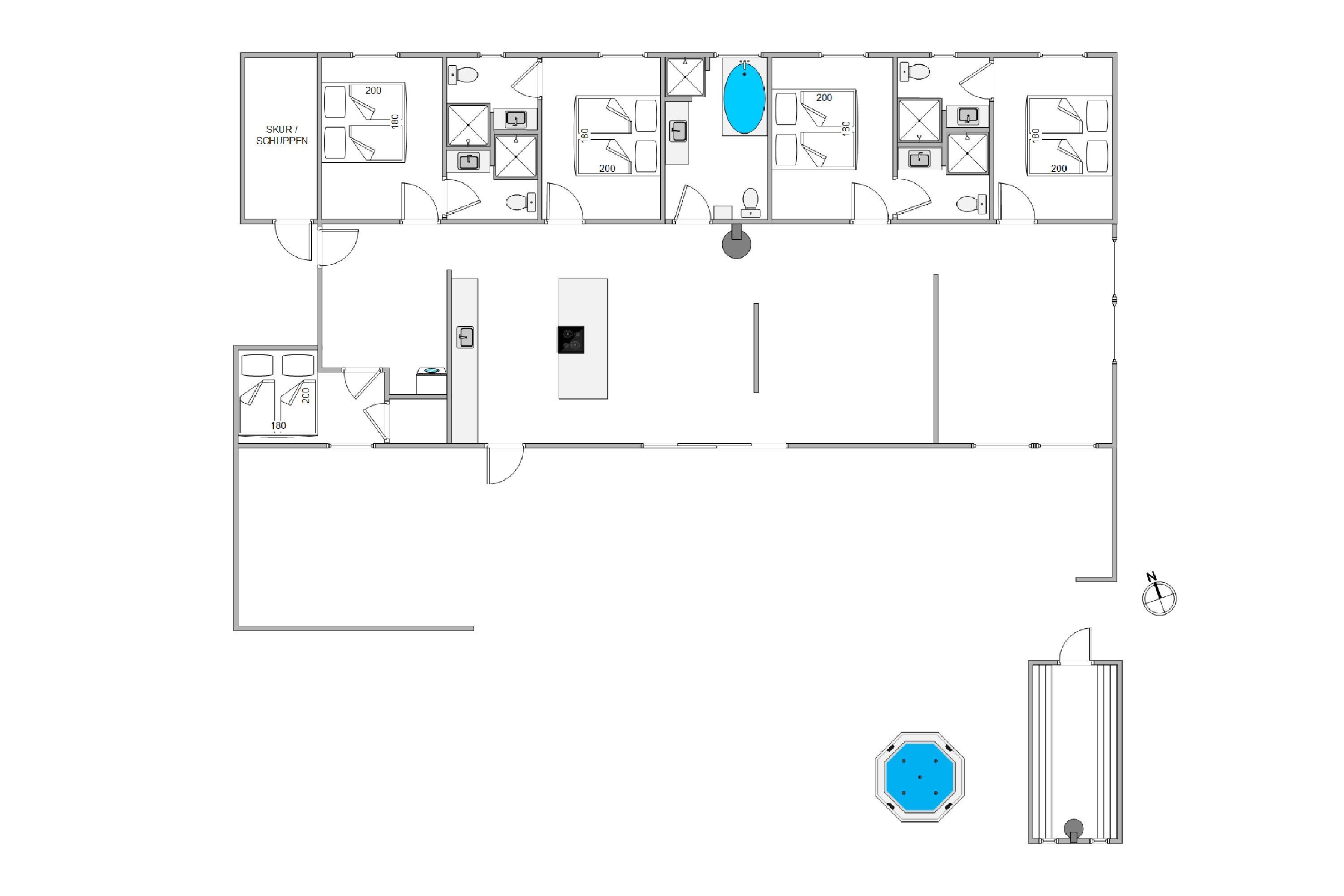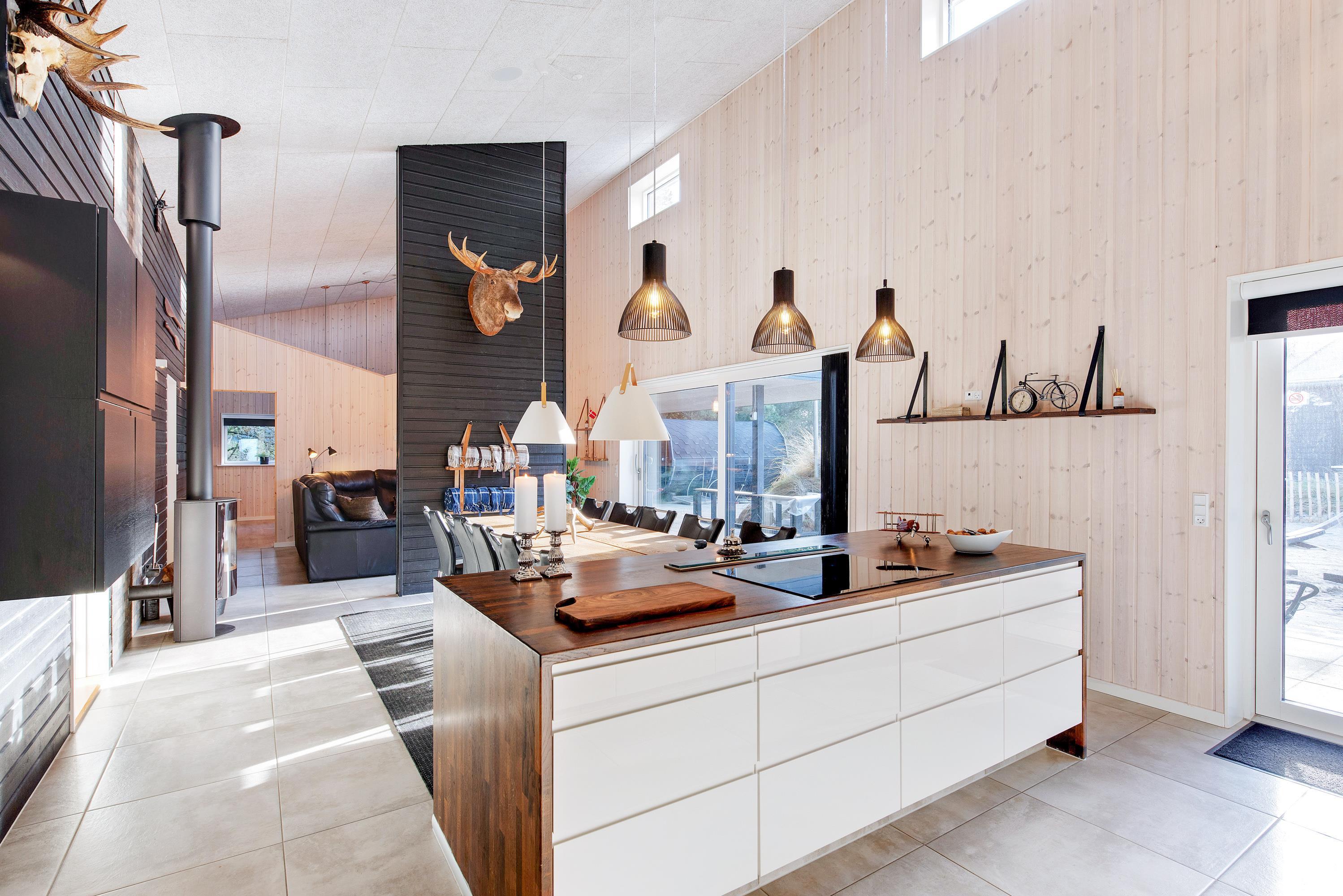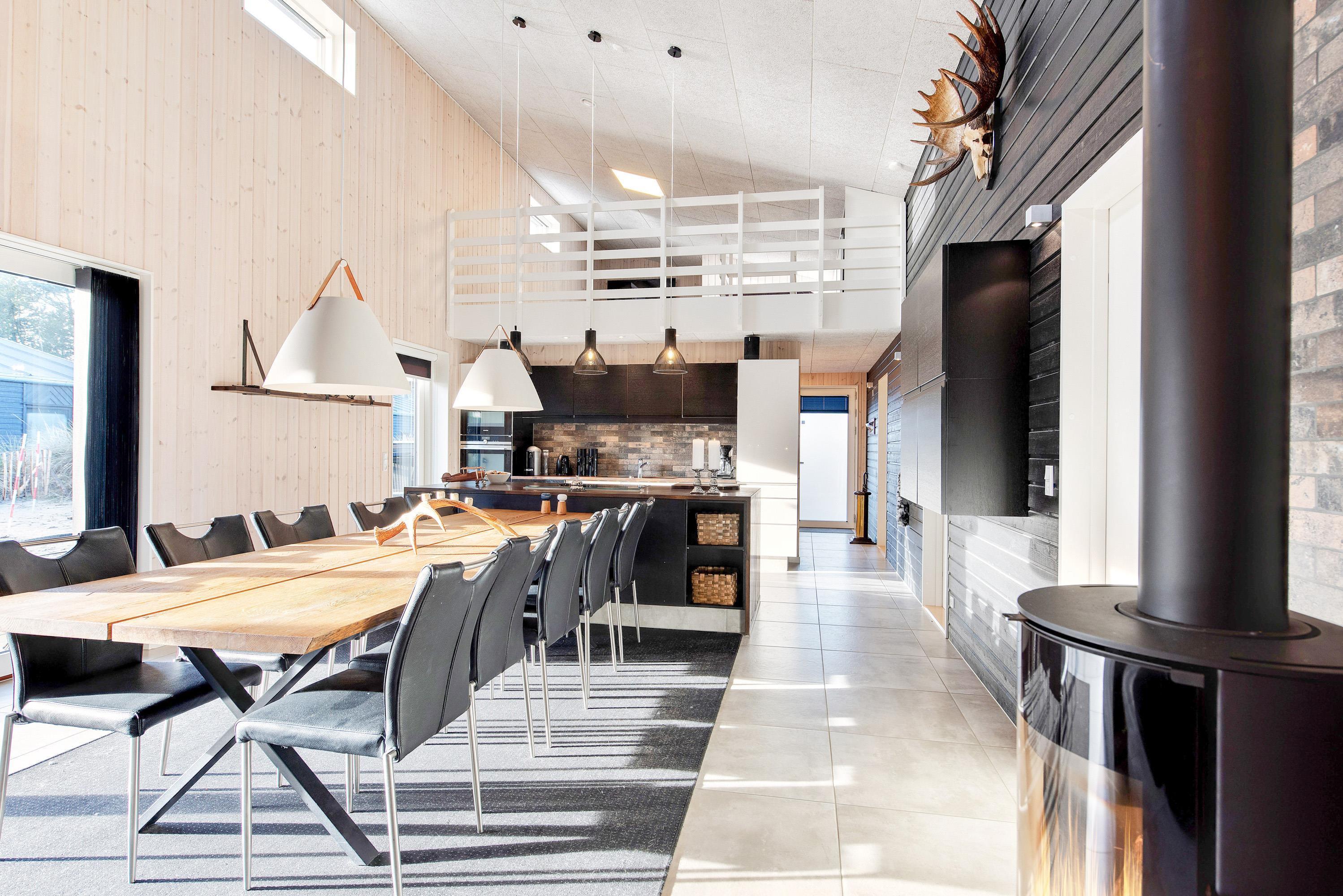 Sommerhusets hjerte er det store opholdsrum med integreret køkken og spiseafdeling. Her kan I mødes og lave god mad eller planlægge morgendagens udflugter i det hyggelige stueområde. Fra den store stue kommer I ind i aktivitetsrummet, hvor der både er mulighed for at slå sig løs med billard, bordtennis og dart.
