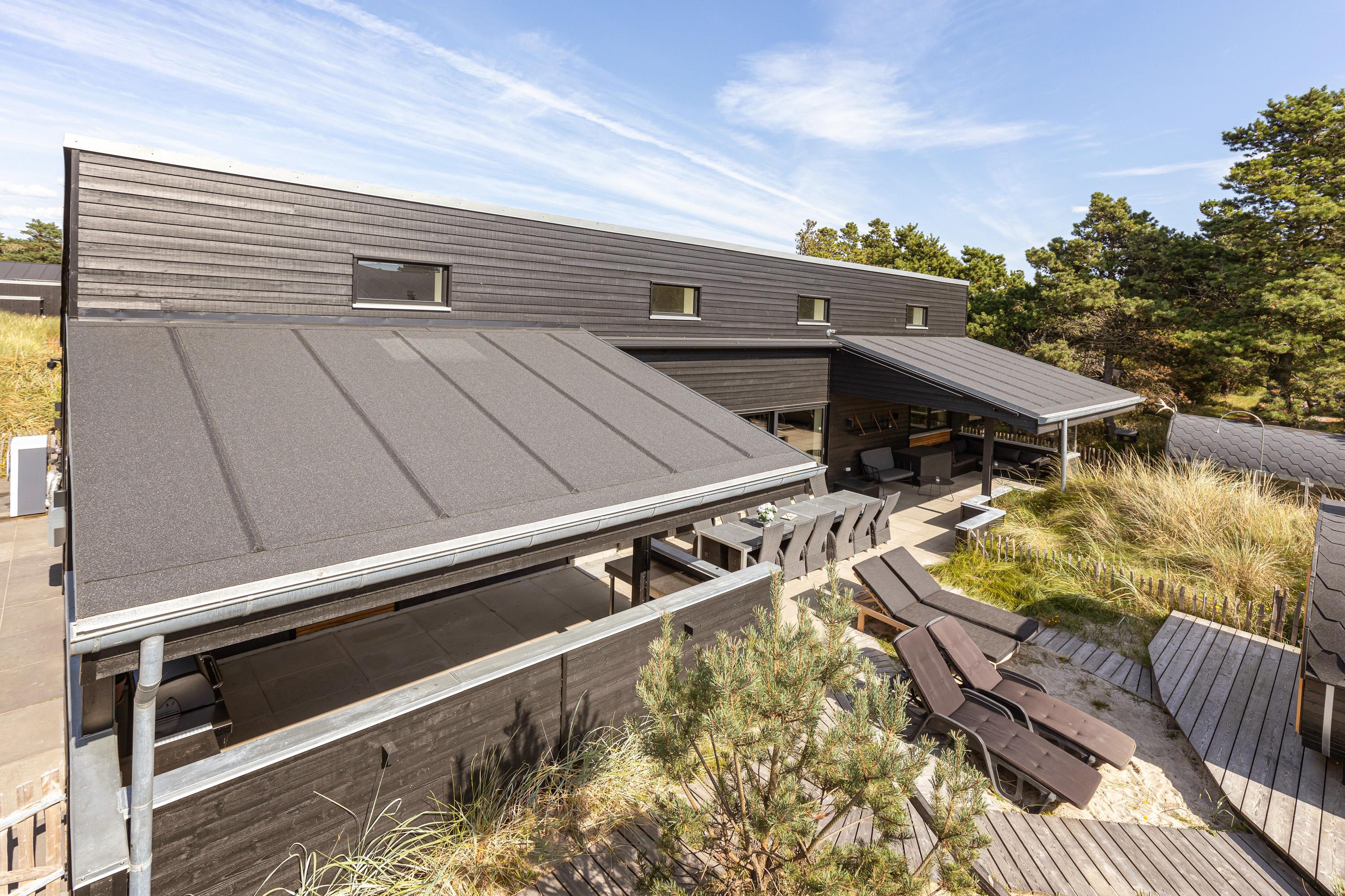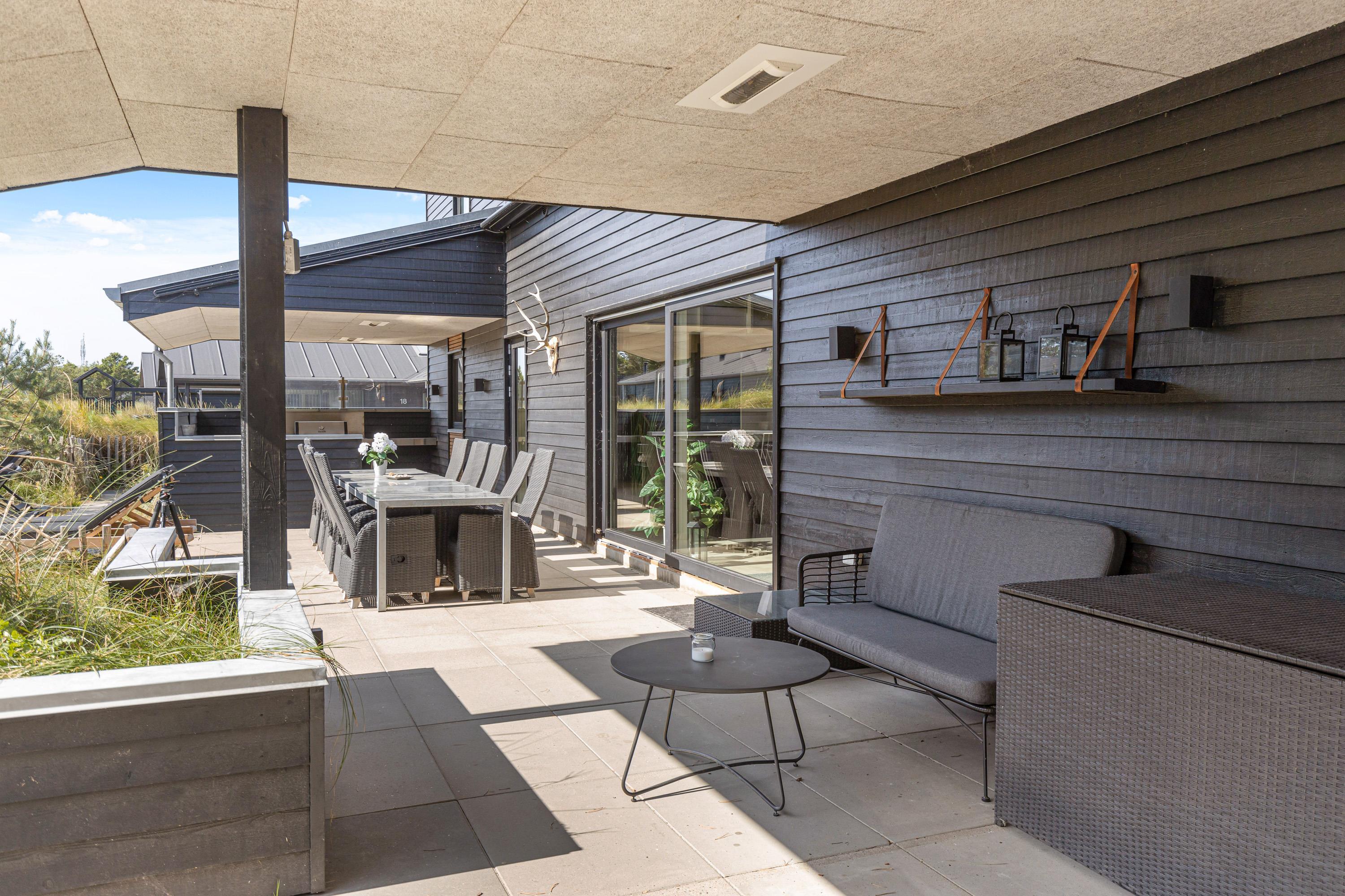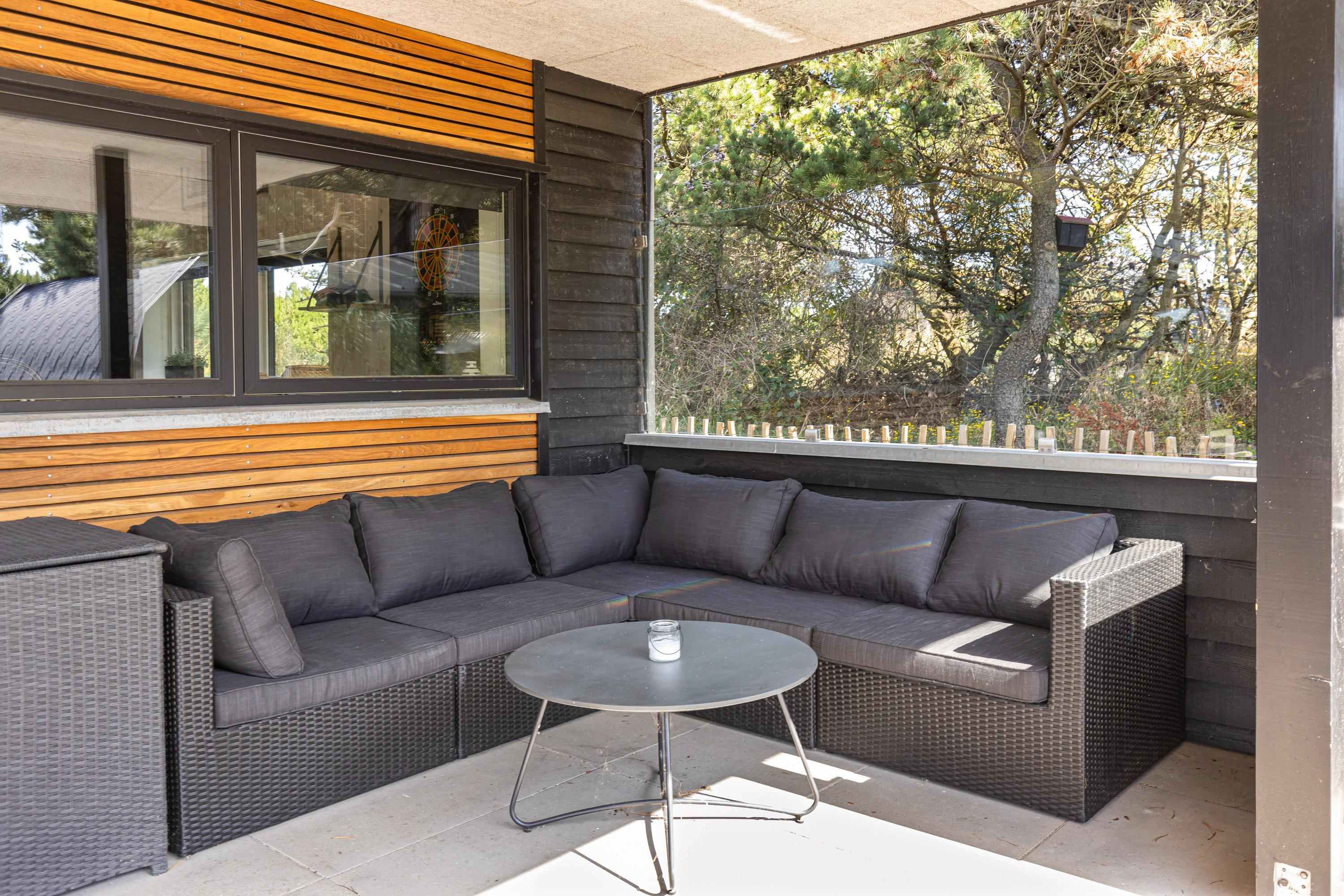 Det er ikke kun indvendigt, sommerhuset byder på luksuriøse omgivelser. Også i uderummet er der lagt vægt på, at I ikke skal mangle noget som helst. Den store terrasse har både en overdækket, afskærmet og åben del og er udstyret med lækre loungemøbler som indbyder til hyggeligt samvær på lune sommeraftener.