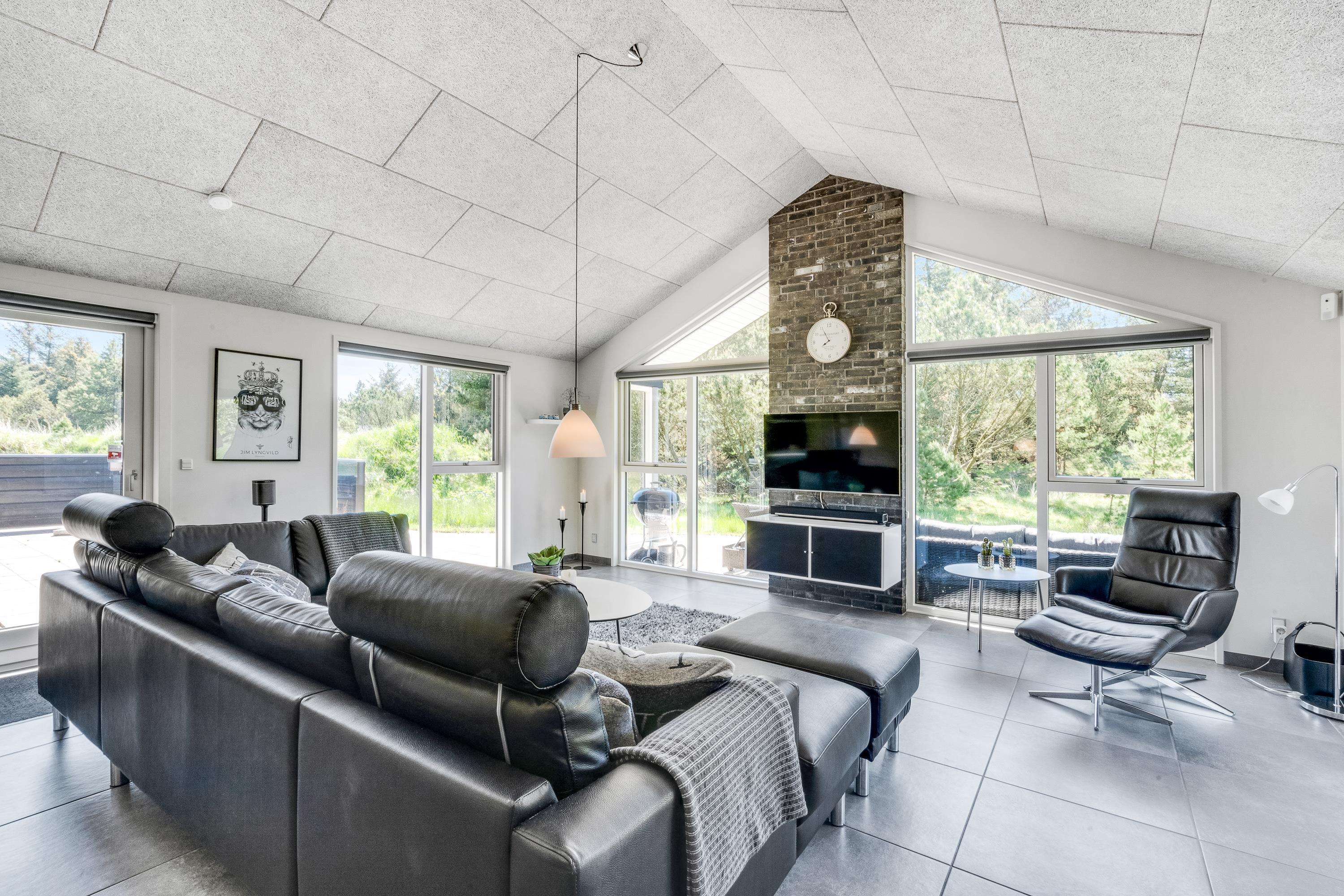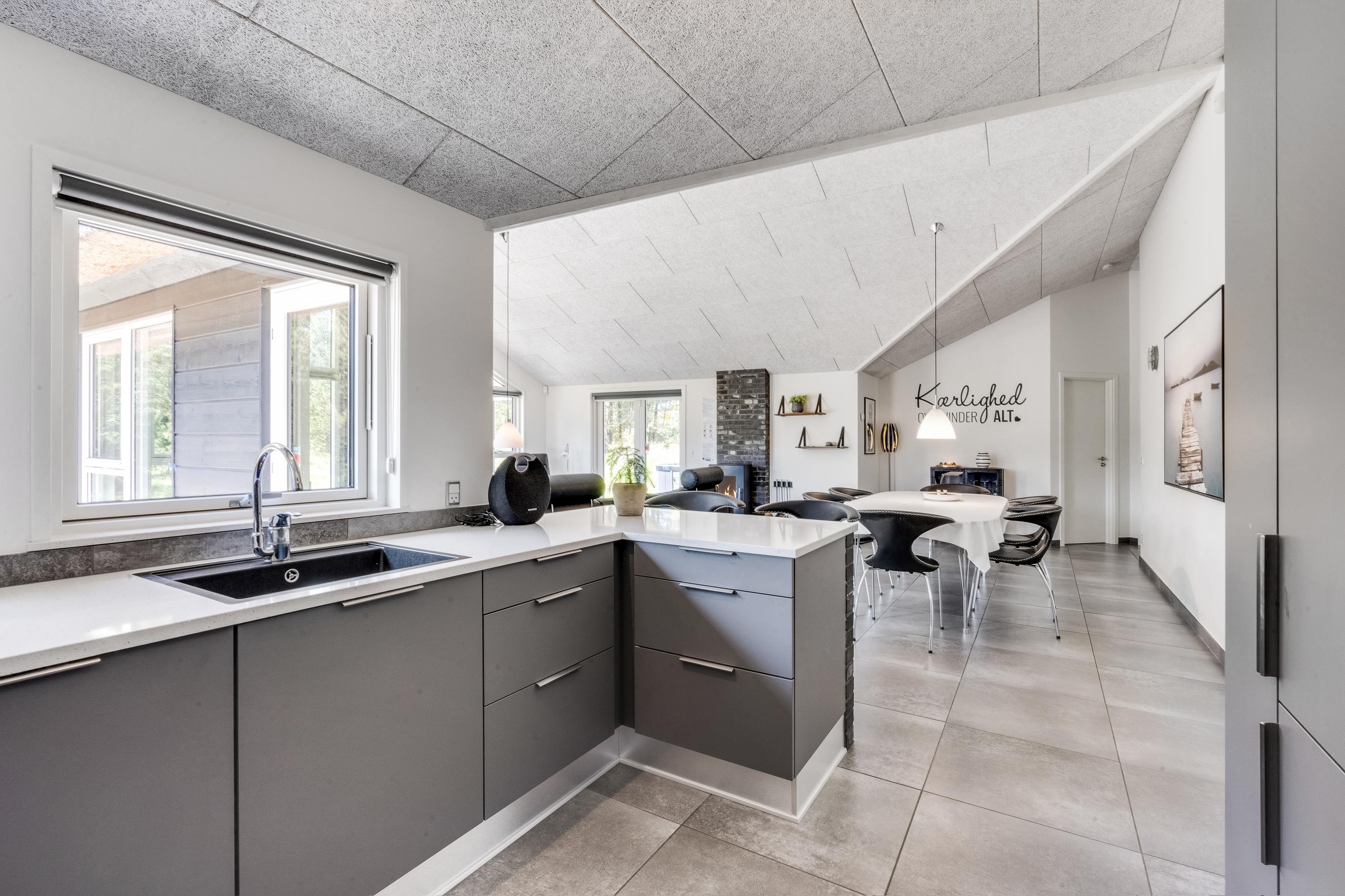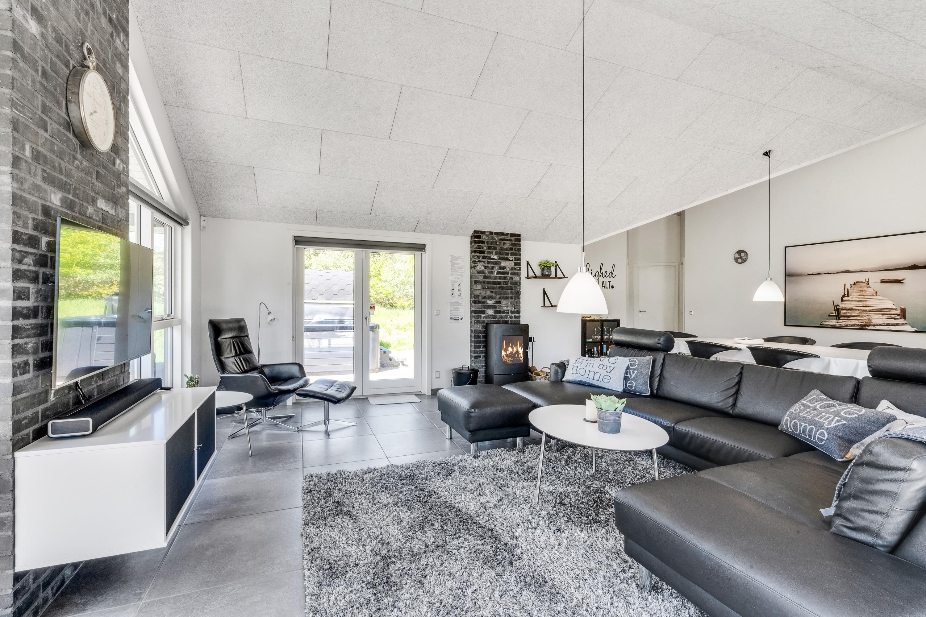 Feriehusets hjerte er det store rummelige køkkenalrum, som indbyder til mange timers hygge og samvær for hele familien. Feriehuset er på en og samme tid moderne og hyggeligt indrettet – med nordisk stil og en klassisk sommerhusstemning. Hyg jer med et brætspil ved spisebordet, mens familiens kok tilbereder delikat mad i det yderst veludstyrede køkken, eller se en god film på fjernsynet, mens brændeovnen knitrer i baggrunden.
