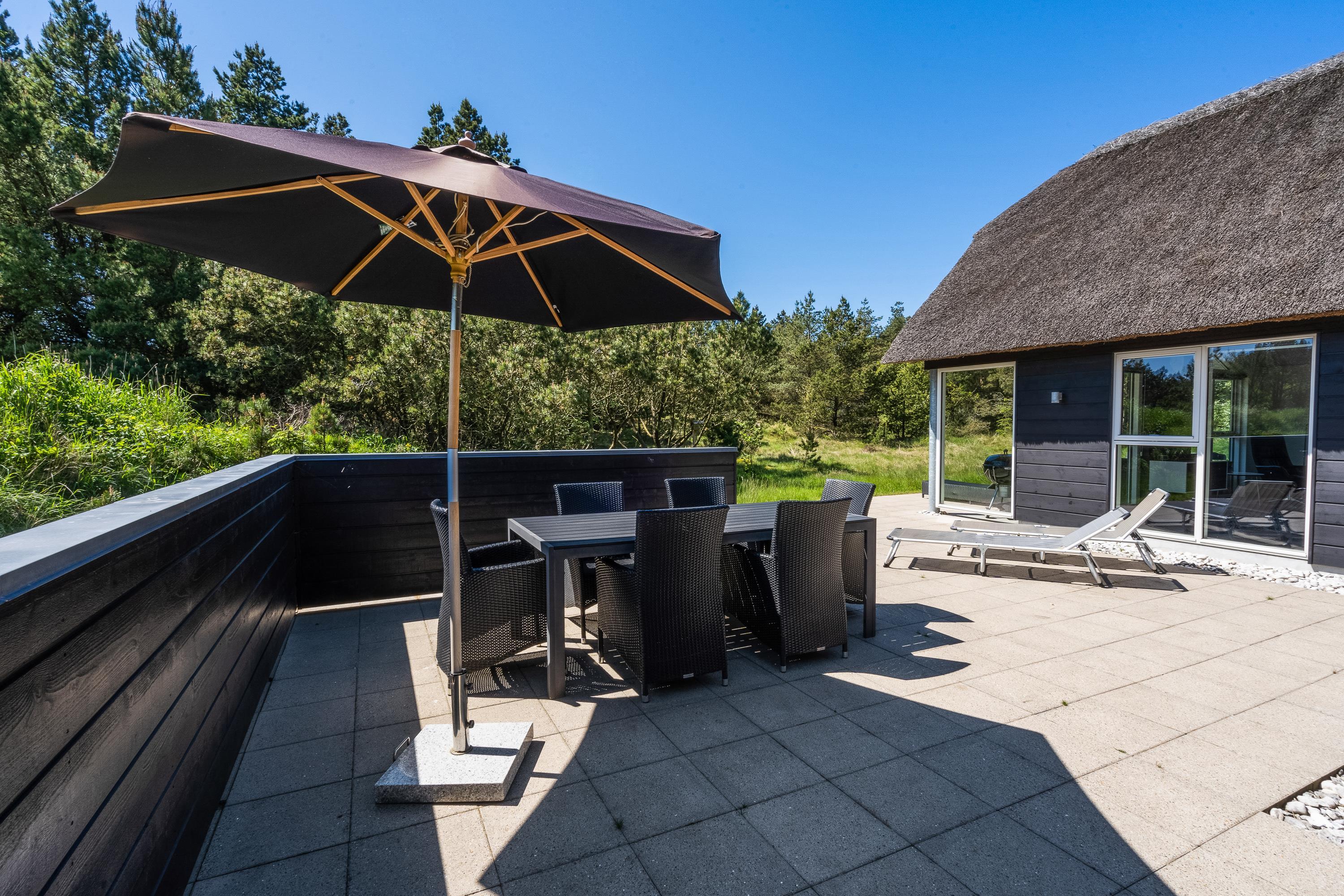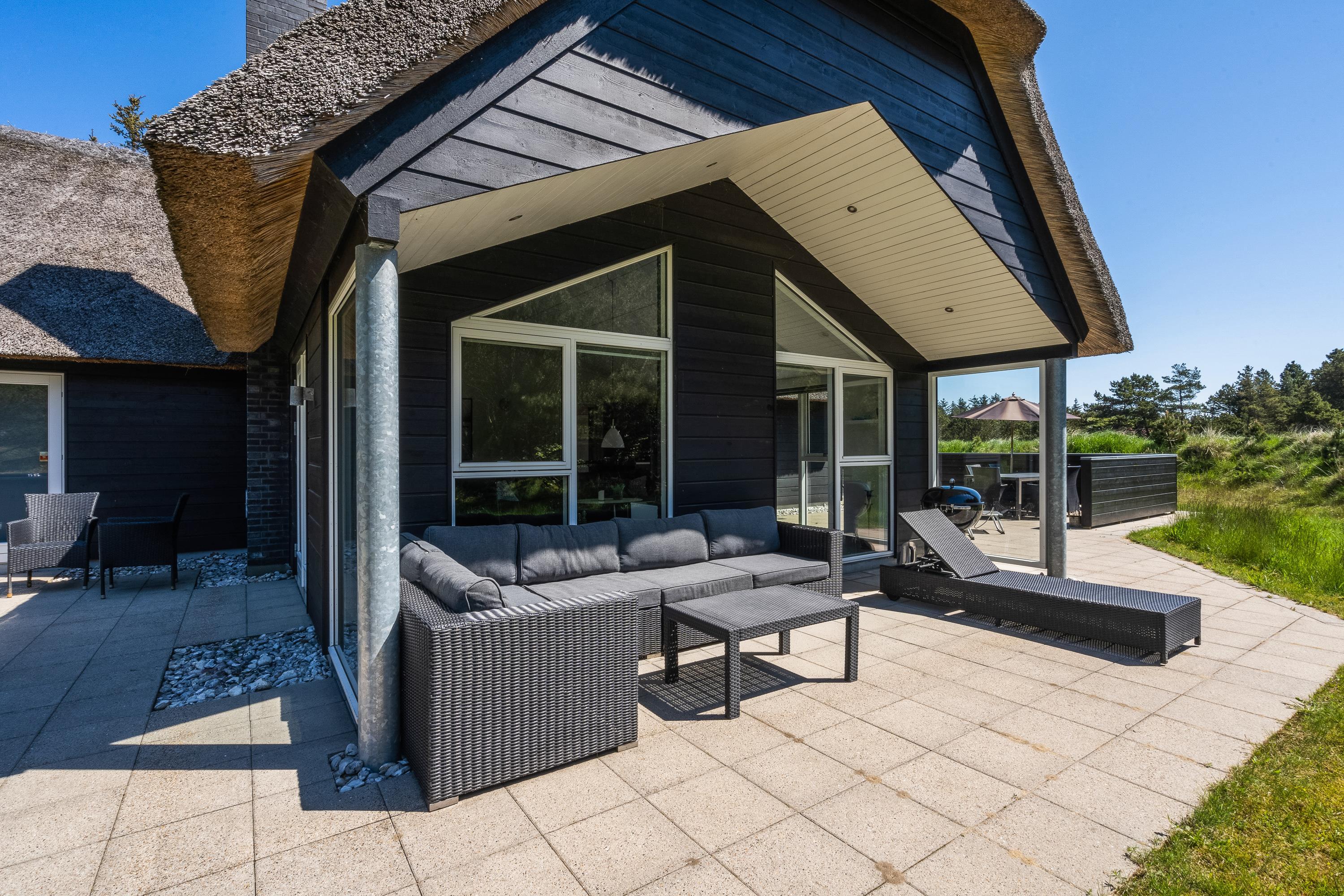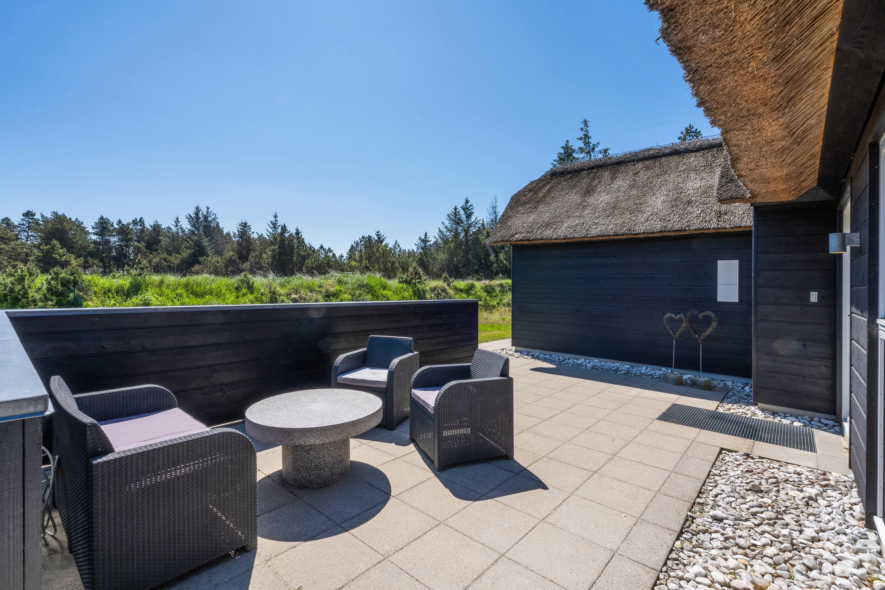 På solrige sommerdage er feriehusets skønne terrasse det mest foretrukne sted at opholde sig. Nyd morgenkaffen i den friske vesterhavsluft, snup en eftermiddagslur i loungesofaen eller indtag aftensmaden frisk fra grillen med fuglefløjt i baggrunden. Uanset tidspunktet er der altid et sted på terrassen, hvor I kan opholde jer. Terrassen er udstyret med gode komfortable havemøbler, liggestole og grill.