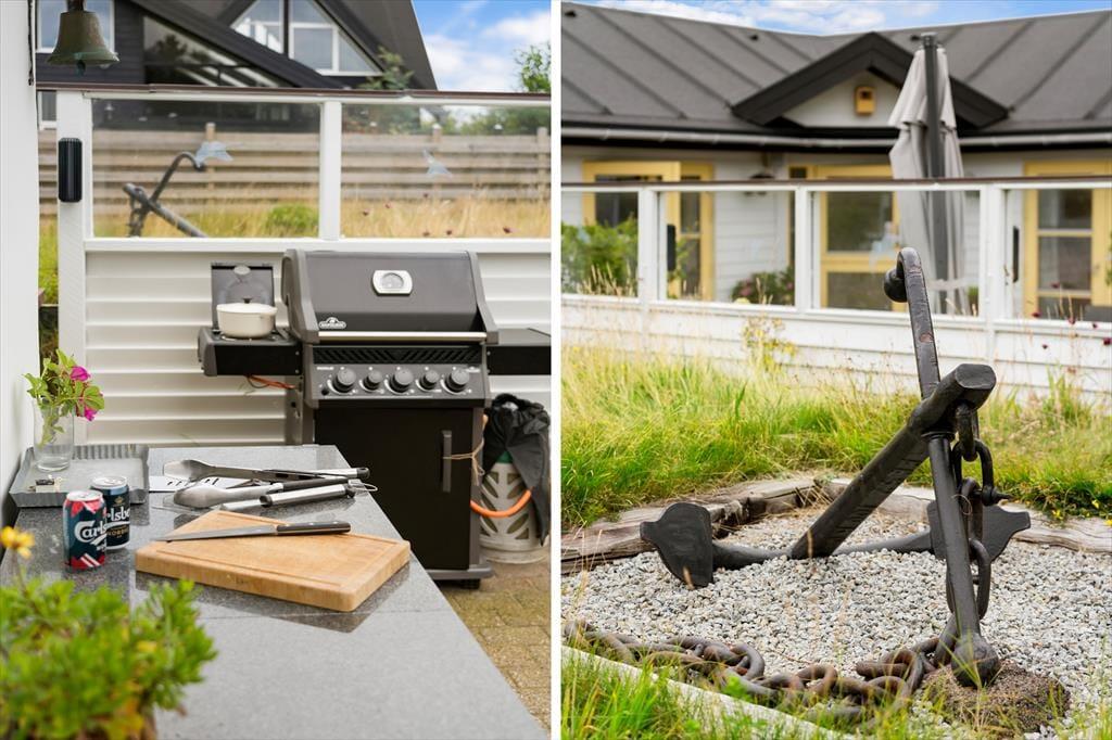 Den 1440 m2 store naturgrund er et herligt sted at nyde sol og sommerliv. Der er flere gode terrasser at vælge imellem, inklusiv et godt afskærmet område, der nærmeste minder om en solgård. Havemøbler, liggestole og en parasol er til rådighed, og hvis I vil kokkerere under åben himmel, kan I ikke bare benytte grillen, men også det udendørs køkken.