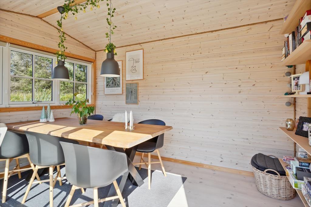 Sommerhuset måler 65 m2, og det egner sig især godt til ferier og fridage for et eller to par. Huset er indrettet med 3 værelser, hvoraf 2 indeholder dobbeltsenge og i det sidste er der en enkeltseng (120 cm). Et lyst badeværelse med bruseniche og gulvvarme ligger lige ved fordelingsgangen, og hvis I er på udkig efter vaskefaciliteterne, er der både vaskemaskine og tørretumbler i udhuset. I det åbne køkken får I en både hyggelig og funktionel ramme om madlavningen, og de færdige måltider kan serveres lige ved siden af ved spisepladsen. Når I har spist, er det måske tid til at rykke over i sofaen, der står tæt på brændeovnen – og lige ved det store, sydvendte vinduesparti, der giver jer udsyn til den fri natur. Udsigten er tilsvarende god, når I hygger jer i annekset med brætspil eller hyggesnak til langt ud på aftenen.