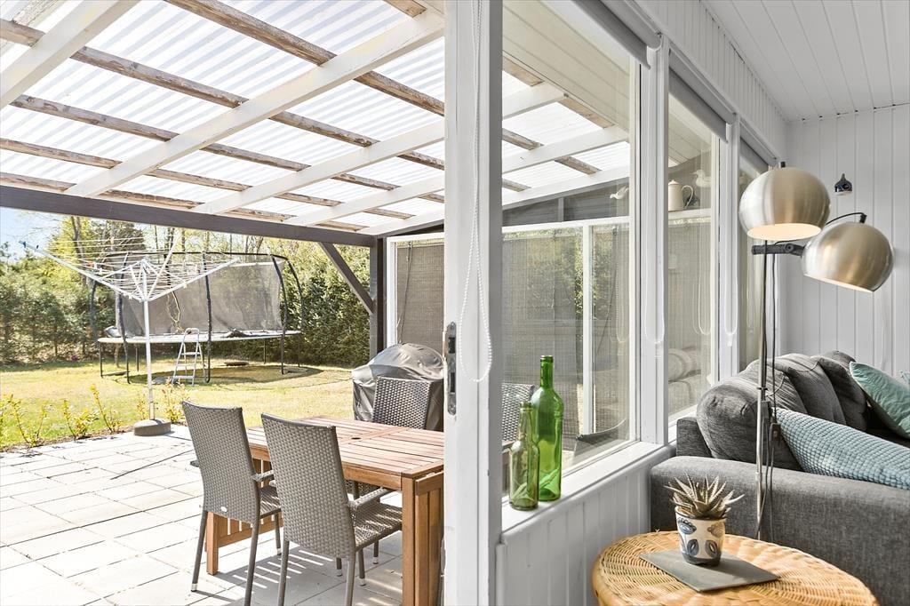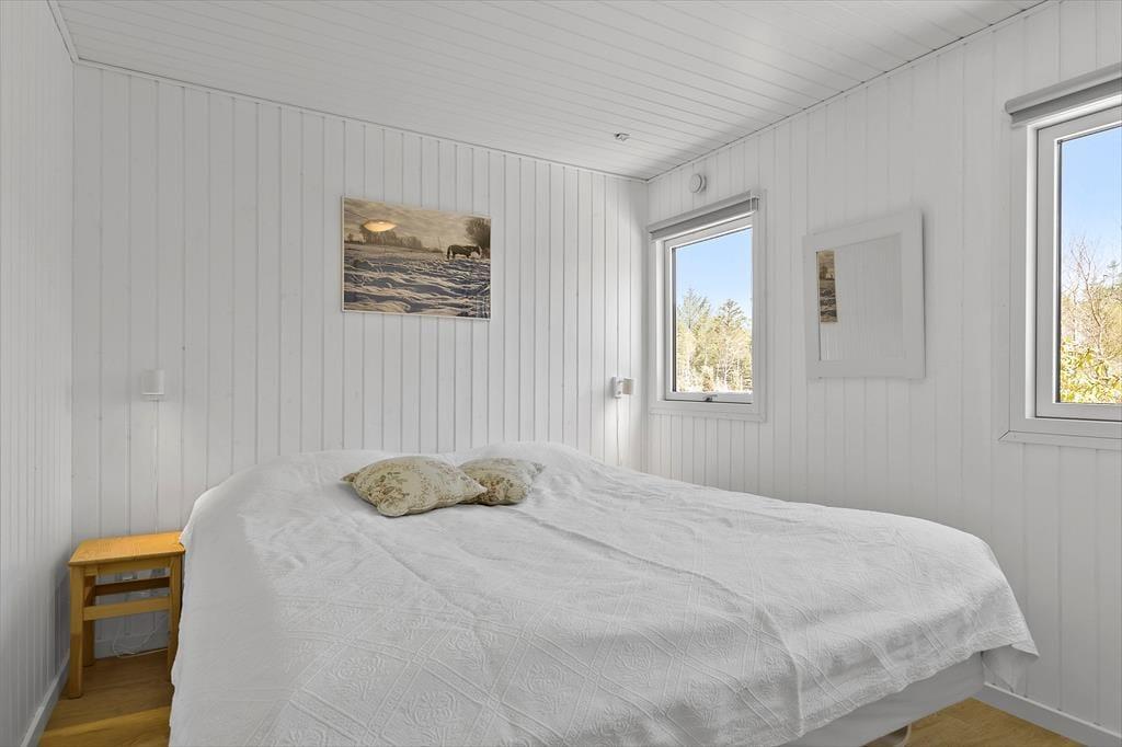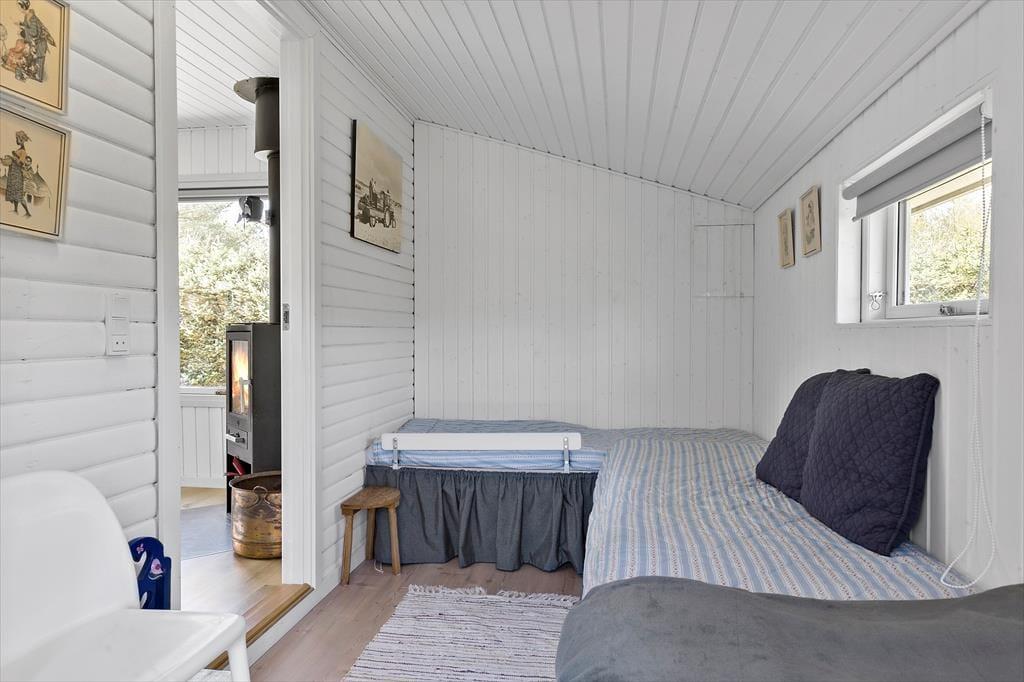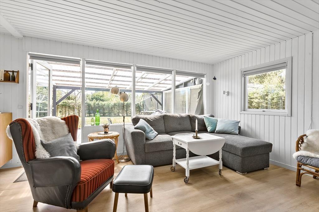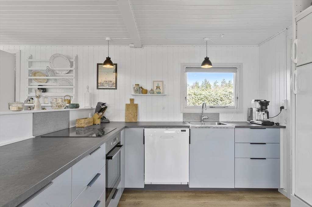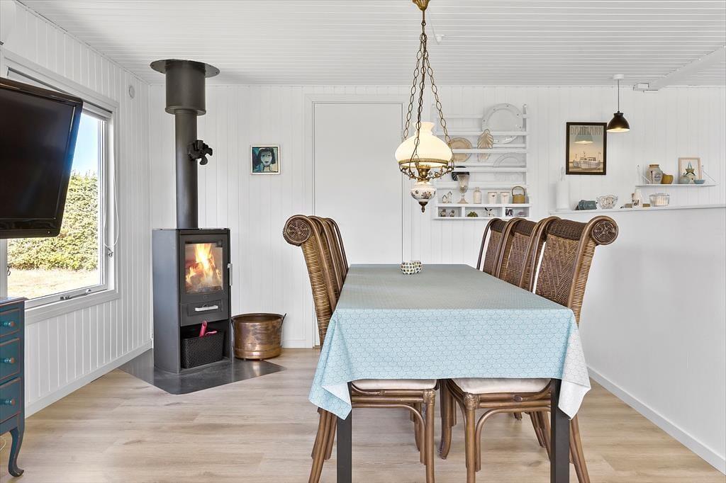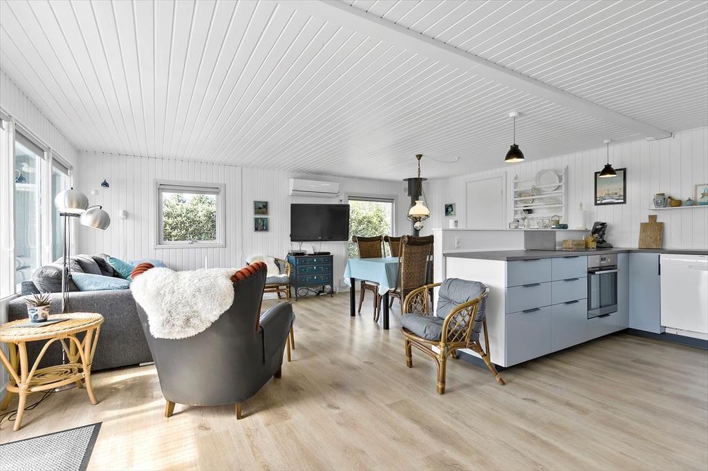 Lægger vejret op til indendørs feriehygge, kan I se frem til at tilbringe tiden i sommerhusets dejlige opholdsrum. Her har I et moderne åbent køkken at kokkerere i, og når måltidet står klar, kan I samles ved spisebordet nær brændeovnen. Trænger I til at slå mave bagefter, kan I rykke hen i den komfortable sofaafdeling med en god bog eller yndlingsprogrammet på fladskærmen. Sofaen er for øvrigt en sovesofa, så den fungerer som et godt supplement til sengene på de to soveværelser, når det er tid til at sige godnat. Planløsningen byder desuden på et badeværelse, og i entréen står en vaskemaskine, hvis I får brug for at friske feriegarderoben op.