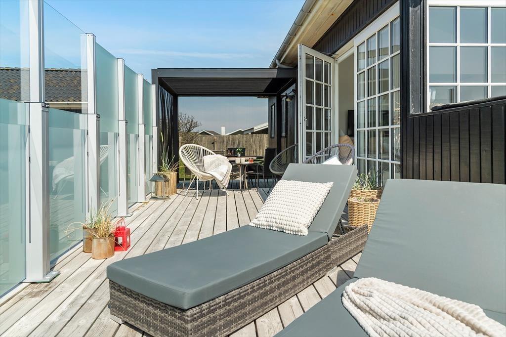 Udenfor finder du en stor terrasse, hvor du kan nyde solen og den friske luft hele dagen. Terrassen er ideel til afslapning med en kop kaffe om morgenen eller til hyggelige grillmiddage om aftenen. Den store græsplæne indbyder til leg og spil for både børn og voksne, og du kan også tage et hvil i en af de komfortable liggestole, mens du nyder roen og de grønne omgivelser. Når vejret er til det, er det oplagt at tage en tur til stranden, der ligger i gåafstand fra sommerhuset – her kan du mærke sandet mellem tæerne og nyde en forfriskende dukkert i Vesterhavet.