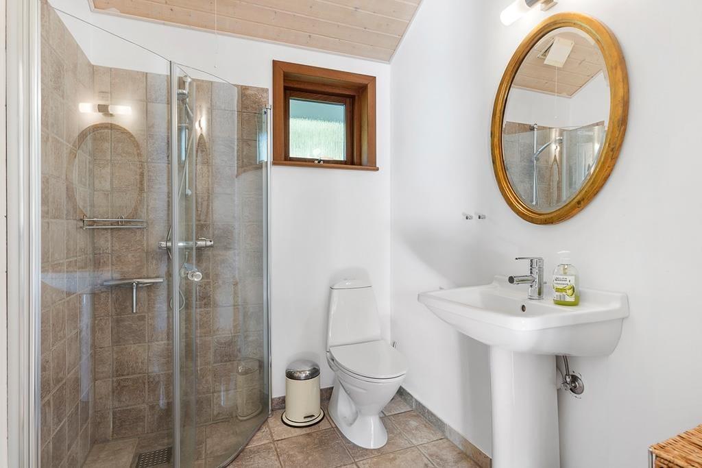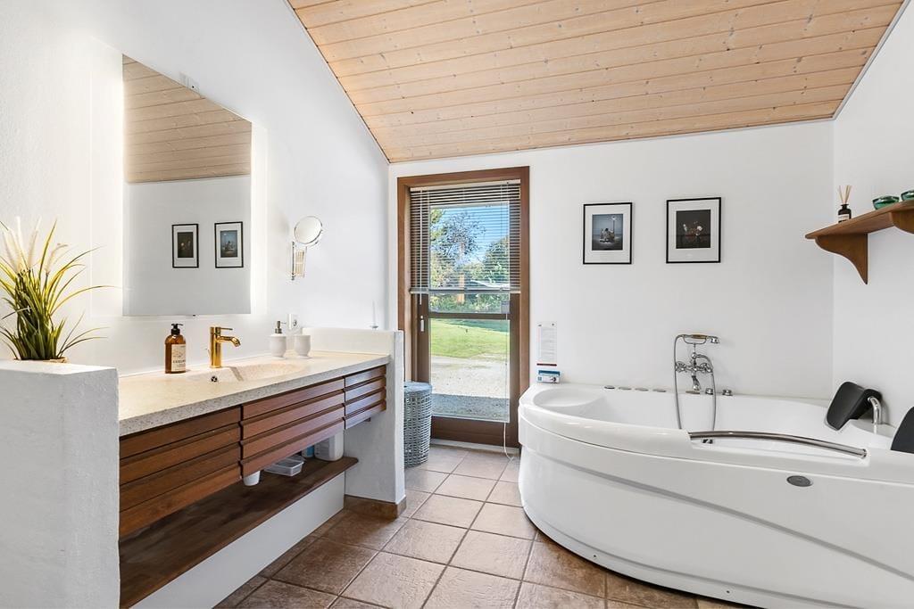 Sommerhuset er et moderne byggeri på intet mindre end 154 m2 – og dertil kommer et godt anneks, der kan fungere som soveplads for to personer. Overalt i selve hovedhuset er der indlagt gulvvarme, så stuens pejs behøver I kun tænde for hyggens skyld, når I sidder med en spændende krimi i sofaen eller har dækket op til en lækker middag ved spisebordet. Stuen ligger i åben forbindelse med et rummeligt køkken, og herfra fører en dør ind til et praktisk bryggers med vaskefaciliteter. Alle rum er lyse og velindrettede – også de tre soveværelser, der alle har gode dobbeltsenge. Sommerhusets master bedroom er på luksuriøs vis forbundet med et stort badeværelse med spabad, mens det andet badeværelse ligger i den anden ende af ferieboligen. Trænger I til underholdning, er der såmænd også sørget for det, for huset er udstyret med alt lige fra dart og bobspil til en Playstation og TV med Chromecast.