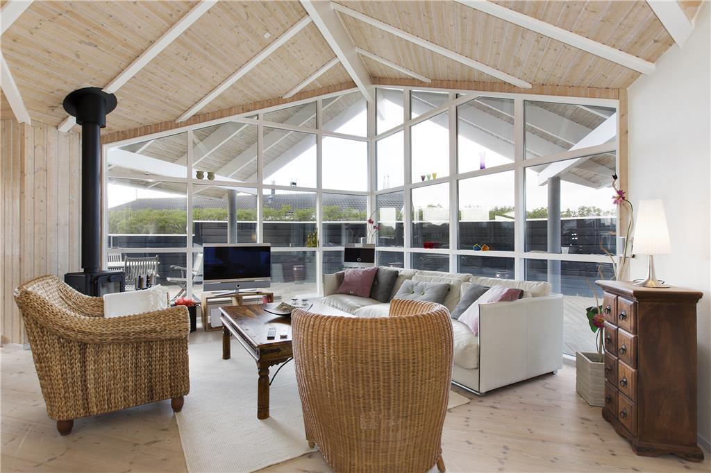 Indenfor møder du en indbydende og lys stue med store vinduespartier, som giver et flot udsyn over den smukke natur, der omgiver huset. Brændeovnen skaber en hyggelig stemning og indbyder til afslapning, når aftenen falder på. Stuen er perfekt til både fælles hygge og stille stunder, hvor hele familien kan samles om en god film eller et spil. Husets høje loft og åbne rum giver en dejlig følelse af plads, og den velindrettede indretning sikrer, at alle føler sig hjemme. I det smukke badeværelse finder du en spa, der giver mulighed for at forkæle dig selv med en afslappende wellness-oplevelse efter en lang dag.