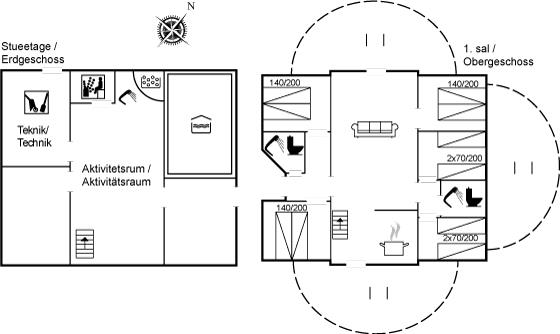 2-plans sommerhus, der er delvist opvarmet ved hjælp af naturgas og solvarme, hvilket gør huset energivenligt. I underetagen findes kombineret swimmingpool-afdeling og aktivitetsrum.