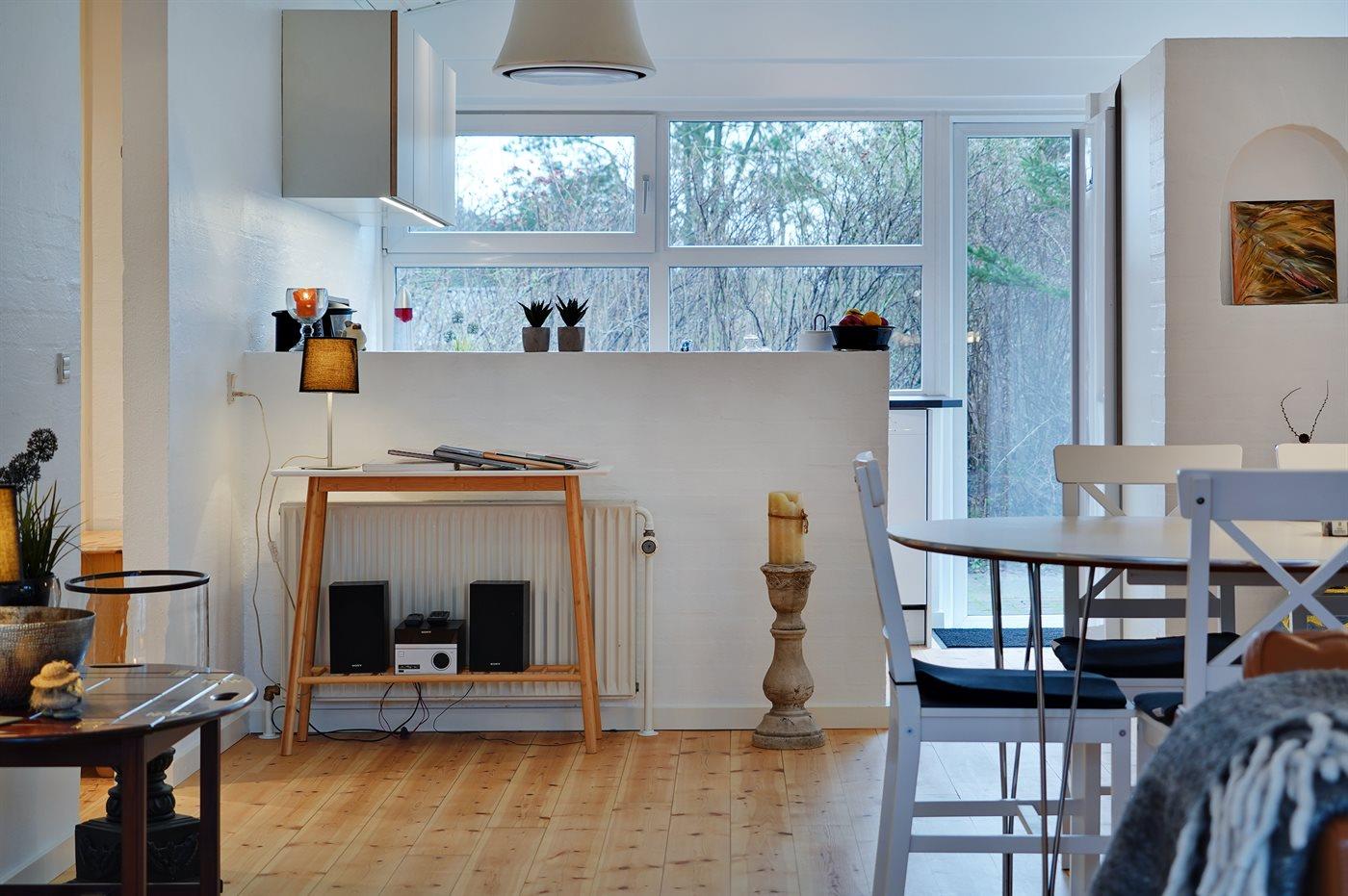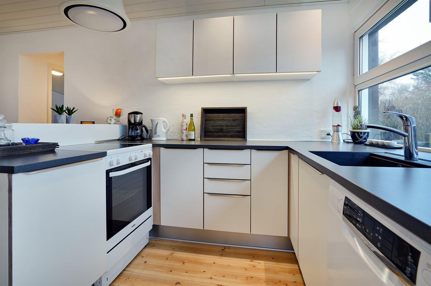 Køkkenet er udstyret med 1 køleskab. Der er 4 elkogeplader, varmluftovn, mikrobølgeovn samt opvaskemaskine.