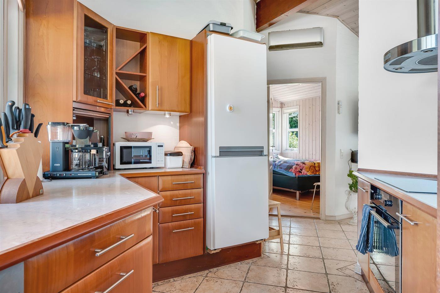 Køkkenet er udstyret med 1 køleskab. Der er 4 keramiske kogeplader, varmluftovn, mikrobølgeovn samt opvaskemaskine Der er gulvvarme i køkkenet.