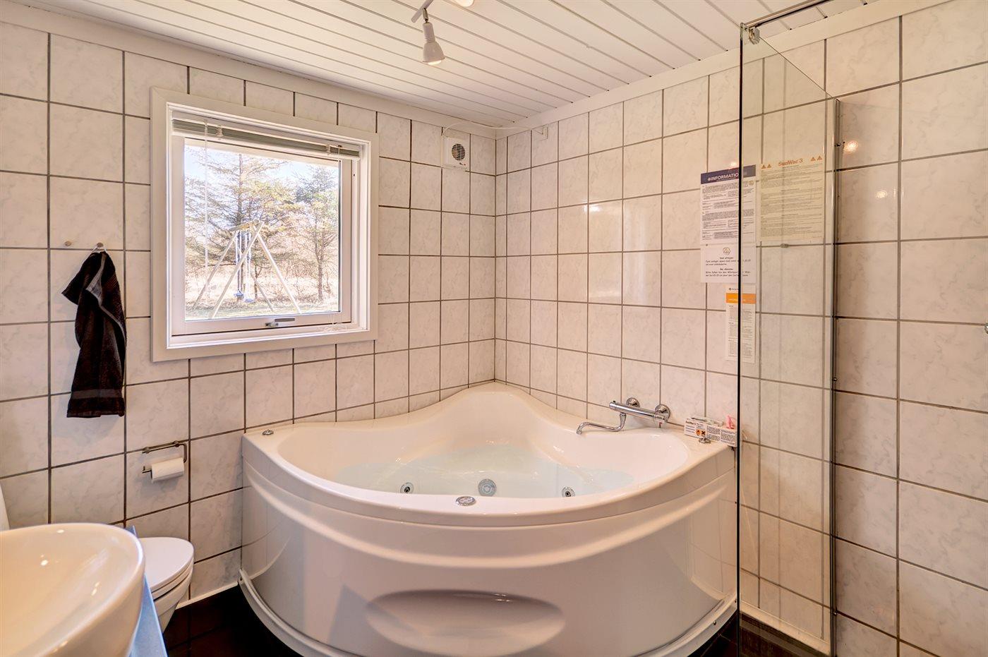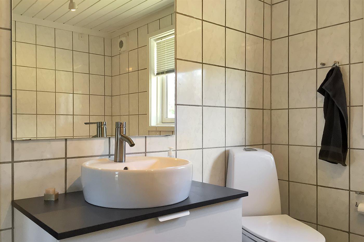 Der er 1 badeværelse med bruseniche og 2 toiletter, heraf 1 gæstetoilet. Der er gulvvarme på 1 badeværelse. Der er gulvvarme på gæstetoilettet. I saunaen er der mulighed for afslapning.