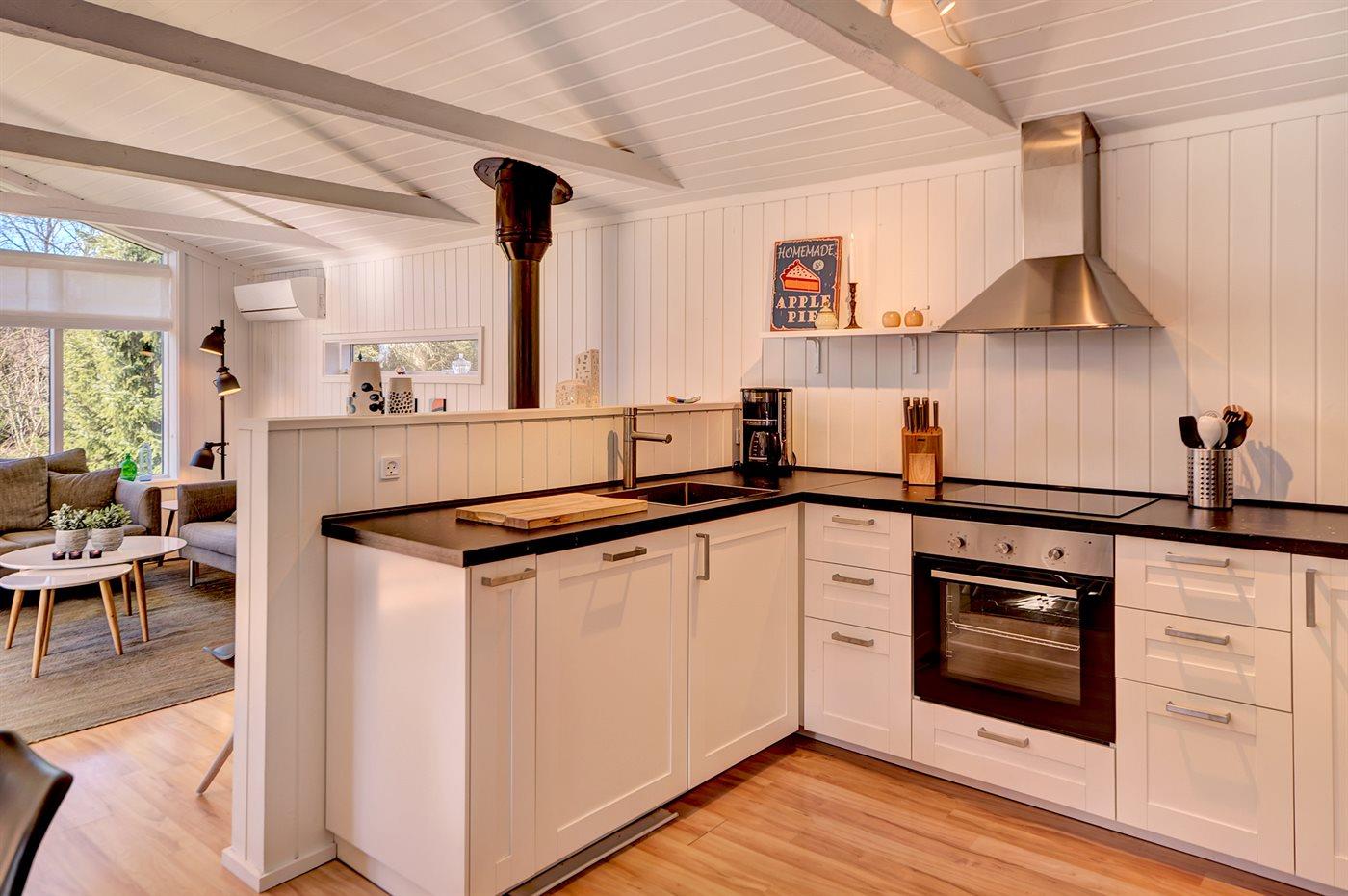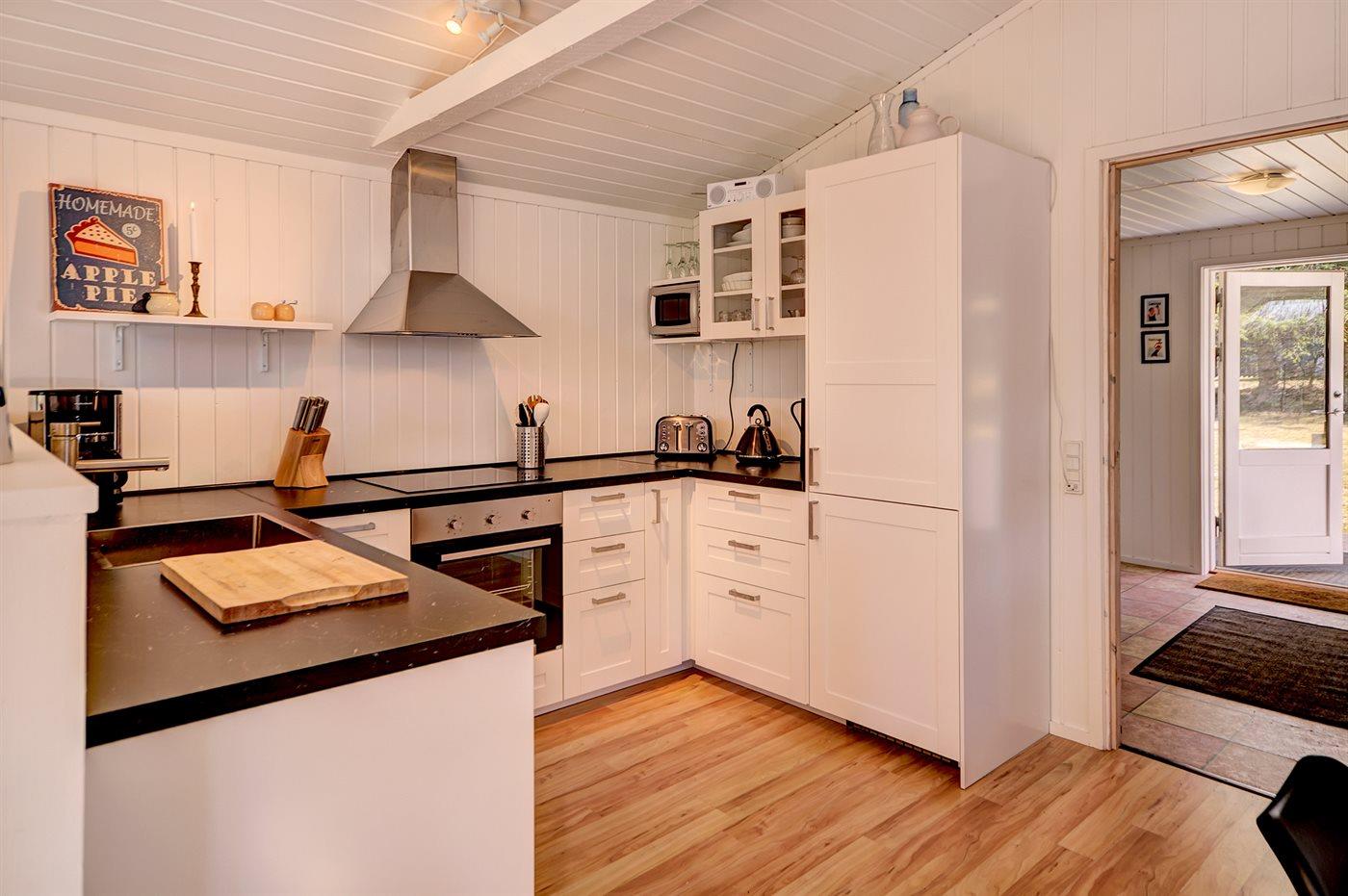 Køkkenet er udstyret med 1 køleskab. Der er 4 induktionskogeplader, varmluftovn, mikrobølgeovn samt opvaskemaskine.