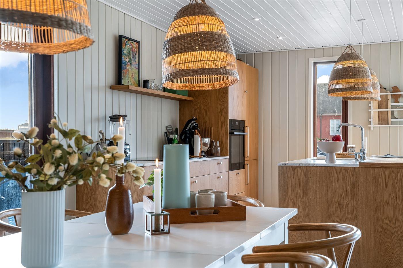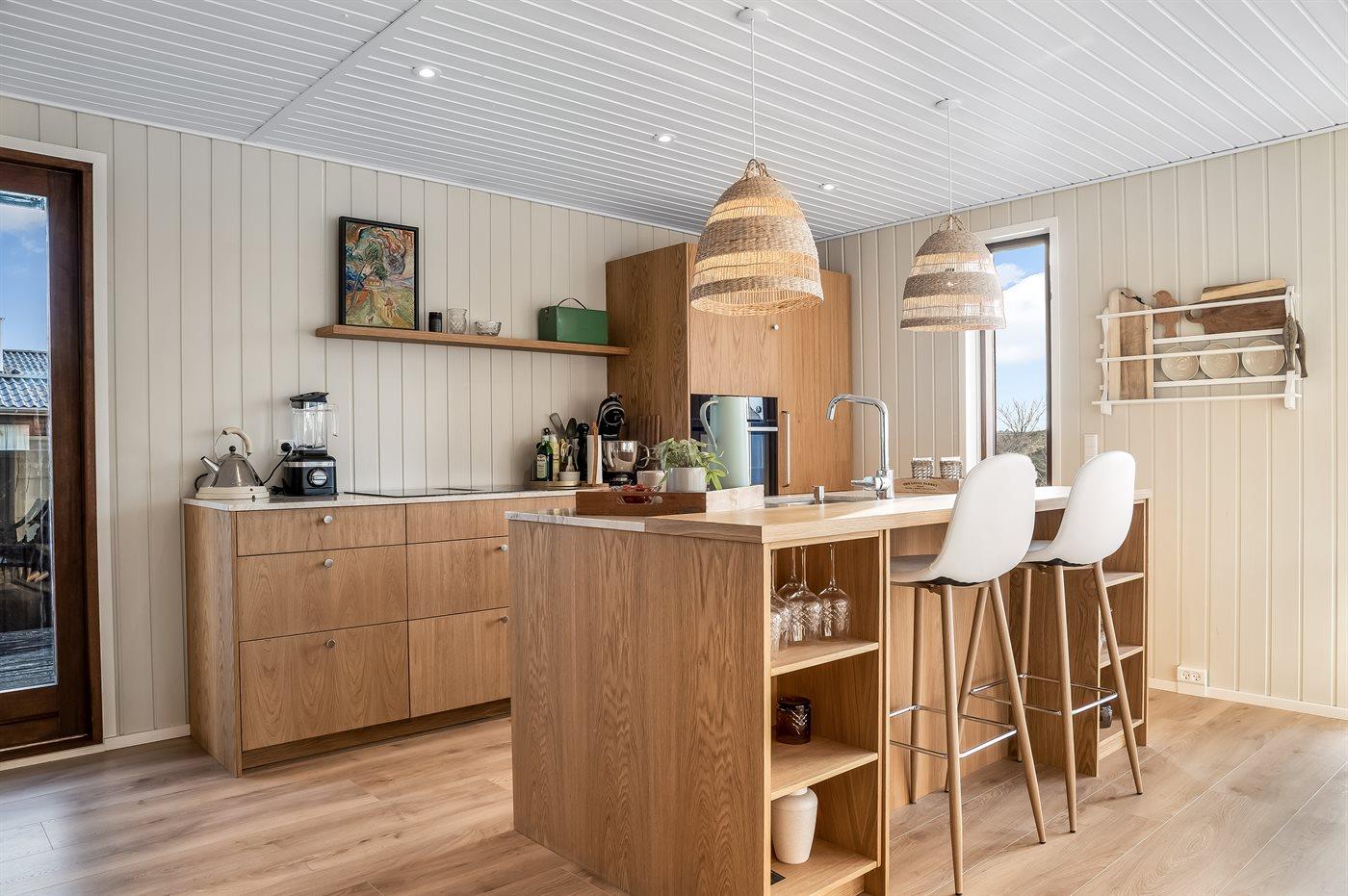 Køkkenet er udstyret med 1 køleskab. Der er 4 induktionskogeplader, varmluftovn samt opvaskemaskine.