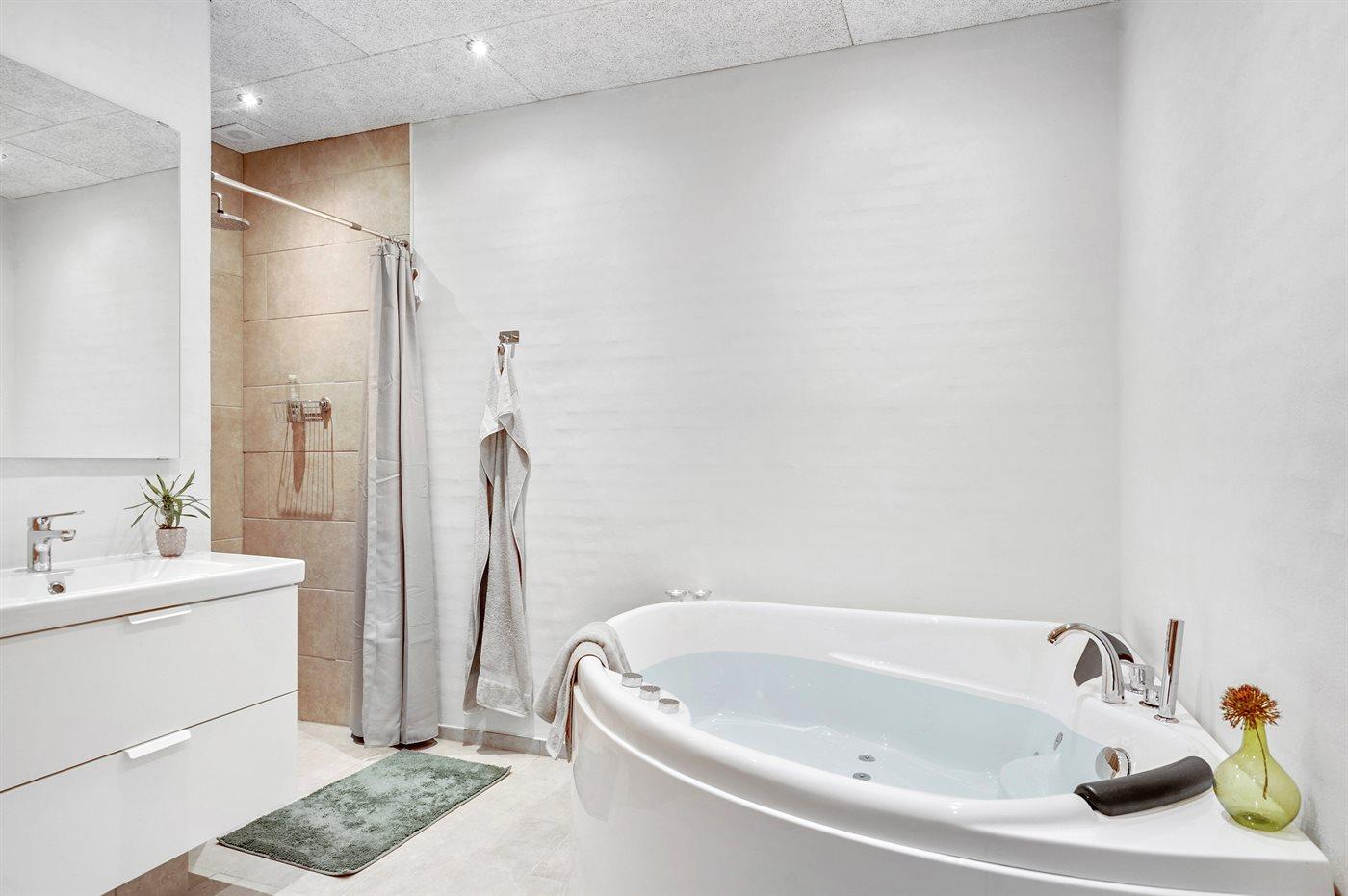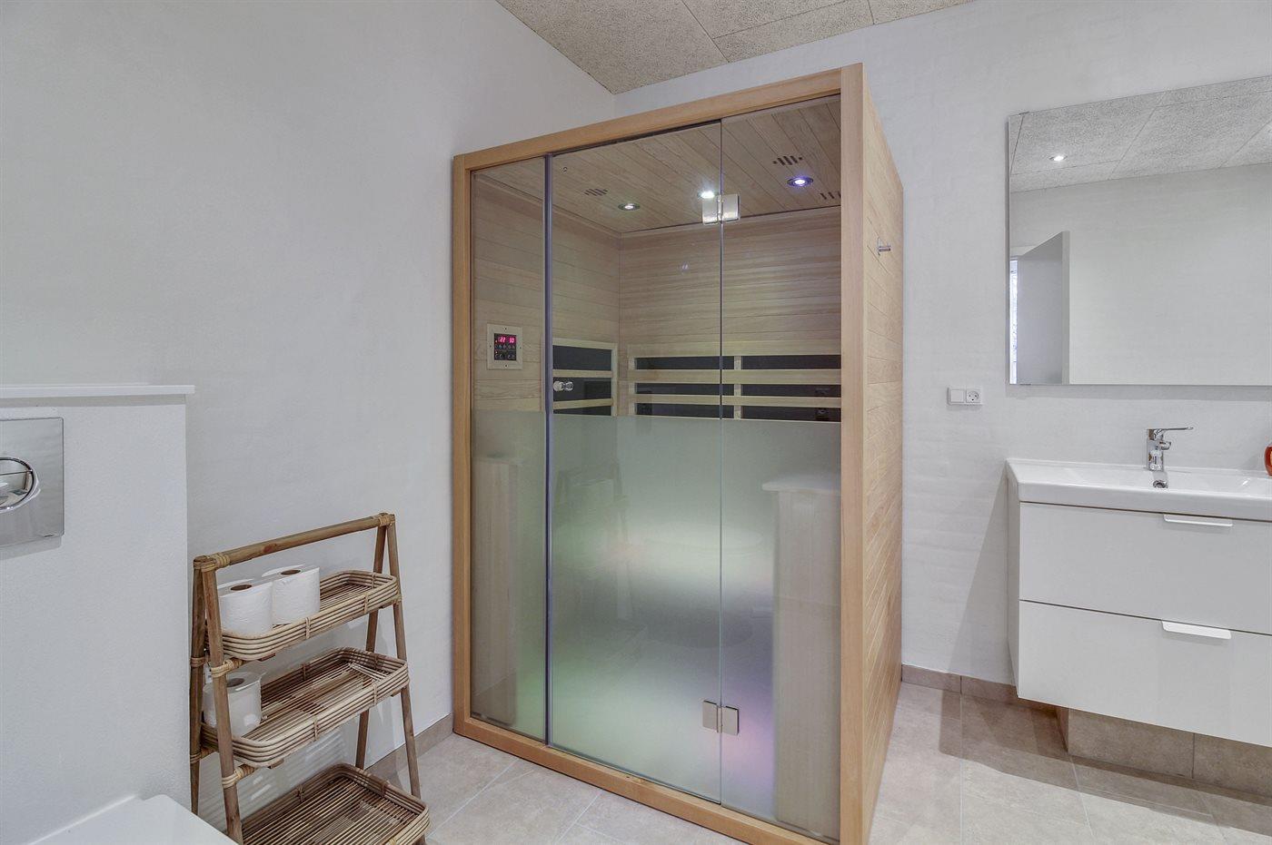 Der er 2 badeværelser med bruseniche og 2 toiletter. Der er gulvvarme på 2 badeværelser. I saunaen er der mulighed for afslapning.