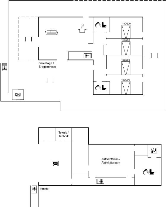 Der er i alt 4 soveværelser. Sovepladserne fordeler sig på: 8 sovepladser i dobbeltsenge. 2 sovepladser på madrasser. 2 af disse sovepladser befinder sig på husets hems. Derudover er der 1 stk. barneseng.