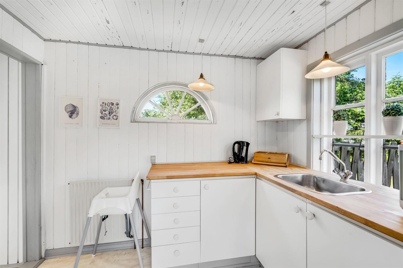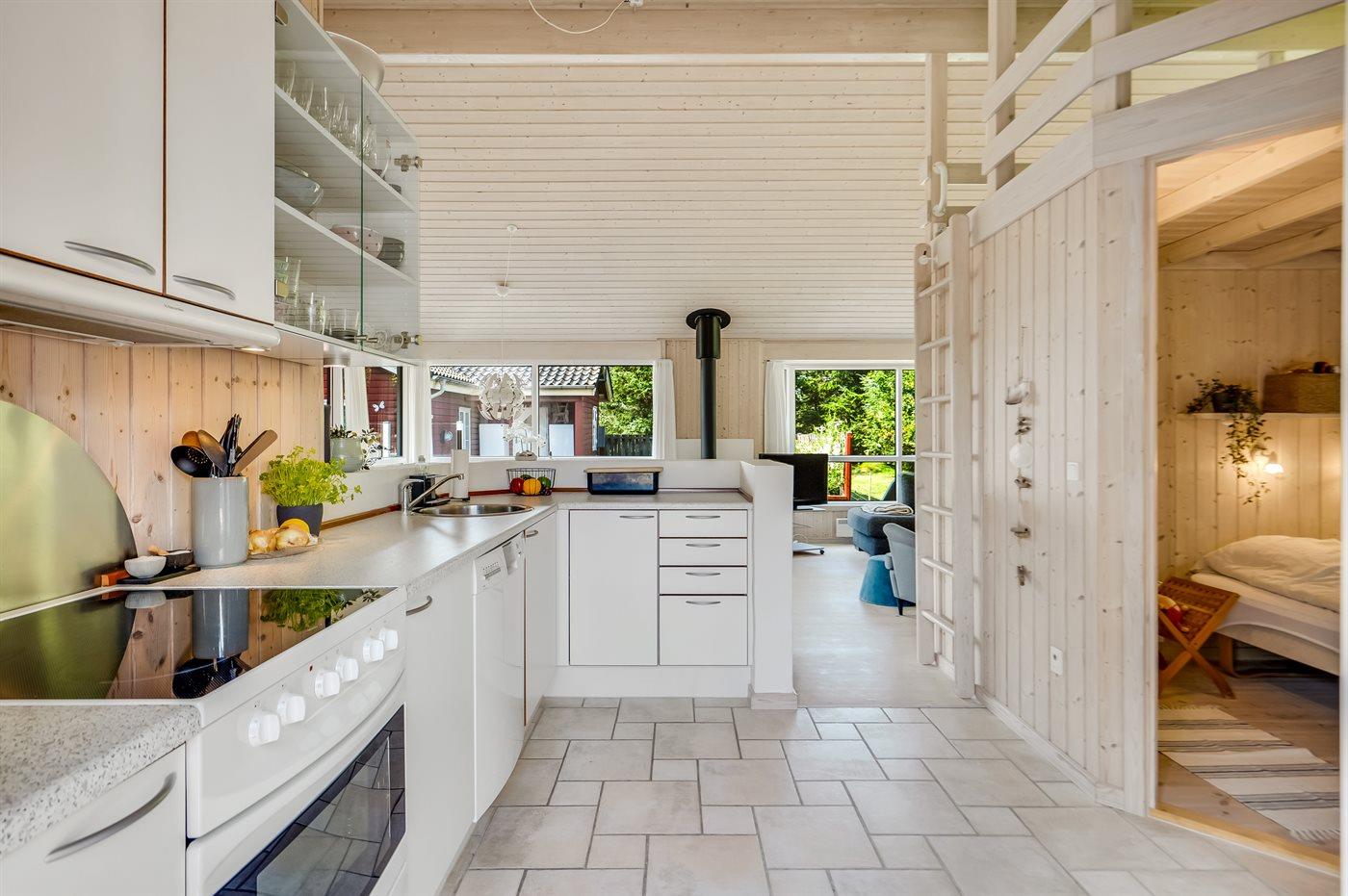 Køkkenet er udstyret med 2 køleskabe. Der er 4 keramiske kogeplader, varmluftovn samt opvaskemaskine Der er gulvvarme i køkkenet.
