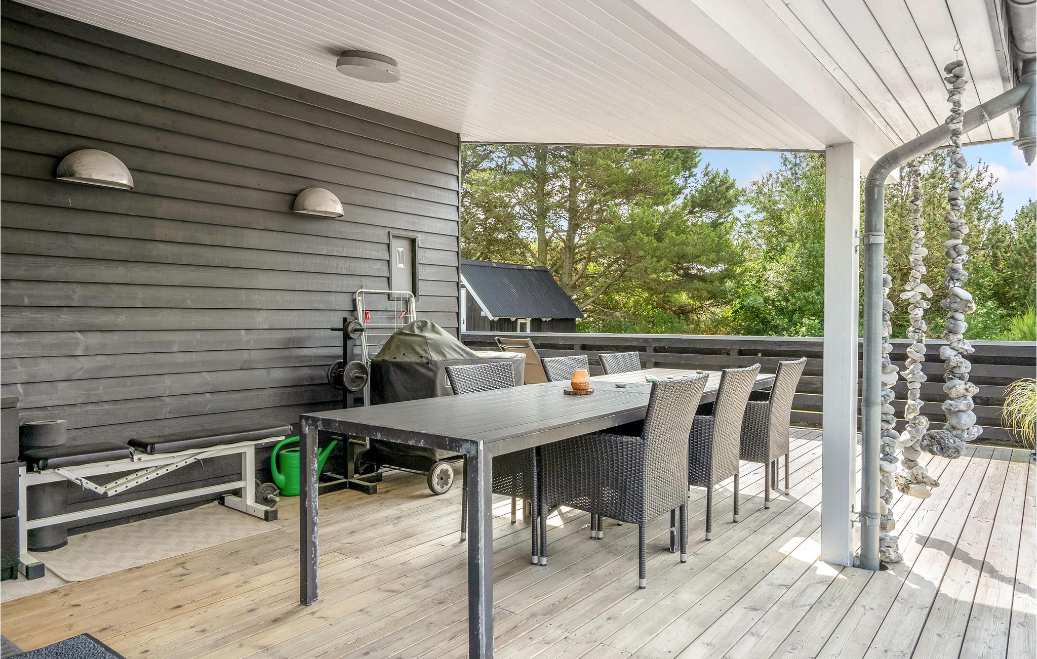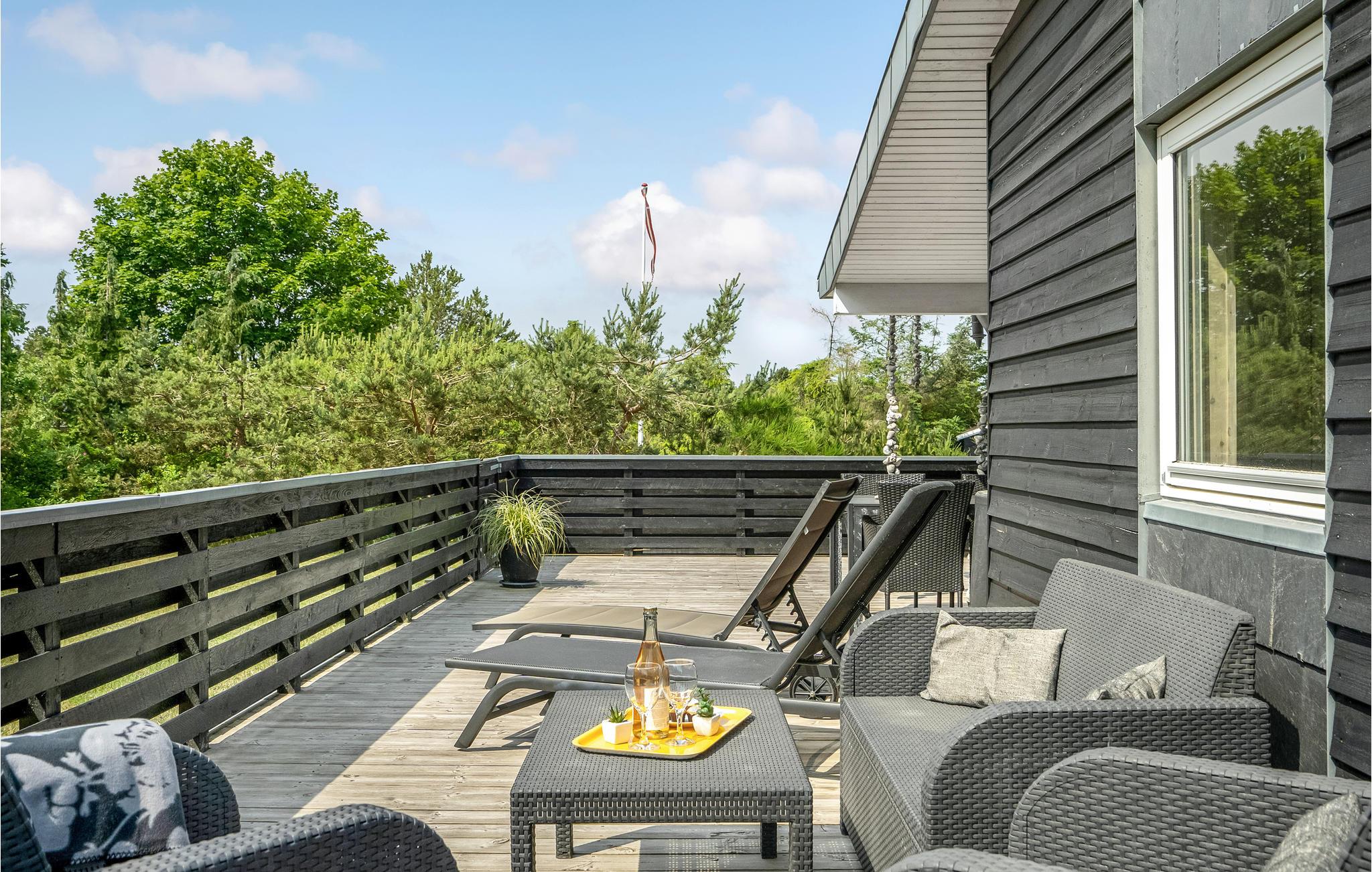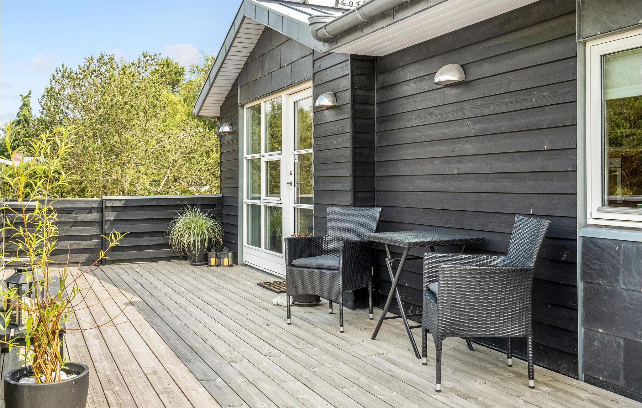 Fra stuen er der udgang til den store træterrasse, der er delvist åben, delvist overdækket. Her kan I sidde længe efter solen er sunket ned i horisonten. Huset ligger på en naturgrund med spredt bevoksning og græs.