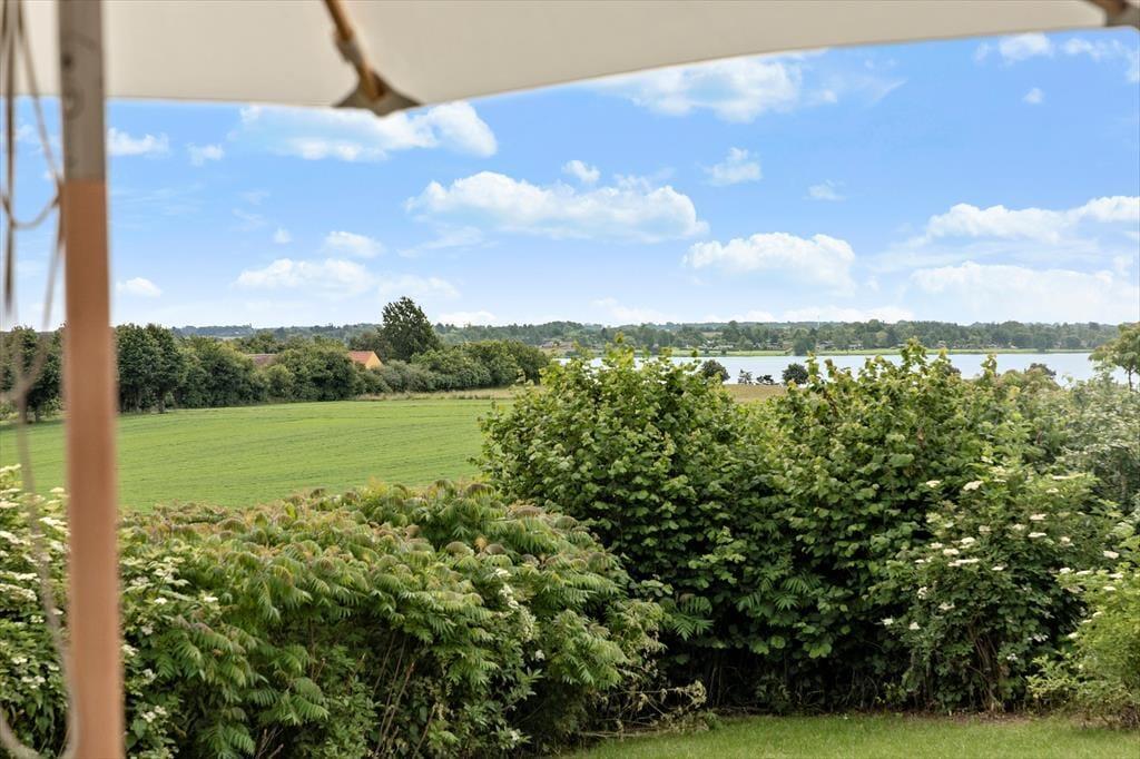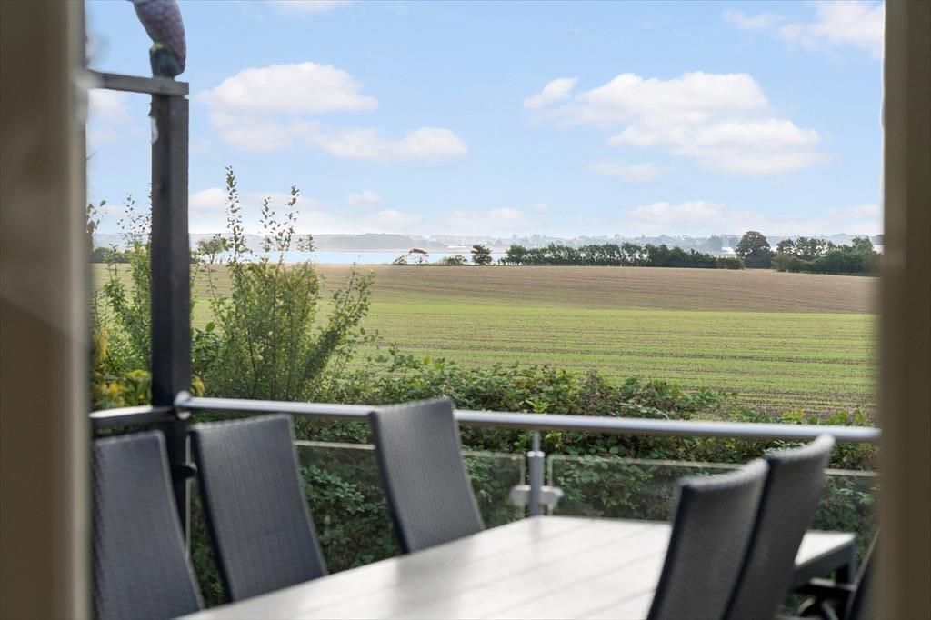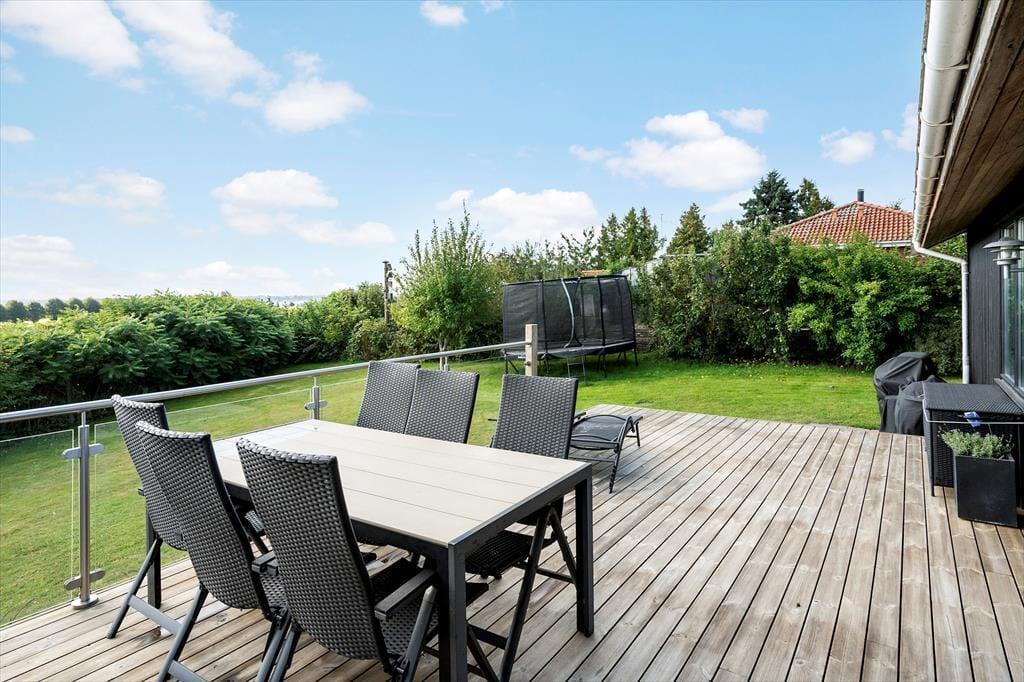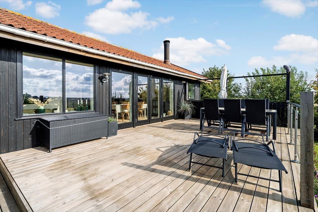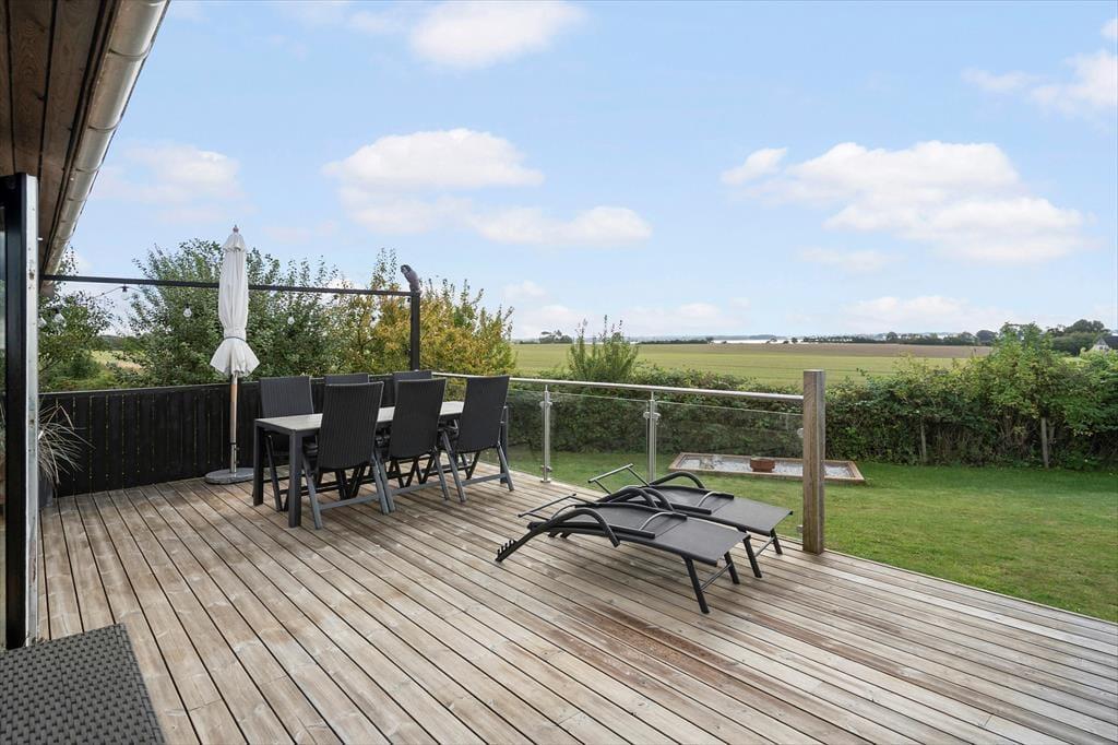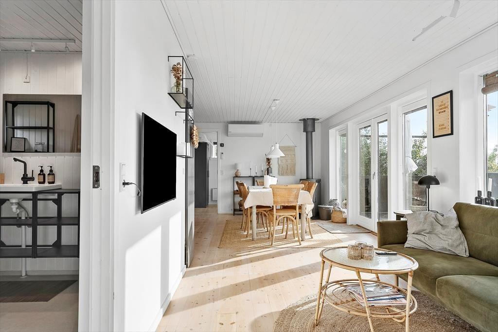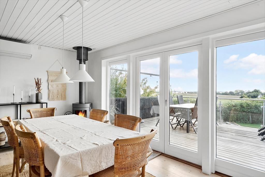 Lys stue med skøn havudsigt. Udgang til stor træterrasse. Spiseplads. Brændeovn og varmepumpe samt TV.