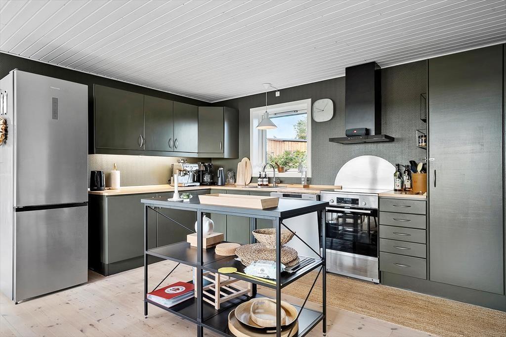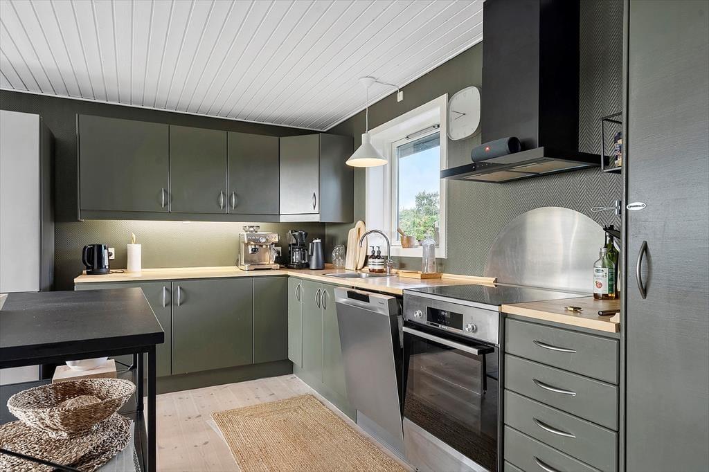 Flot åbent køkken i forbindelse med stuen med elkomfur, emhætte, kaffemaskine, elkedel, opvaskemaskine, køleskab, fryser, alt service og køkkengrej.