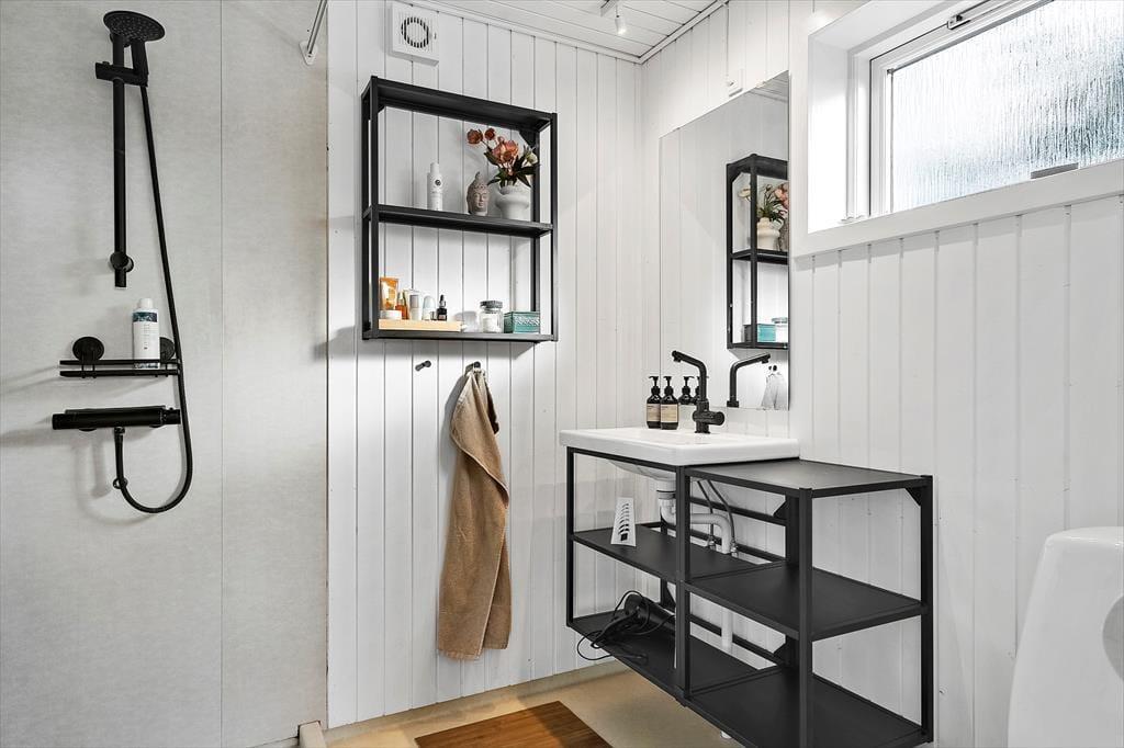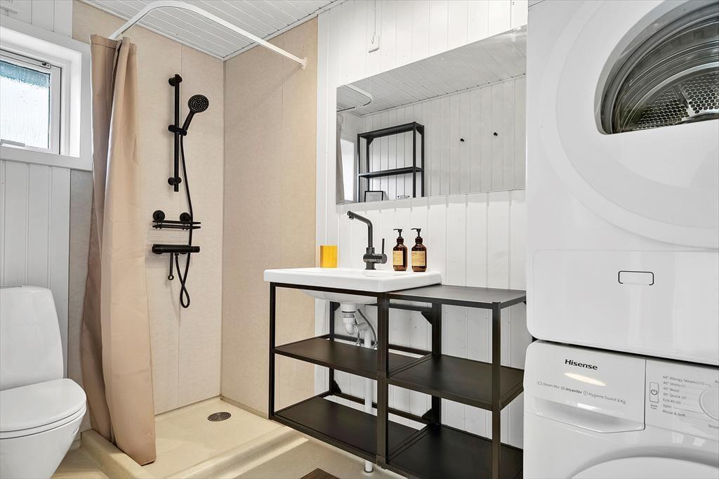 Pænt badeværelse med toilet, håndvask og bruseniche. Vaskemaskine og tørretumbler.