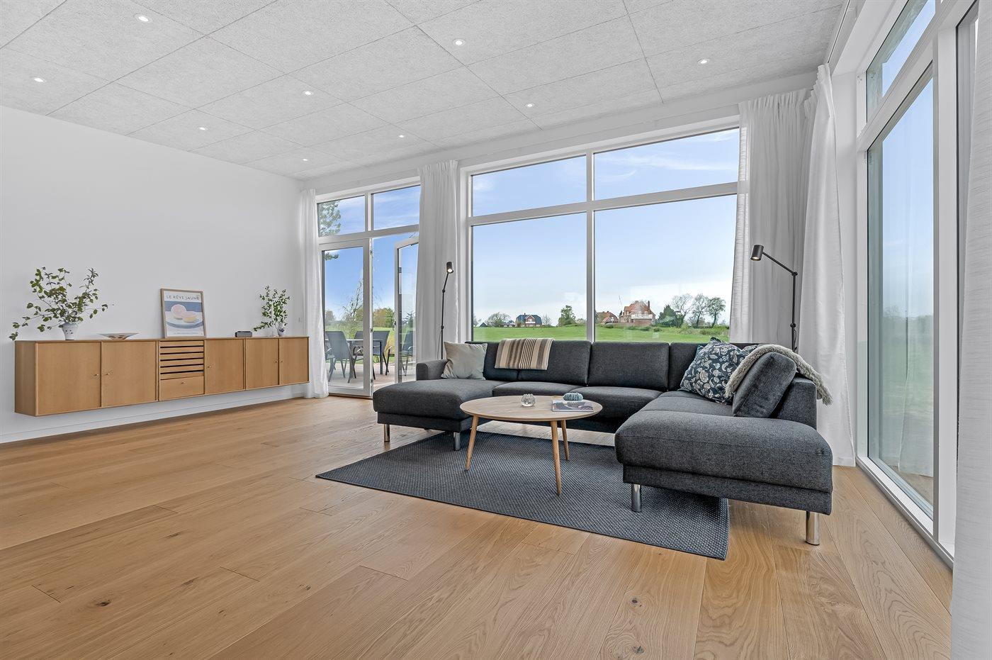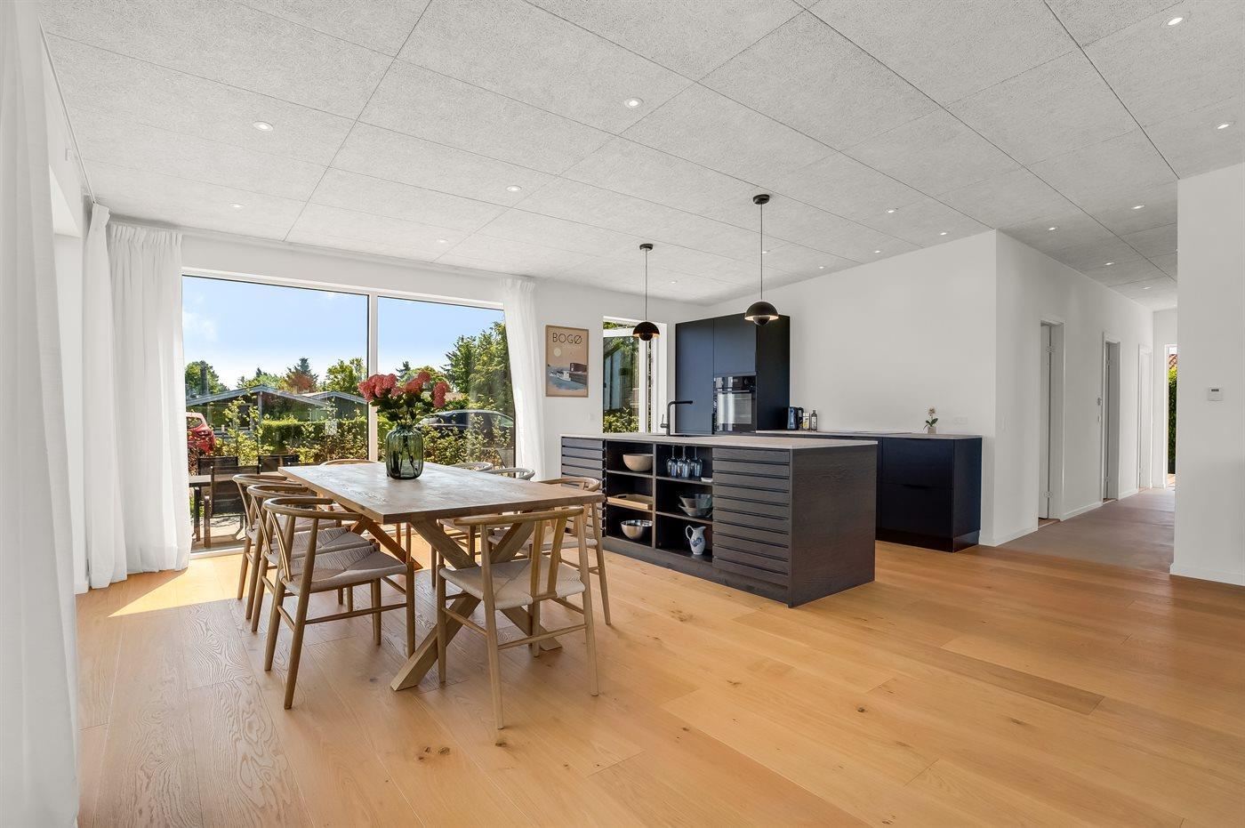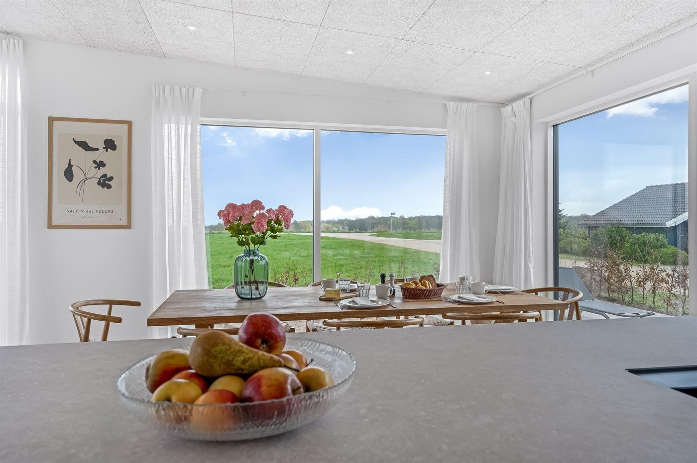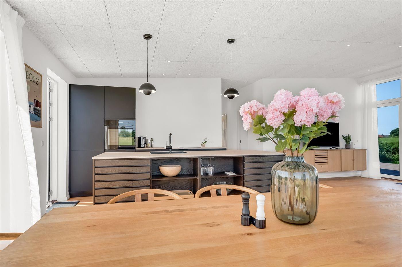 Huset er bl.a. indrettet med et lyst køkken-alrum med udsigt over stuen og videre ud over havet, når der er klart vejr.