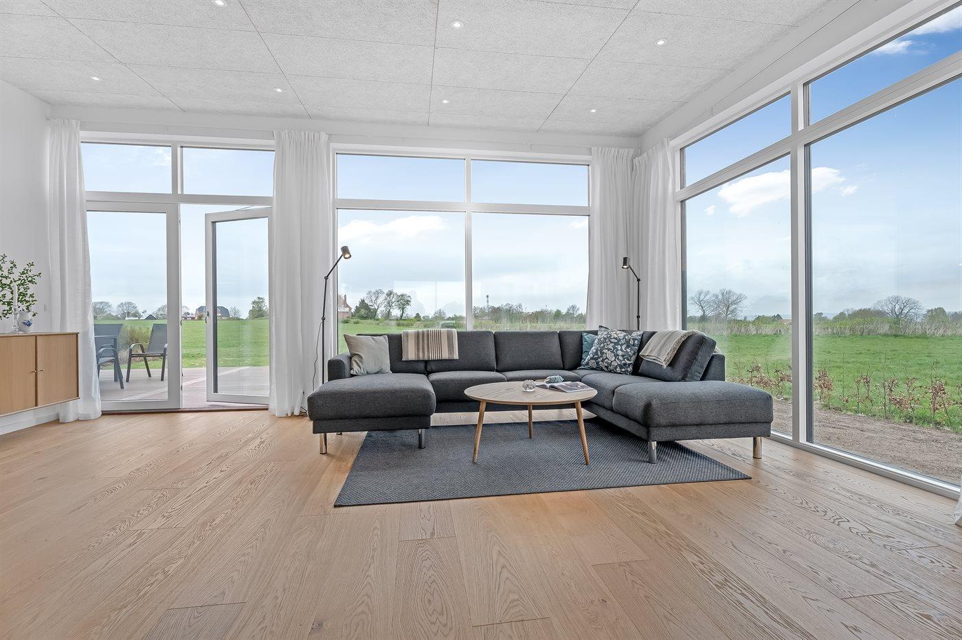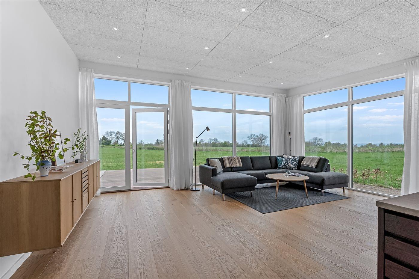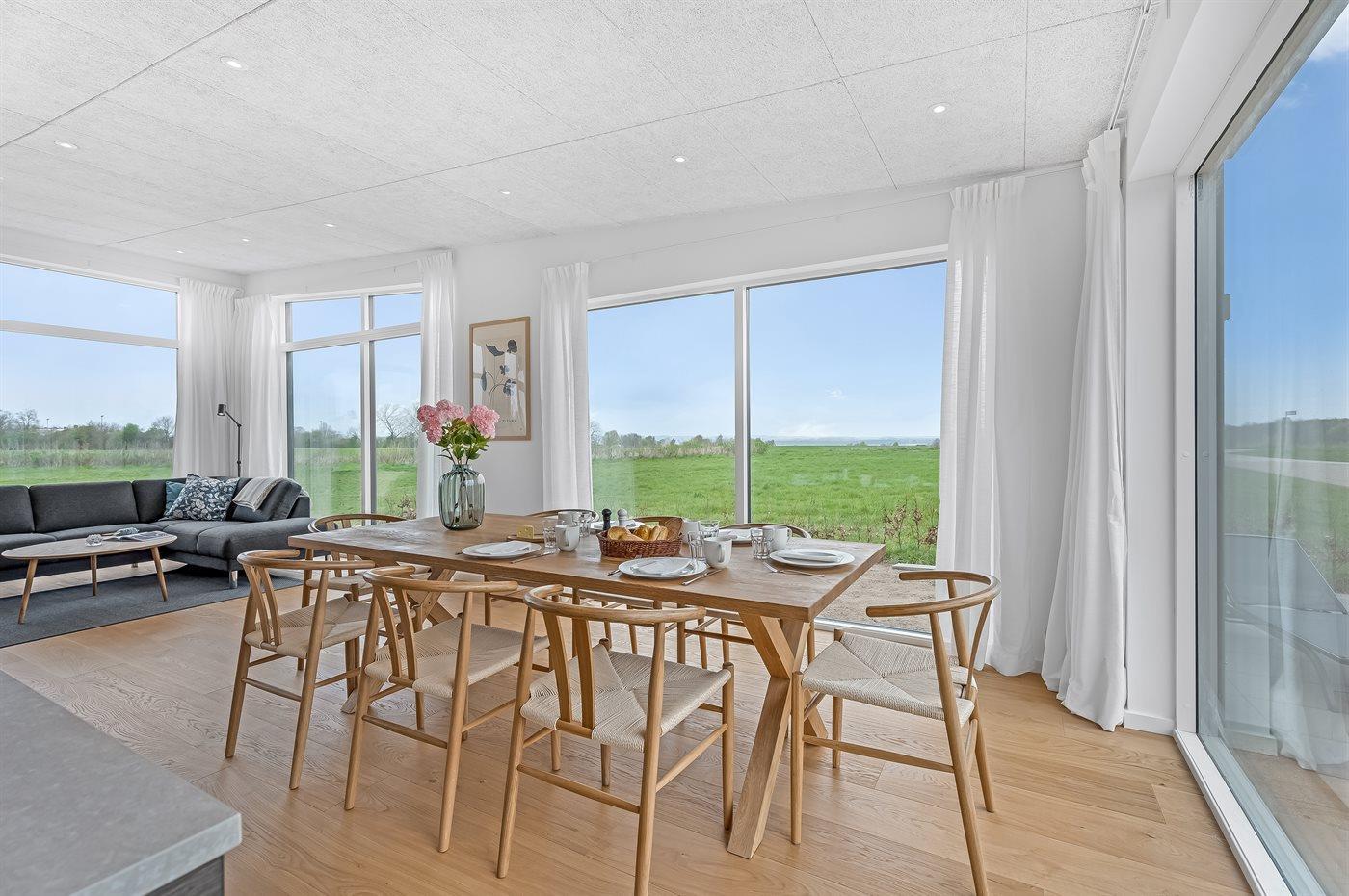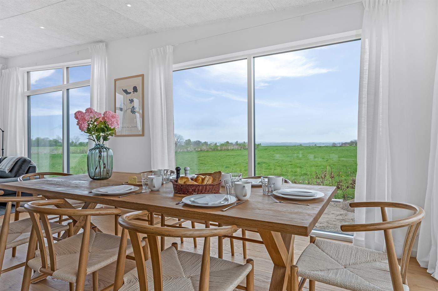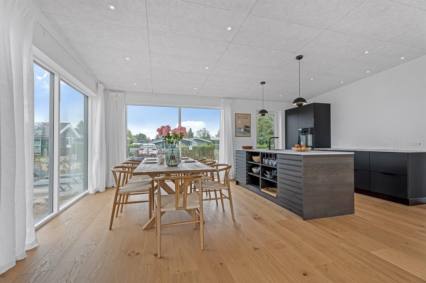 Huset er bl.a. indrettet med et lyst køkken-alrum med udsigt over stuen og videre ud over havet, når der er klart vejr.