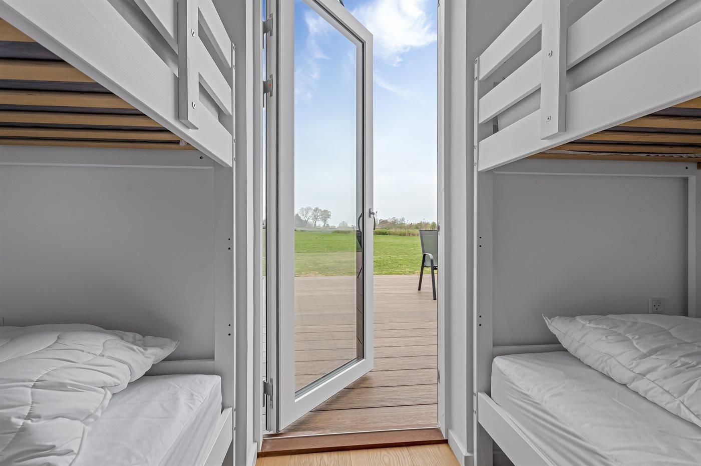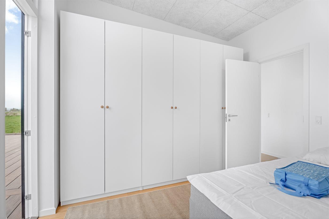 Der er i alt 3 soveværelser. Sovepladserne fordeler sig på: 2 sovepladser i dobbeltseng. 2 sovepladser i enkeltsenge. 4 sovepladser i køjesenge. Derudover er der 1 stk. barneseng.