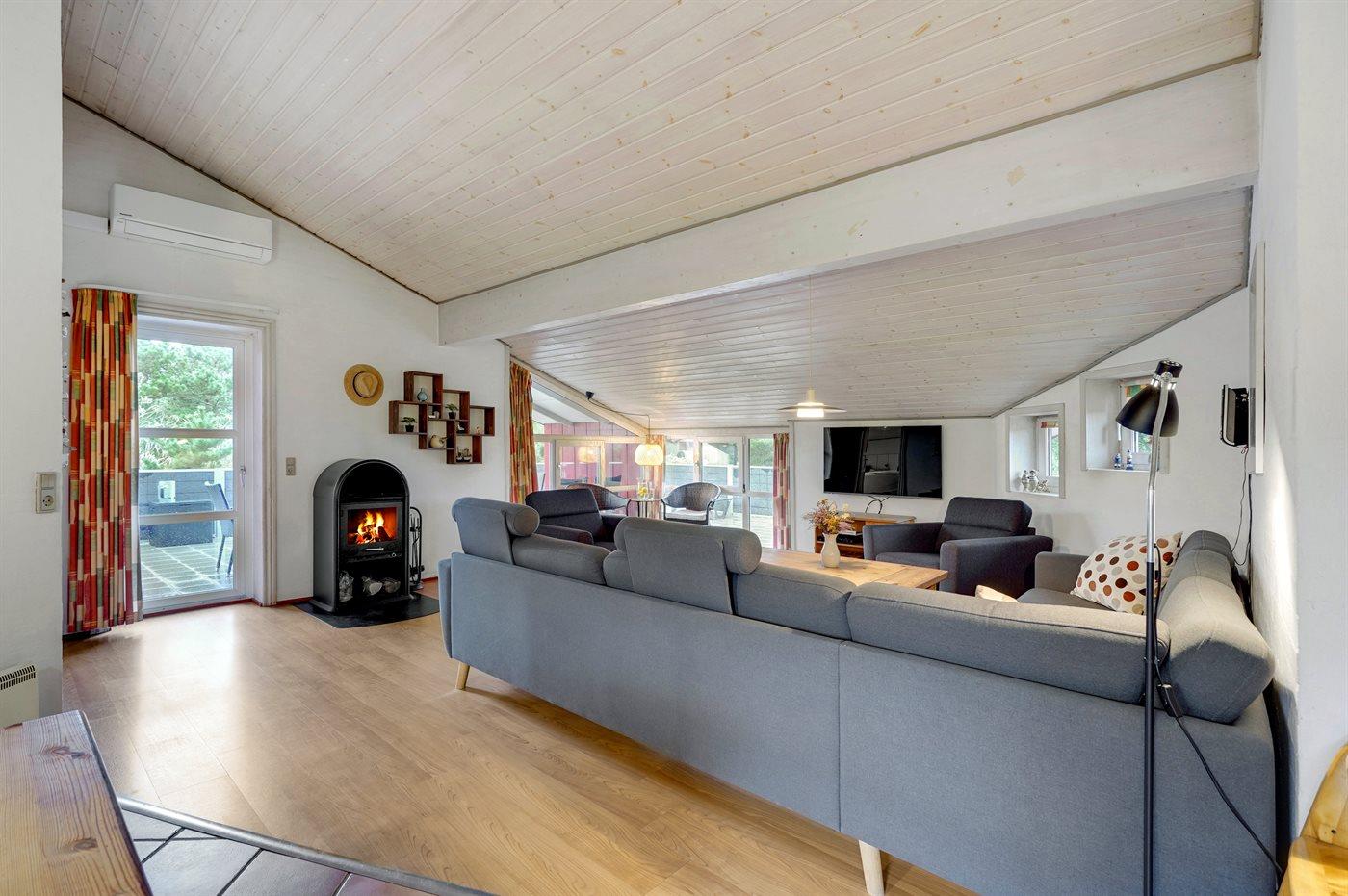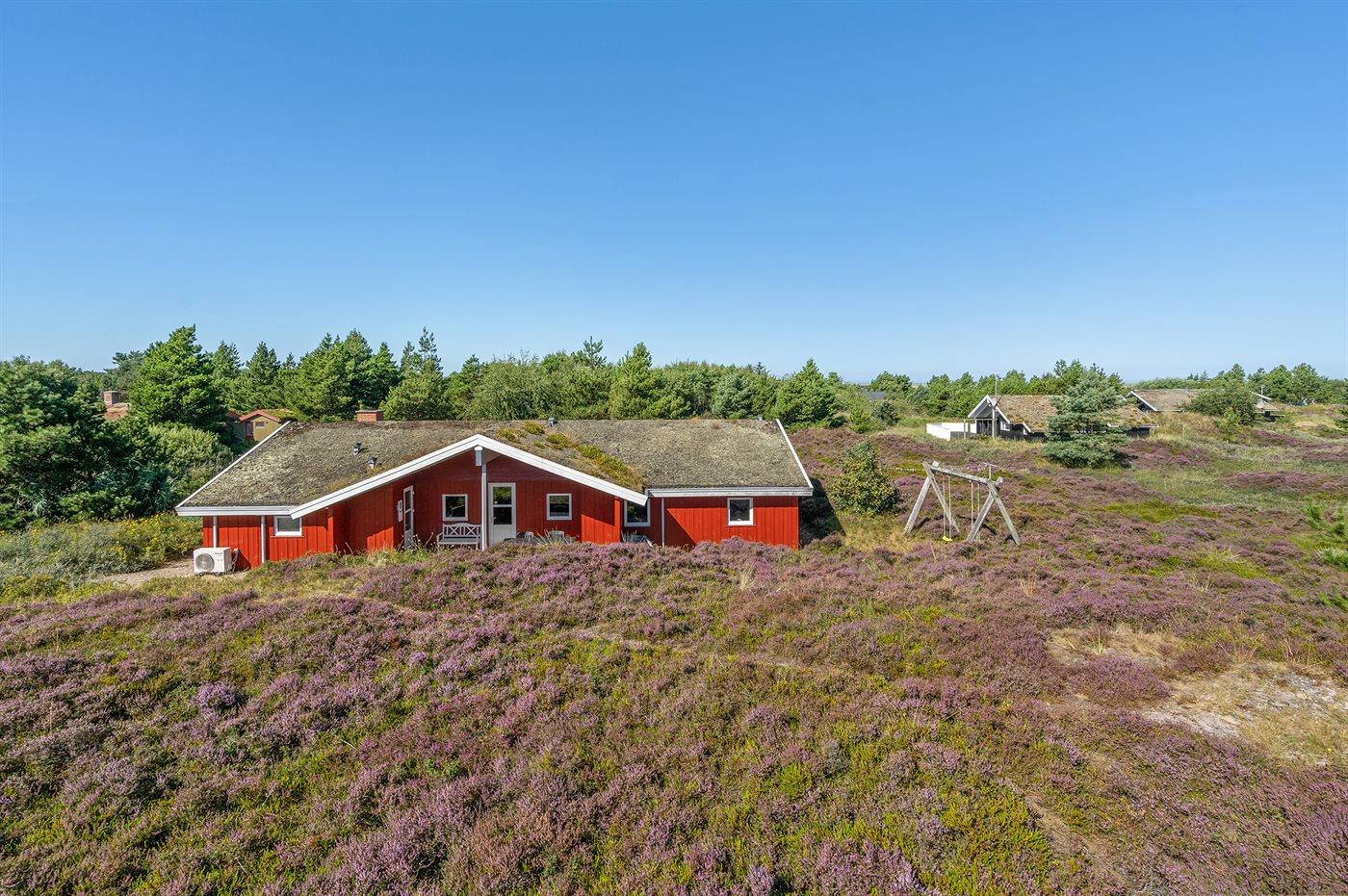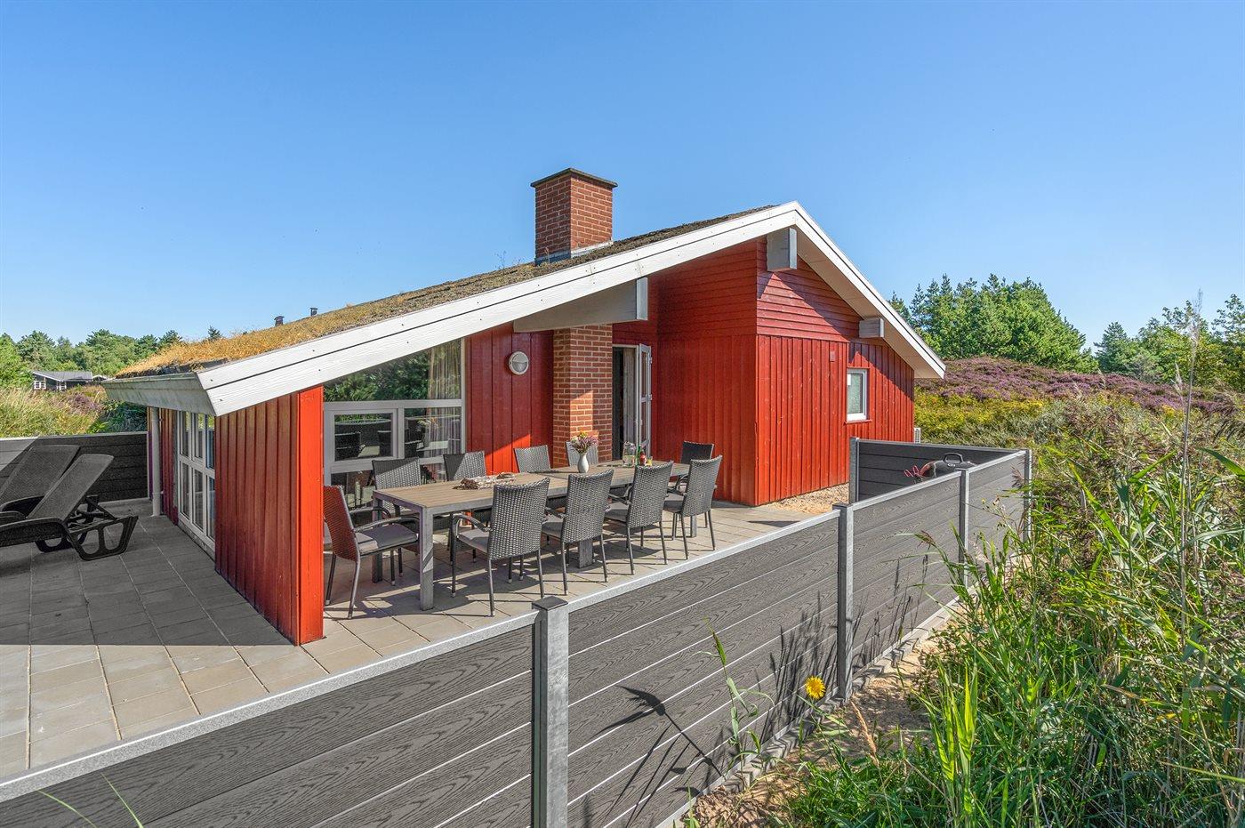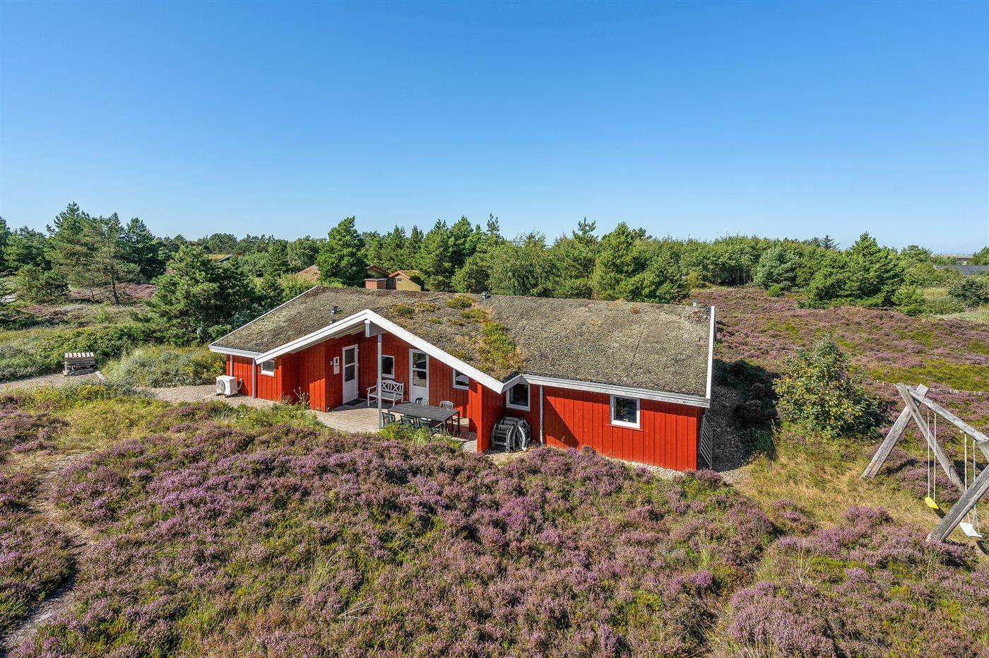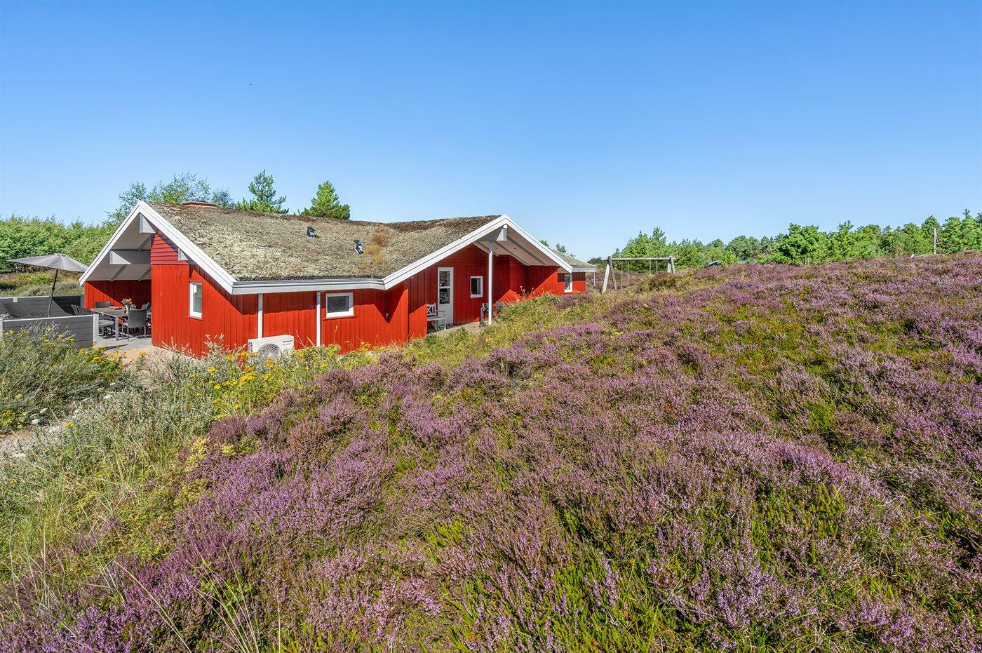 Dette store, flotte sommerhus i træ ligger på en stor naturgrund, som grænser op til et flot lyngklædt område. Til huset hører en dejlig, stor og delvist overdækket terrasse med havemøbler.