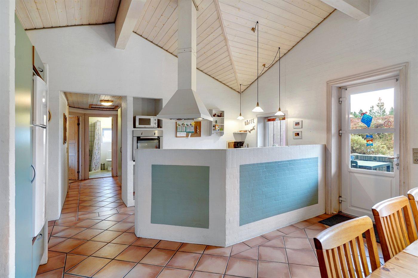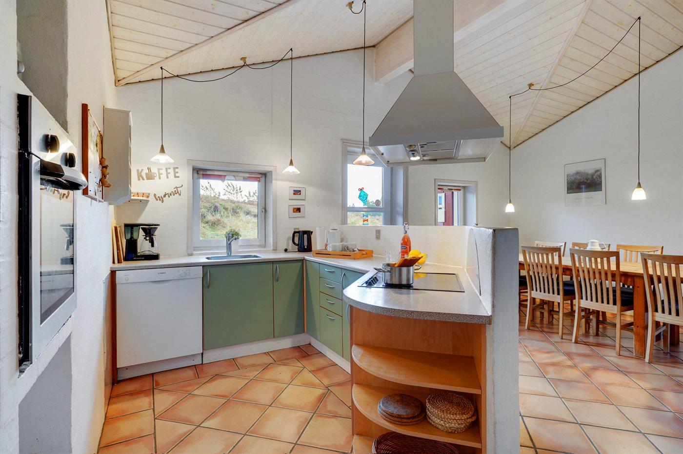 Køkkenet er udstyret med 1 køleskab. Der er 4 elkogeplader, bageovn, mikrobølgeovn samt opvaskemaskine.