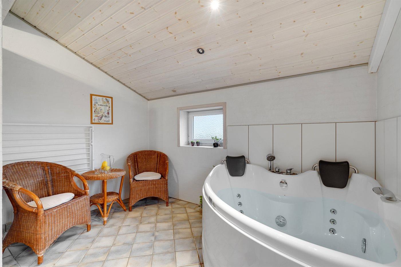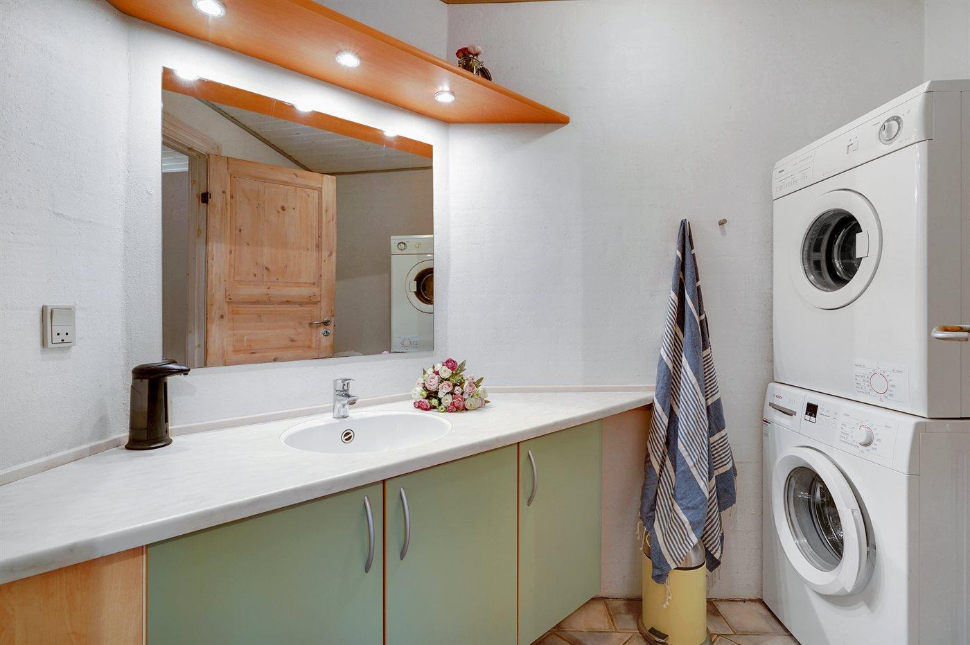 Der er 2 badeværelser med bruser og 2 toiletter. Der er gulvvarme på 1 badeværelse. I saunaen er der mulighed for afslapning.