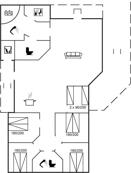 Der er i alt 5 soveværelser. Sovepladserne fordeler sig på: 8 sovepladser i dobbeltsenge. 2 sovepladser i enkeltsenge.