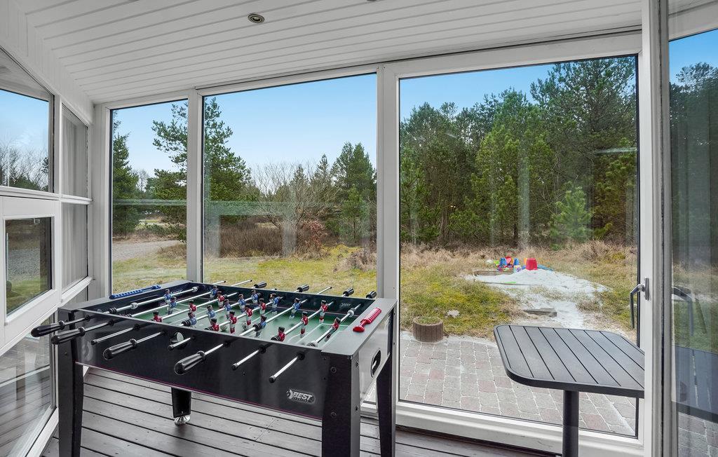 I det populære område Bolilmark på Rømø ligger dette rummelige feriehus med swimmingpool på en skøn lyngklædt naturgrund. Fra poolområdet er der udgang til terrassen. I vælger selv, om I åbner porten så I har frit udsyn over et stort lyngareal nordvest for huset fra terrassen. Huset er velegnet til to familier, da der er to soveafdelinger med hver tre soveværelser samt et badeværelse. Fra det ene badeværelse er der adgang til poolrummet, hvor der også findes en sauna. Fra stuen kan I følge aktiviteterne i poolen gennem det store vinduesparti - døren til poolrummet er børnesikret. Fra Bolilmark går en cykelsti til Lakolk butikstorv og stranden. På stranden kan I bygge fantastiske slotte, nyde solen og havet og sende drager til vejrs i den friske vind fra havet. En gåtur i kanten af havet efter en frisk storm kan give mulighed for at finde havets guld: de smukke klumper rav.