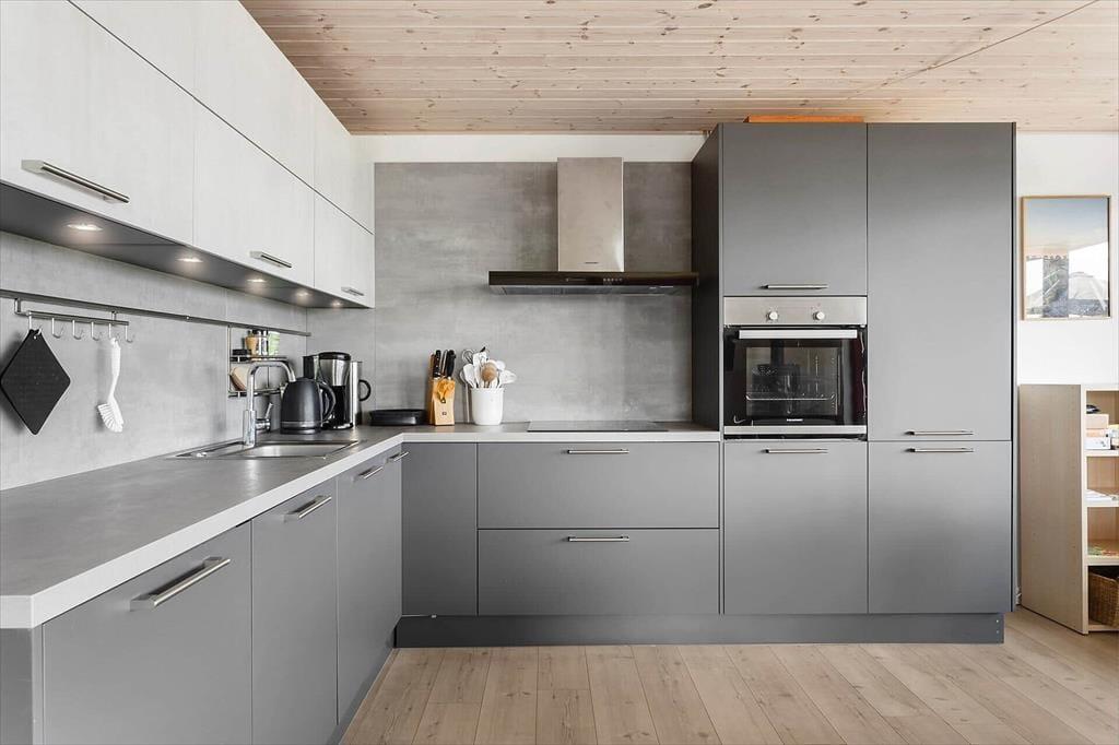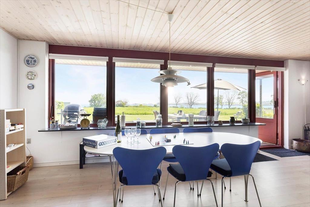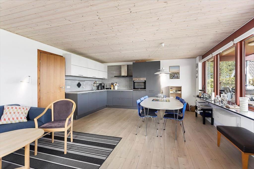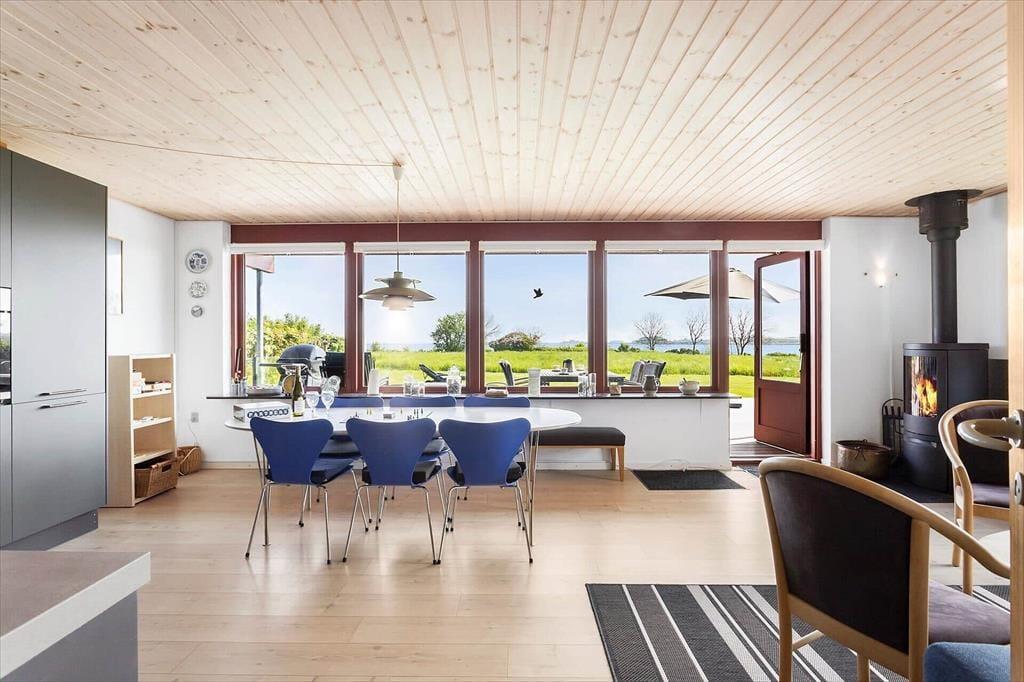 Indenfor møder du et lyst og indbydende køkken, der åbner op til en rummelig spiseplads og stue. Her er der tænkt på detaljerne, fra den hyggelige brændeovn til den energibesparende varmepumpe, der sikrer komfort året rundt. Store vinduer lader lyset strømme ind, hvilket skaber en afslappet atmosfære, hvor du straks kan føle dig hjemme.