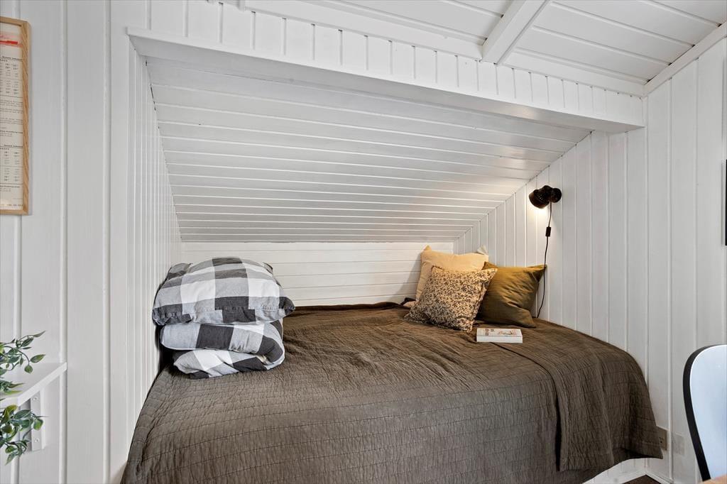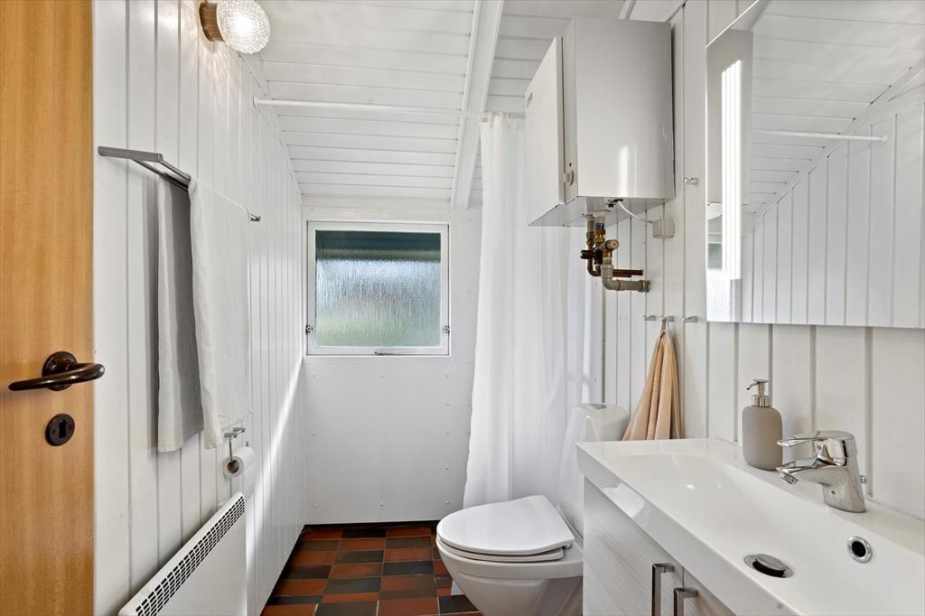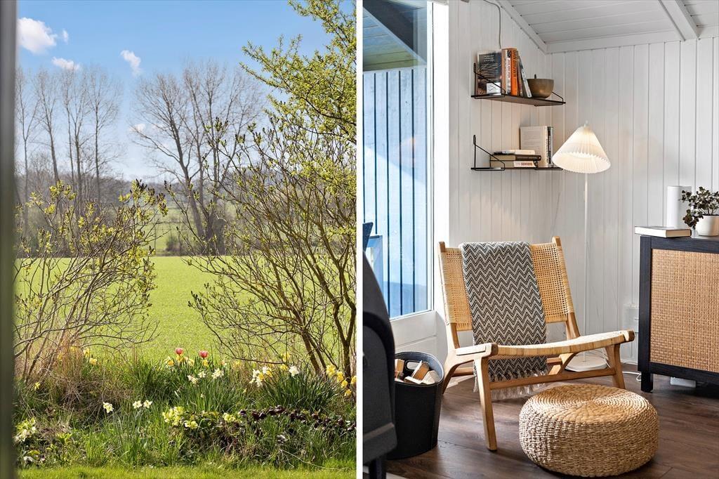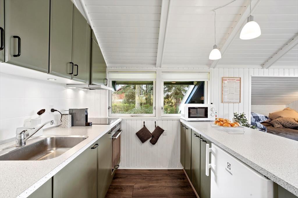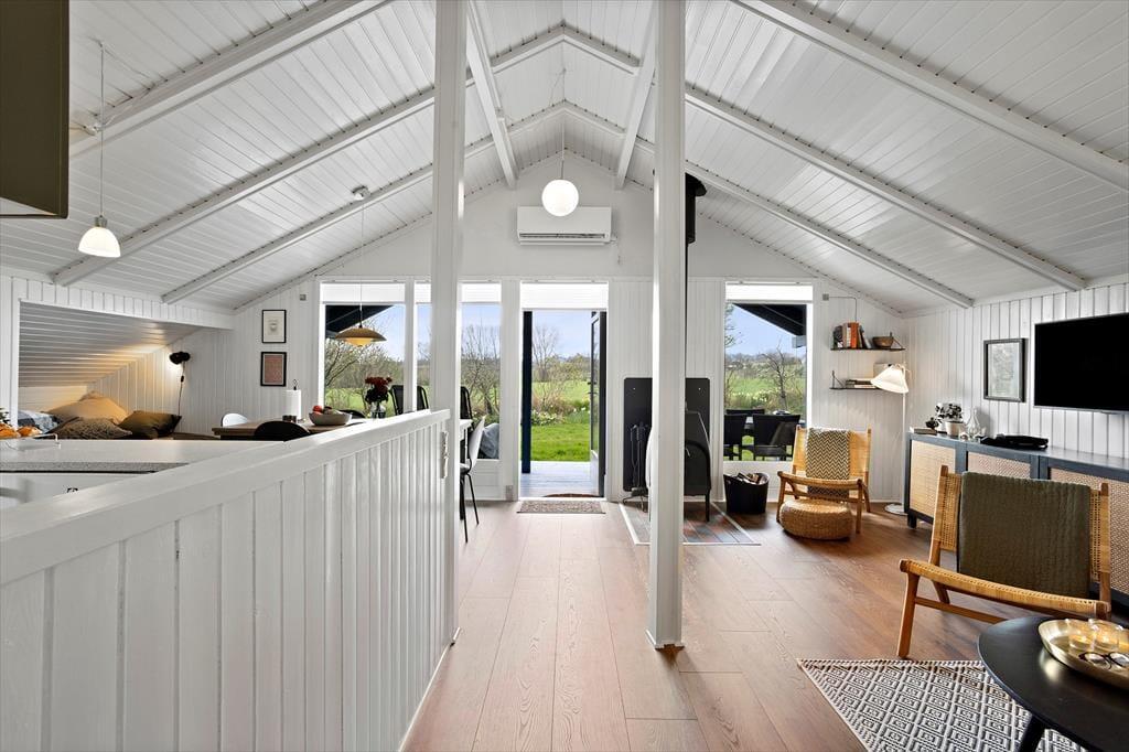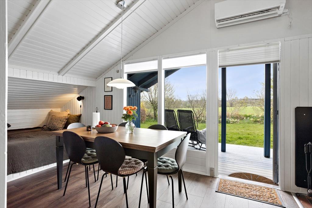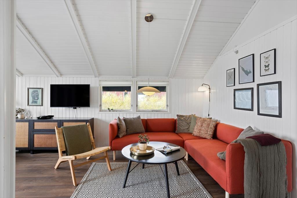 Når du træder ind i sommerhuset, bliver du mødt af en lys og indbydende atmosfære, hvor åbne rum og naturligt lys spiller en stor rolle. Den hyggelige stue, som har direkte udgang til den store terrasse, er det perfekte sted at samles med familien eller slappe af med en god bog. Stuen er rummelig og indrettet med komfortable møbler, hvor du nemt kan finde din yndlingsplads. I den åbne forbindelse til spisestuen og køkkenet skaber dette hjem en social og funktionel atmosfære, ideel til både madlavning og hyggelige middage. De to dejlige soveværelser huser 4 voksne personer, og den praktiske alkove i stuen giver god plads til både små og måske 2 ekstra personer. Badeværelset med brus tilføjer ekstra komfort til dit ophold.