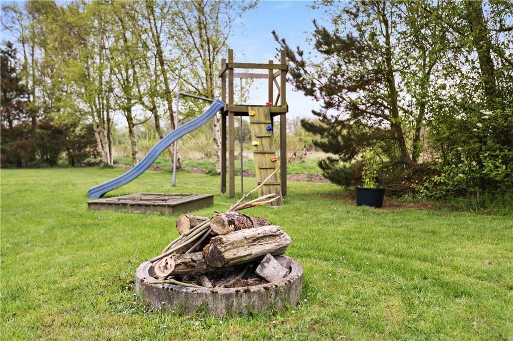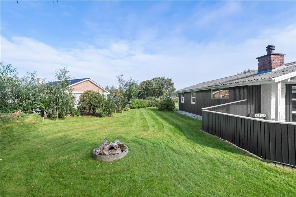 Både børn og voksne får det skønt ude i det fri på den 840 m2 store grund. Her er der nemlig en dejlig græsplæne at boltre sig på, og til de yngste er der både sandkasse og legestativ. Hele familien kan samles omkring bålstedet eller på den delvist overdækkede terrasse, der med sin sydvendte orientering ligger perfekt i forhold til solen.
