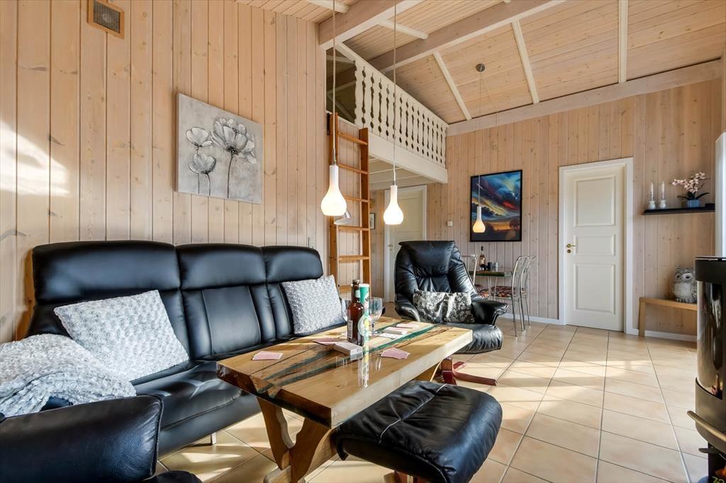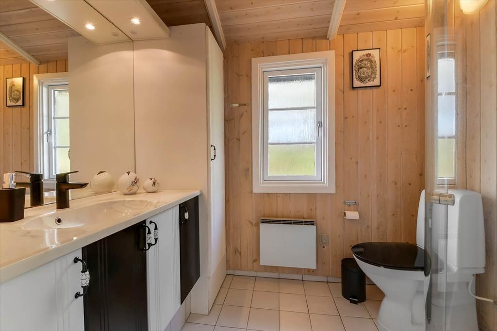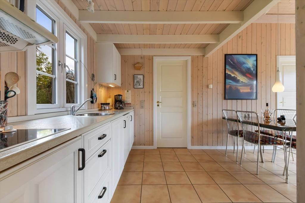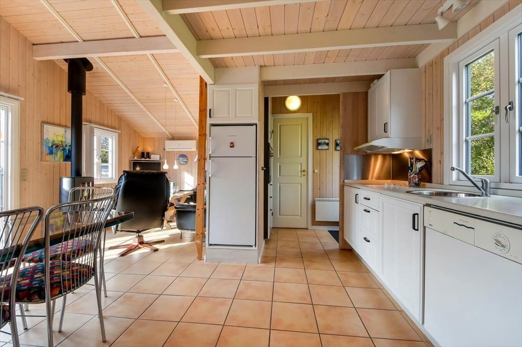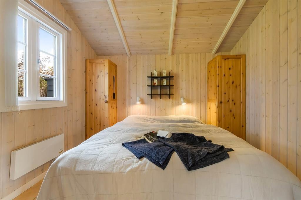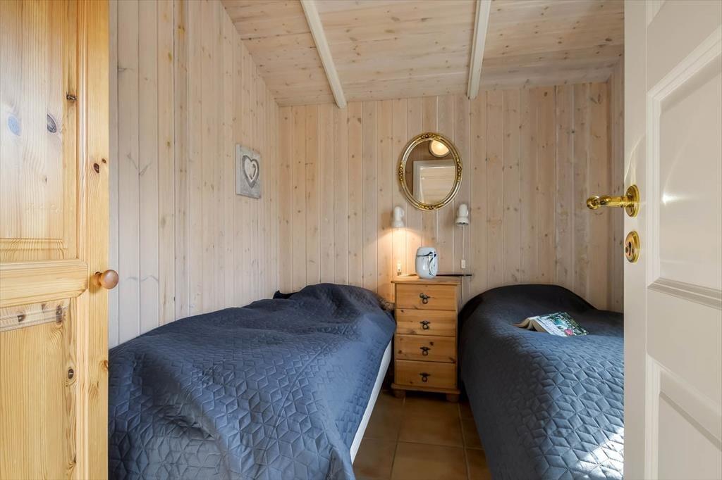 Med sine 50 m2 hører sommerhuset ikke til blandt de allerstørste, men når hver en kvadratmeter er fornuftigt udnyttet som her, er der ikke behov for flere. Indretningen er gennemtænkt, så I kan nemt og bekvemt være fire personer samlet: Det ene soveværelse er indrettet med en dobbeltseng og det andet med to enkeltsenge. Ligesom de andre rum er badeværelset pænt og funktionelt indrettet, og i opholdsrummet med åbent køkken er brændeovnen og de bløde siddemøbler nogle af de detaljer, der skruer op for hyggestemningen.