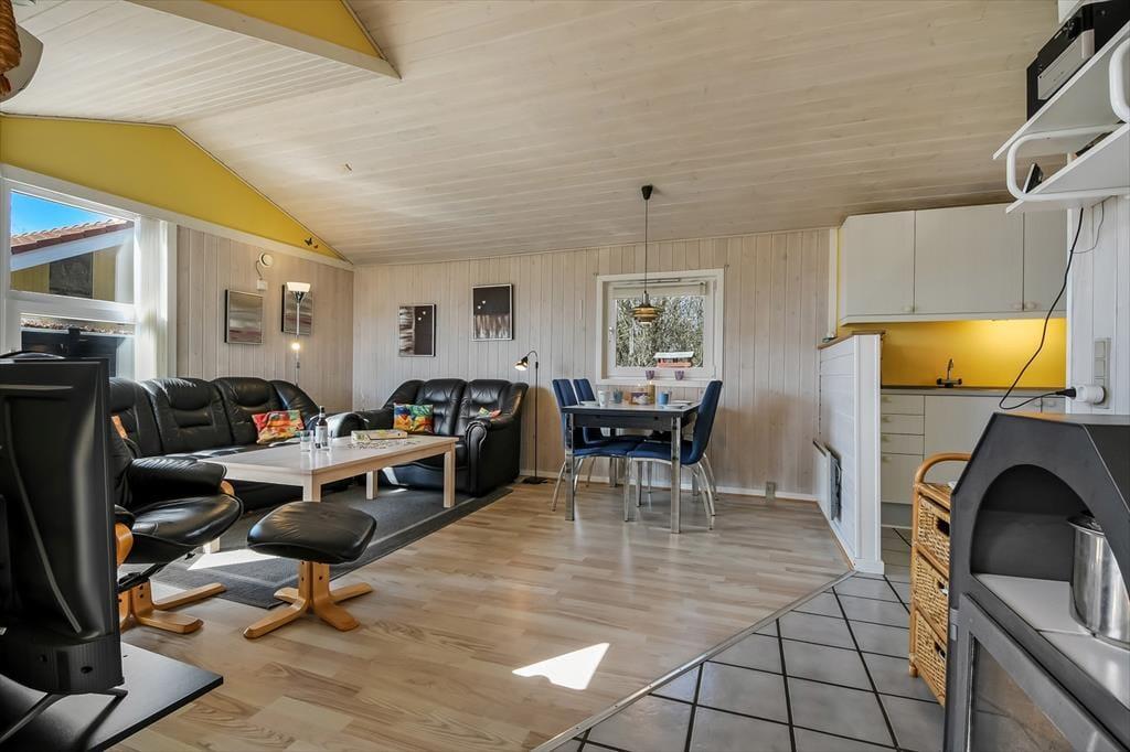 Op til seks feriegæster kan nemt og bekvemt finde sig til rette her i sommerhuset – og så er der endda mulighed for at medbringe to husdyr, hvis I gerne vil have hunden med på ferie. Alle kan samles i opholdsrummet, hvor stuen og køkkenet er forenet på velfungerende vis. Den åbne forbindelse betyder, at I stadig kan deltage i hyggesnakken, selvom I skal se til lasagnen i ovnen eller skære salat til aftensmaden, og i hele rummet får I glæde af varmen og skæret fra ilden i den effektive brændeovn. Det funktionelle badeværelse byder blandt andet på en vaskemaskine og en muret bruseniche, mens de to soveværelser er udstyret med henholdsvis en dobbeltseng og en dobbelt sovesofa. Kravler I op på hemsen, finder I yderligere to sengepladser i form af to madrasser.