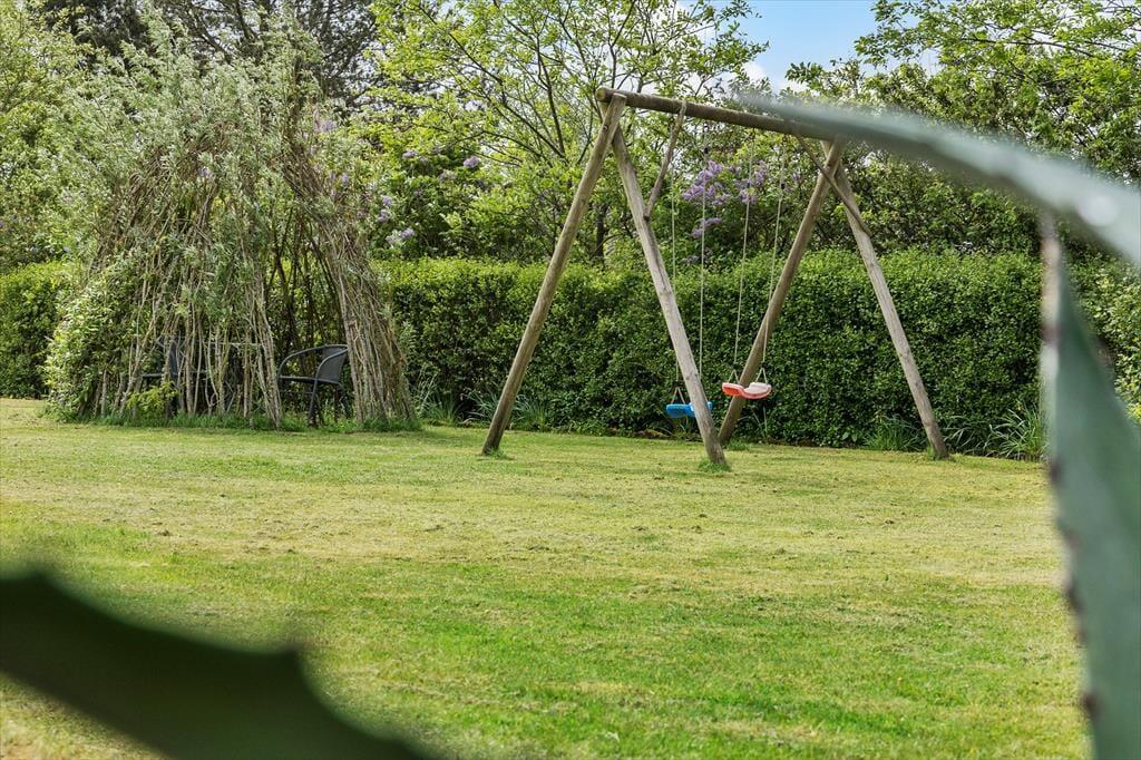 Også udenfor er der masser af muligheder for aktiviteter og hygge. Huset har en dejlig og lys udestue, der kan bruges uanset årstid, samt to terrasser med alt, hvad der skal bruges af havemøbler. I den store have er der også masser af plads til f.eks. boldspil eller andet leg, og her er også et gyngestativ og en lille hyggespot, perfekt til en god bog eller et godt glas vin. Når det bliver mørkt, kan I hygge jer ved den udendørs pejs.