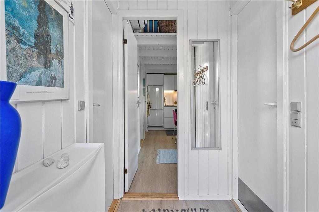 Fjordudsigten kan I også nyde inden døre, for førstesalens stue er nemlig udstyret med et stort, vestvendt vinduesparti. En brændeovn er med til at skrue op for hyggestemningen i stuen. I stueplan er der kommet moderne forbedringer til, for køkken-alrummets køkkenelementer og hvidevarer er nye, og der er også lagt nyt gulv i stueetagen og på første sal. Et badeværelse og tre små soveværelser med i alt seks sengepladser - to dobbeltsenge og en køjeseng -hører for øvrigt med til stueetagens praktiske planløsning.