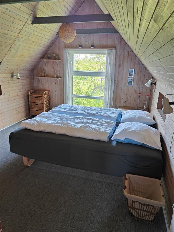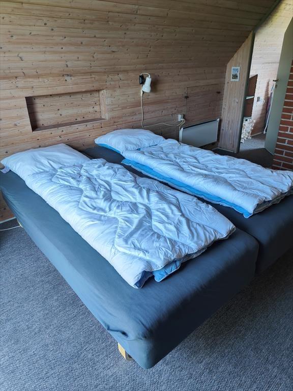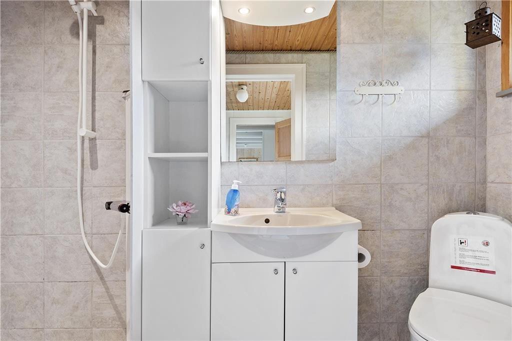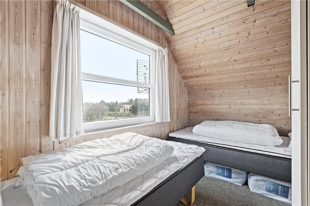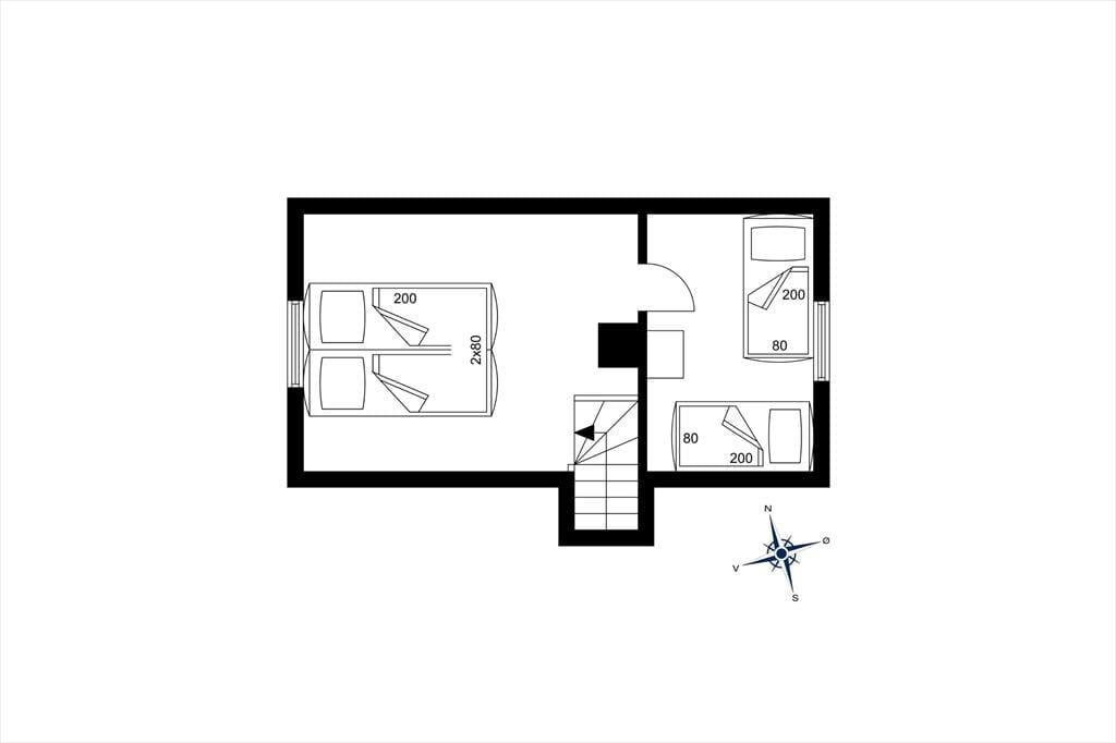 På grunden lyser sommerhuset op med sin gule facade og sine hvide vinduesrammer. Inden døre kan I brede jer på 72 m² fordelt på to etager, og både stueplan og førstesalen er indrettet på hyggelig og komfortabel vis. Lyse trælister på væggene, markante loftsbjælker og en brændeovn er noget af det, der skaber en rar atmosfære i stueplanets opholdsrum, hvor køkken og stue er forenet. En entré med vaskemaskine og et badeværelse finder I også her på etagen foruden et soveværelse med to enkeltsenge. Tager I trappen ovenpå, kommer I til endnu to soveværelser, et med to enkeltsenge og et med en dobbeltseng.