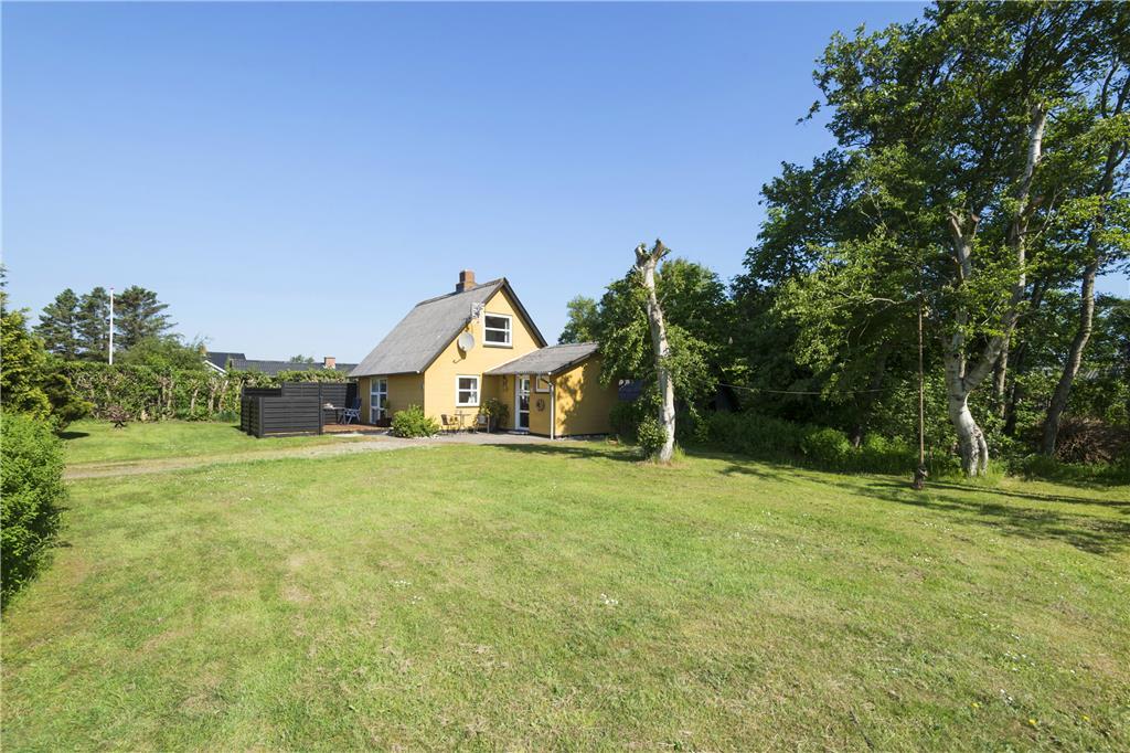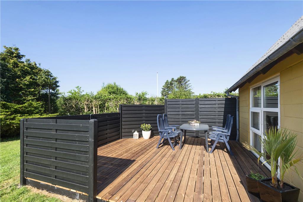 Havens sydvendte træterrasse er skærmet af læhegn til flere sider, så det er en herlig oase på en solrig dag eller en lys sommeraften. Trænger I til skygge, kan I finde parasollen frem, inden I dækker op til frokost i det fri, og når måltidet er færdigt, er der masser af plads til at lege og spille havespil på den store græsplæne.
