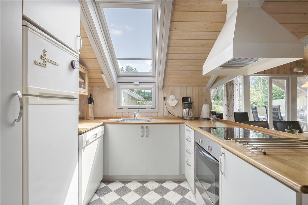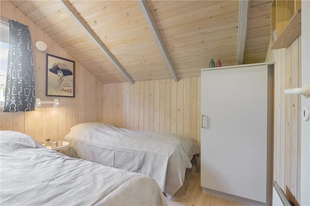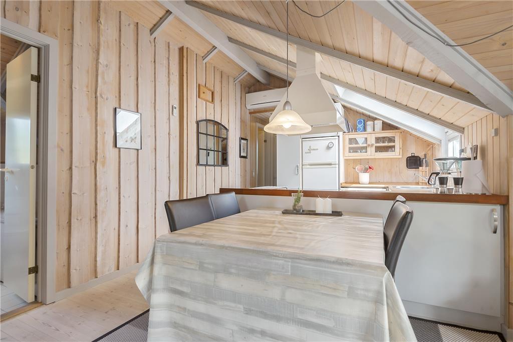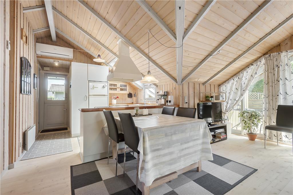 De lyse trælister på væggene og skrå lofter med ovenlysvinduer er noget af det, der understreger den hyggelige atmosfære inden døre i sommerhuset. Interiøret er holdt i neddæmpede farver, ikke bare på de to soveværelser, men også i stuen og det integrerede køkken. På grund af den åbne planløsning kan I nyde tiden sammen, selvom aftensmaden skal forberedes – og efter et lækkert måltid, kan I alle sætte jer over i sofaafdelingen, hvor I kan nyde varmen og det gyldne skær fra den tændte brændeovn. En anden form for hyggelig selvforkælelse er at tage en tur i saunaen eller slappe af i spabadet, der ligger som del af husets velindrettede badeværelse.