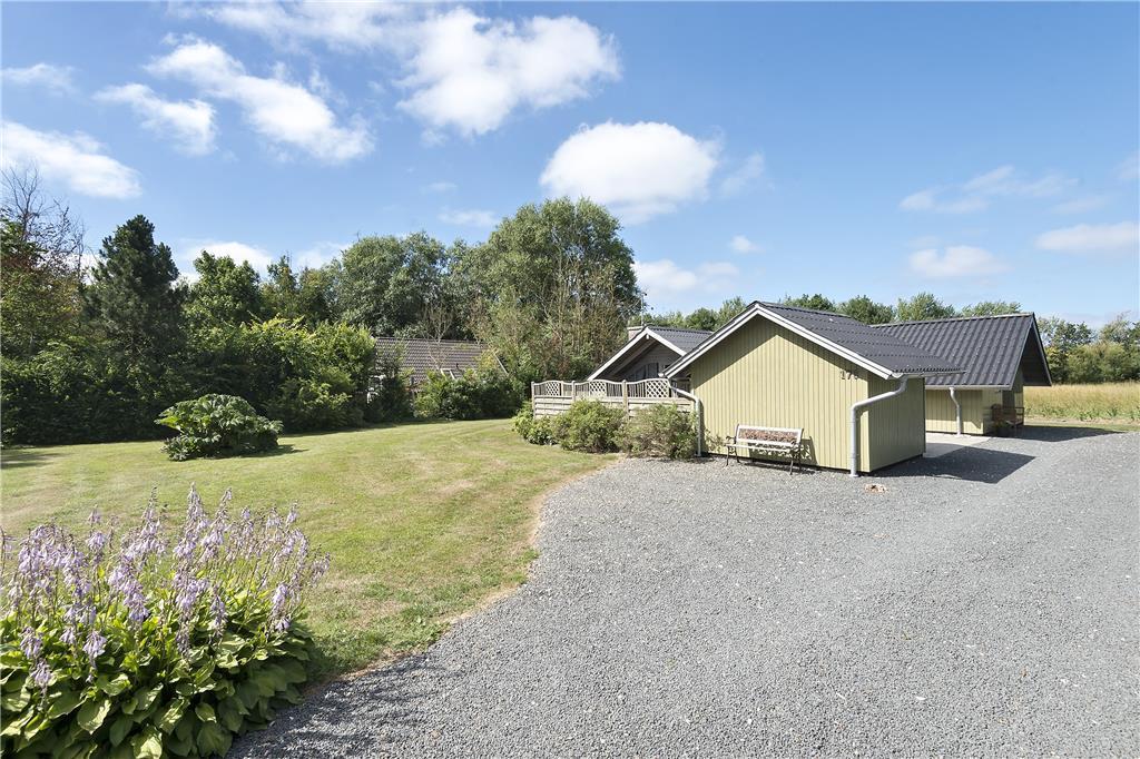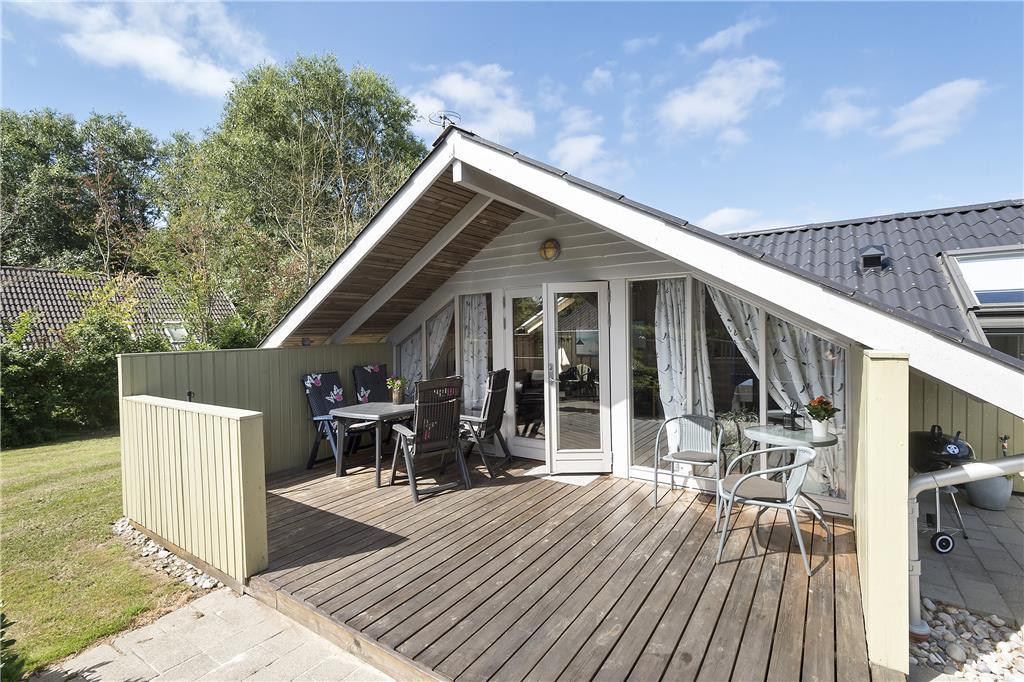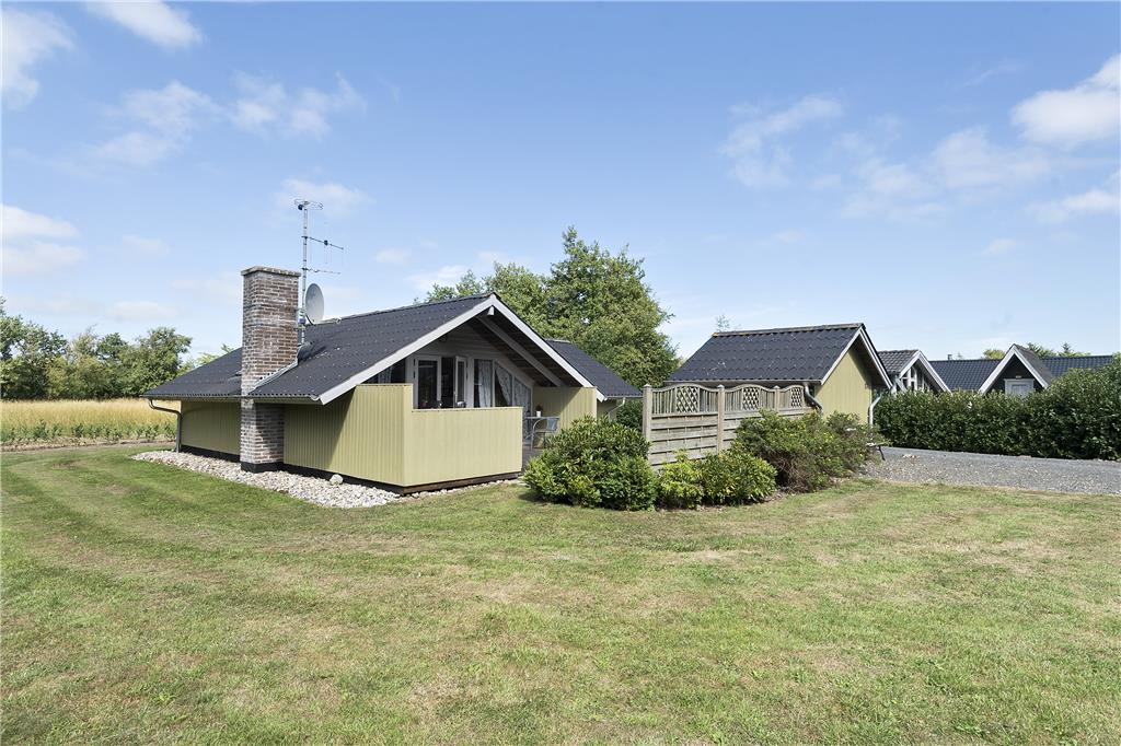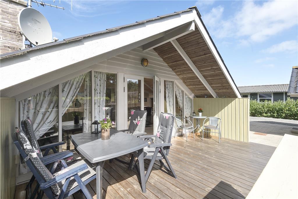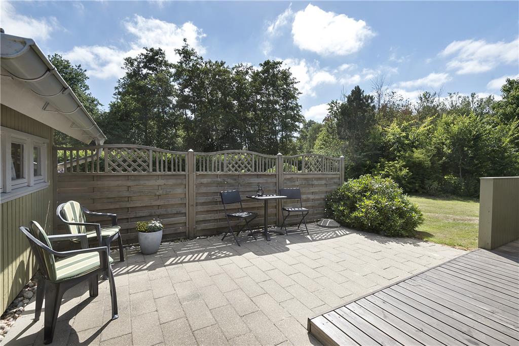 Syd for sommerhuset finder I et stort og delvist overdækket terrassemiljø med havemøbler, grill og parasol. Læhegn skærmer terrassen af, så det er nemt at finde en ugeneret solkrog, og alternativt kan I rykke ud på den store græsplæne, hvor der er masser af plads til at slænge sig på et tæppe.
