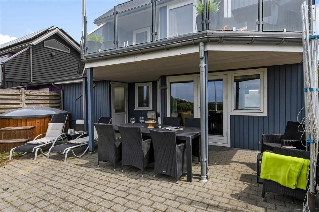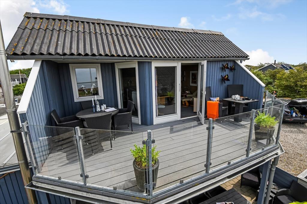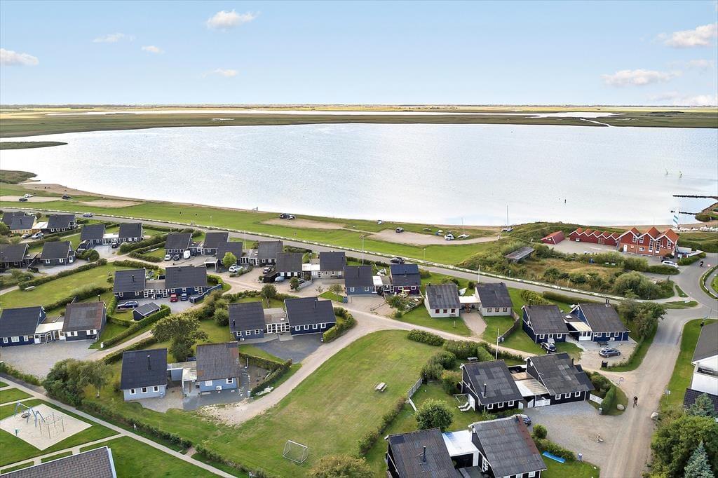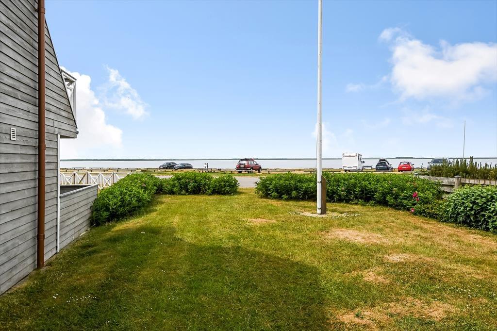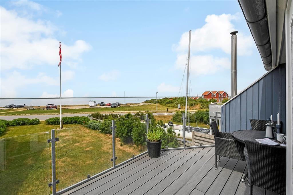 Hvis I holder af at tilbringe feriedagene nær vand og åbne vidder, er det oplagt at kigge nærmere på dette hyggelige feriehus. Det er nemlig placeret bare 50 meter fra Ringkøbing Fjord og Bork Havns populære surfstrand, og fordi det ligger i første parket, kan I tilmed nyde fjordudsigten fra både huset og altanen.