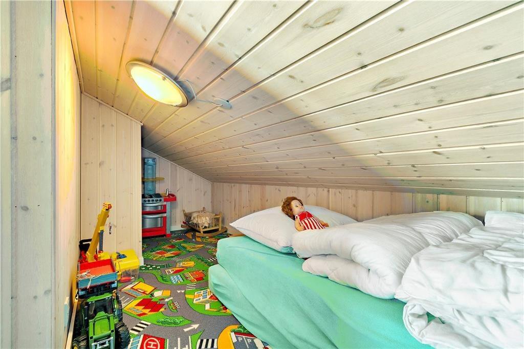 Feriehuset har ligget på denne attraktive adresse siden 1978, hvor det blev opført som en funktionel feriebolig i to plan. Siden er der sket en del inden døre, for huset er nemlig renoveret i 2012 og opdateret med moderne bekvemmeligheder –inklusiv wi-fi, vaskemaskine og varmepumpe med køl. Førstesalens altan er desuden blevet udstyret med glasafskærmning, så når I sidder inden døre i stuen, er der intet, der forstyrrer den fine fjordudsigt. I stuen er den ene af de to alkover indrettet som et legehjørne til børnene, mens den anden alkove fungerer som sengeplads til to personer, og i stueplan er der derudover plads til fire feriegæster i dobbeltsengene på to soveværelser. Et pænt badeværelse og et rummeligt spisekøkken med brændeovn ligger også her, og fra entréen har I direkte adgang til en lille, østvendt havestue.