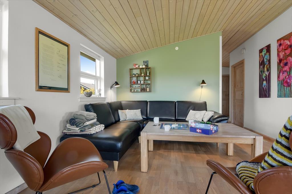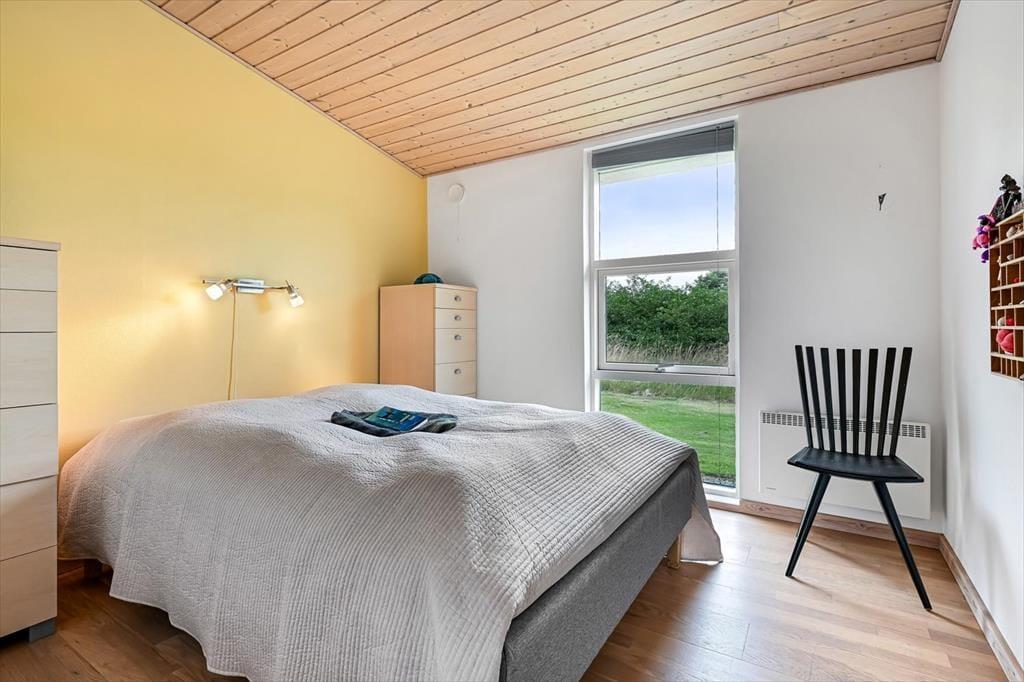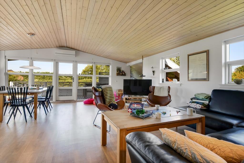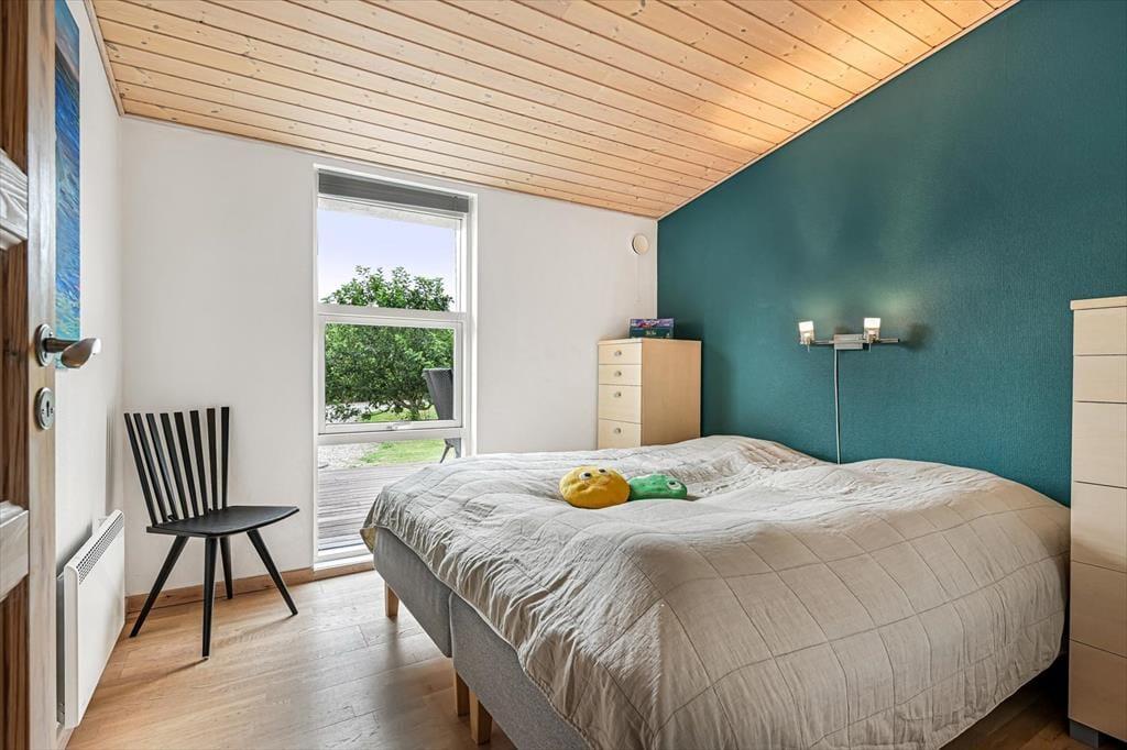 Dagslyset strømmer ind i sommerhusets flot indrettede rum – ikke mindst i den store opholdsafdeling, som er udstyret med panoramavinduer. Både her og i de øvrige rum, der inkluderer tre soveværelser, et badeværelse og et bryggers med vaskesøjle, er det tydeligt at se, at der er lagt vægt på at skabe en både hyggelig og funktionel feriebolig: På badeværelset og i bryggerset er der gulvvarme, og alle soveværelser er indrettet med komfortable dobbeltsenge, og der er for øvrigt både barneseng, høj stol og legetøj til de mindste feriegæster. En alkove i stuen kan bruges som en ekstra topersoners sengeplads ved nattetid, og i løbet af dagen fungerer den som en dejlig legekrog til børnene. Stuens komfortable møbler, TV og brændeovn lægger op til tilbagelænet afslapning og ren nydelse, og takket være den åbne forbindelse til det veludstyrede køkken kan madlavningen også nemt blive et fælles hyggeprojekt.