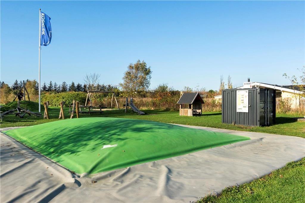 Ferieforholdene er tilsvarende glimrende ude i det fri på den 1300 m2 store grund. Her er der masser af plads til at løbe og lege på græsplænen – og hvis det alligevel ikke rækker, ligger sommerhuset stort set lige overfor en god legeplads med hoppepude, gynger og meget mere. Solbadning og grillmiddage kan foregå på den herlige, delvist overdækkede træterrasse, der breder sig på husets sydlige og vestlige sider.