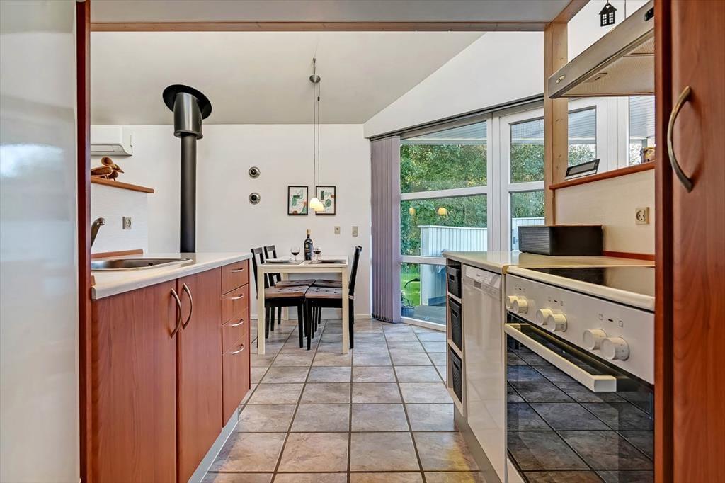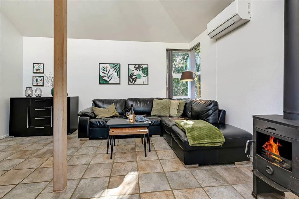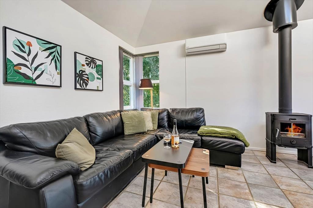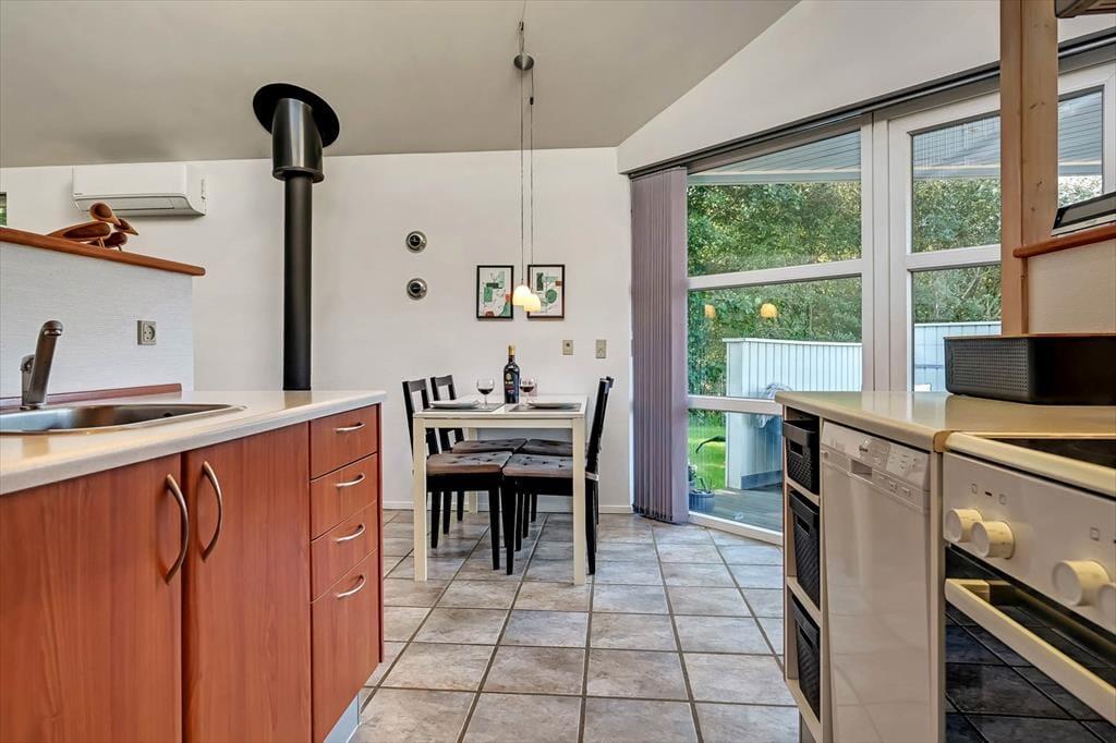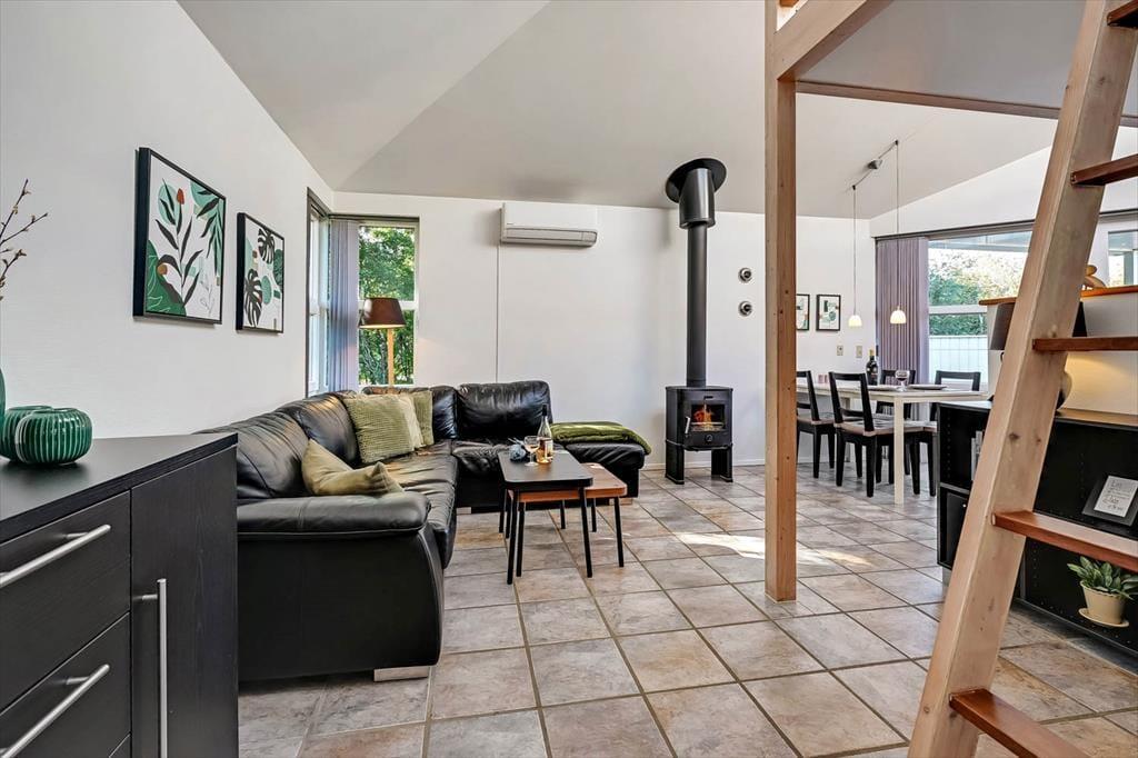 Feriehuset fra 2003 fremstår stadig morderne, det takket være grundig pleje og ordentligt vedligehold. Stilfuld indretning præger alle rum – også badeværelset og de to soveværelser, der er indrettet med henholdsvis en dobbeltseng og to enkeltsenge. Det mest bemærkelsesværdige rum er dog stuen, for den byder på en original indretning med åben køkkenafdeling, hems og skrå lofter, der går op til et rytterlys helt i toppen. Takket være den åbne planløsning får I glæde af ovenlyset, når I sidder i stuen nær brændeovnen, og hvis I lægger jer i hemsens niche med madrasser om aftenen, har I fri udsigt til stjernehimlen. Blandt de mere praktiske detaljer har I desuden adgang til et lille bryggers med vaskemaskine samt ekstra fryser og køleskab.